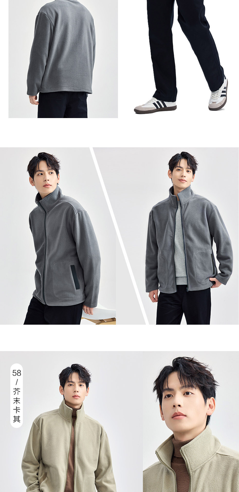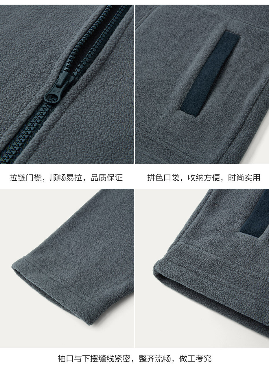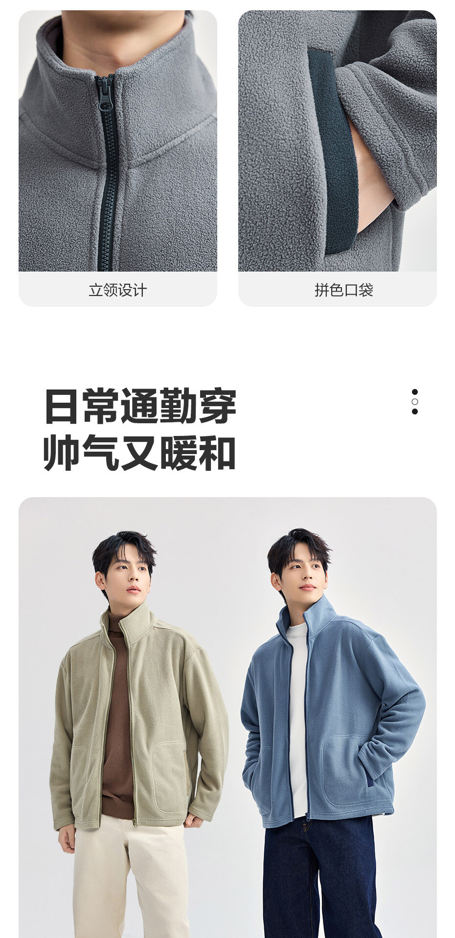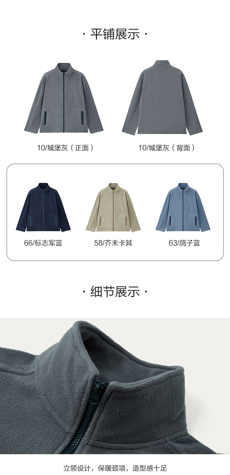 摇粒绒面料,柔软温暖;立领设计,保暖颈项,造型感十足;拉链门襟,顺畅易拉,品质保证;拼色口袋,收纳方便,时尚实用。