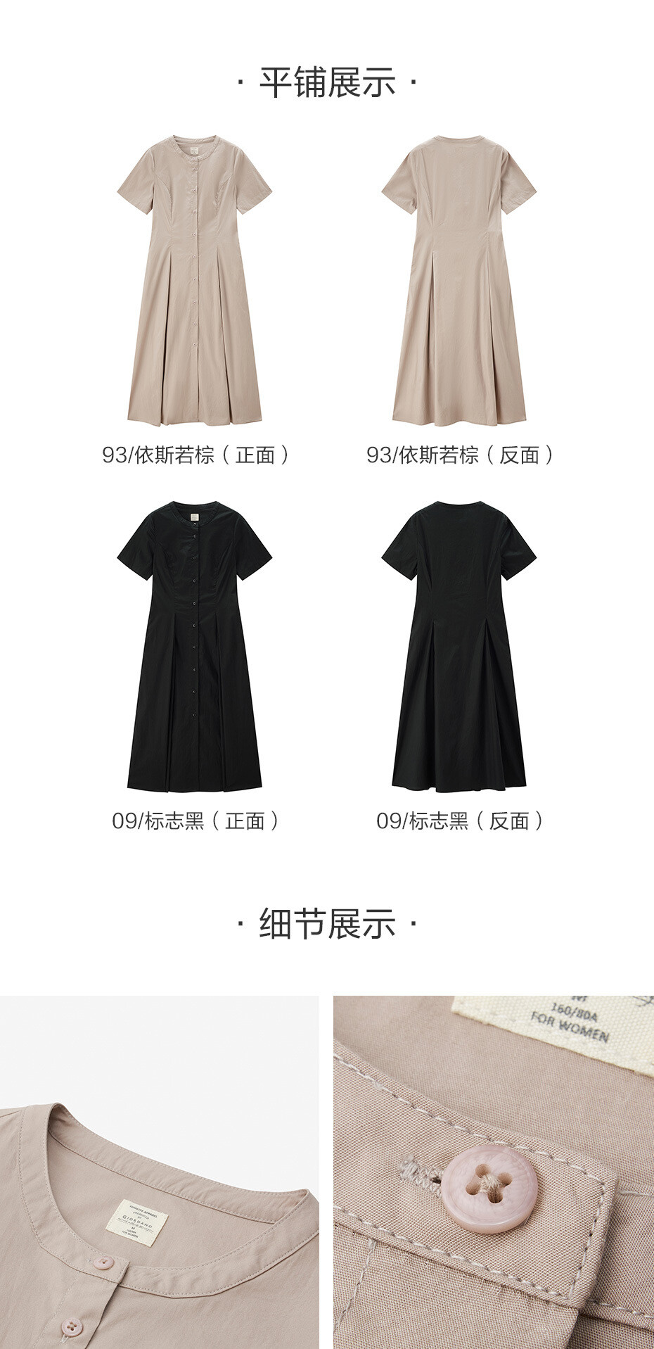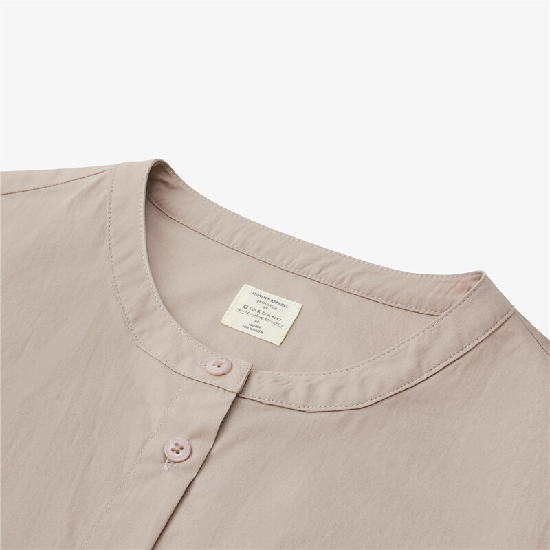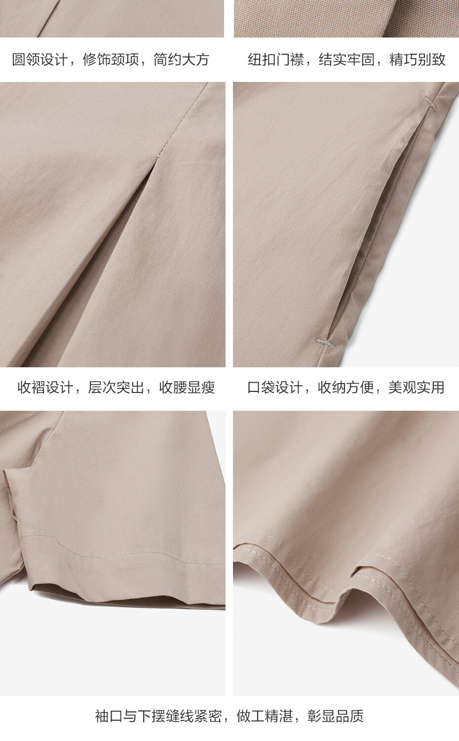 100%棉面料,质感细腻,舒适耐穿;圆领设计,修饰颈项,简约大方;纽扣门襟,结实牢固,穿脱方便;收褶设计,层次突出,收腰显瘦。