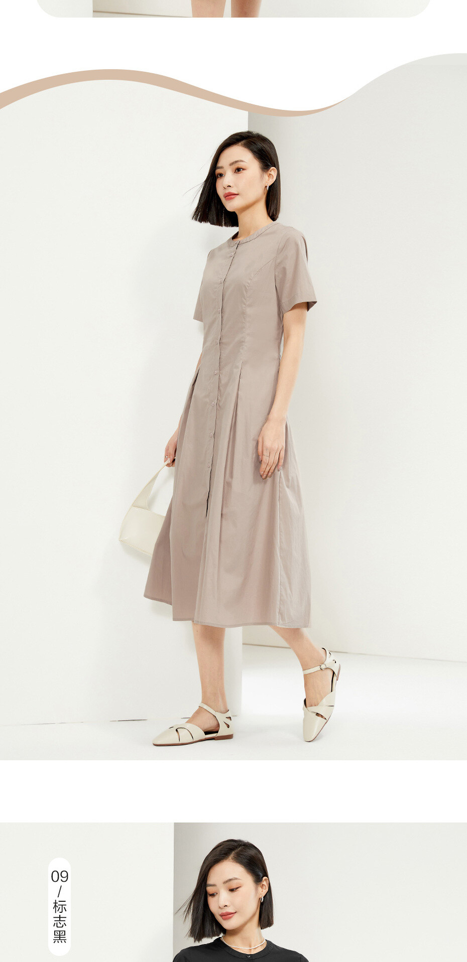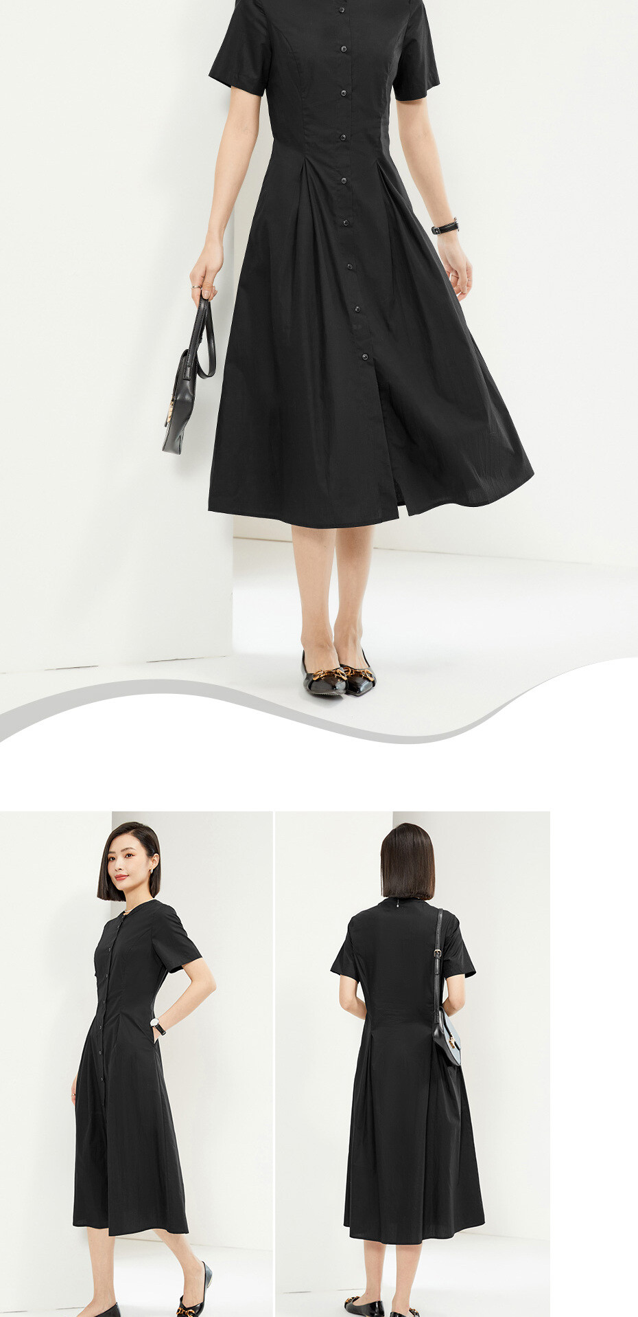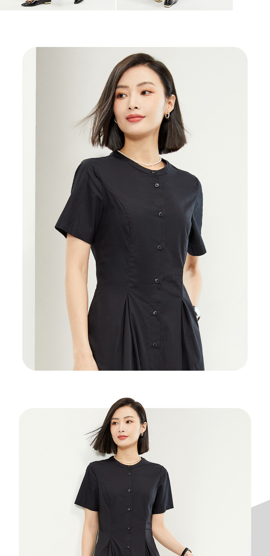 100%棉面料,质感细腻,舒适耐穿;圆领设计,修饰颈项,简约大方;纽扣门襟,结实牢固,穿脱方便;收褶设计,层次突出,收腰显瘦。