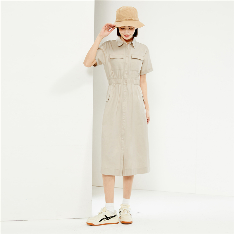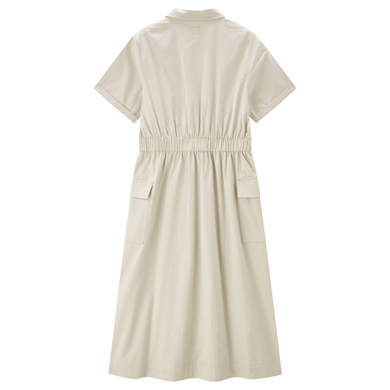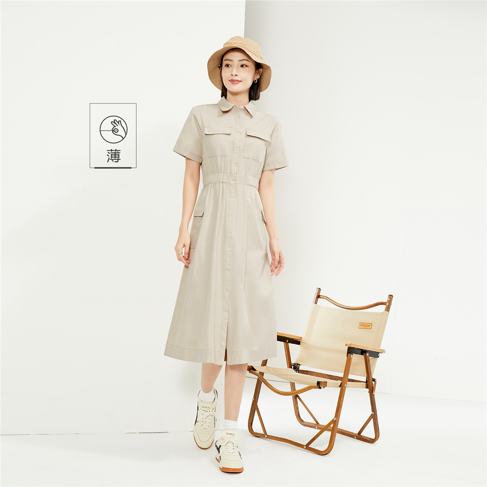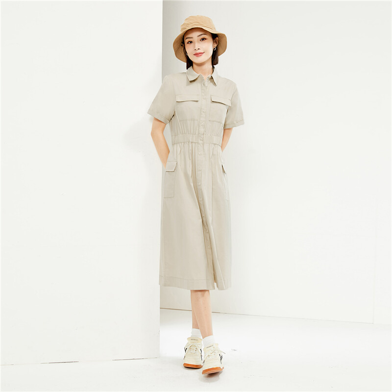纯棉梭织工装口袋收腰薄衬衫连衣裙