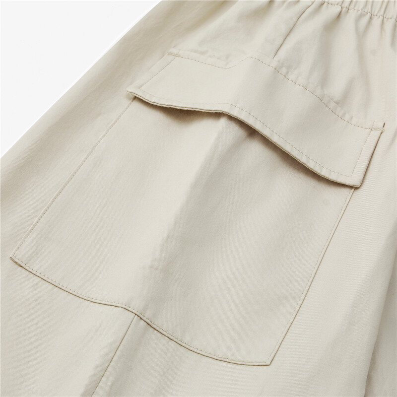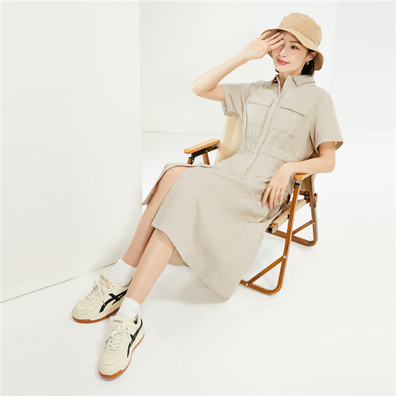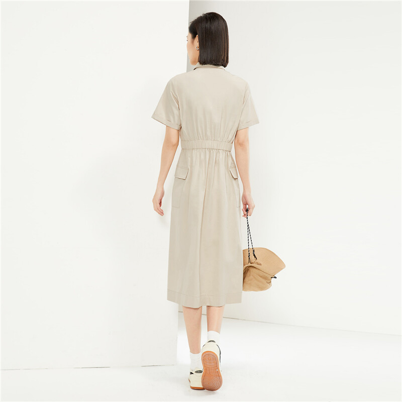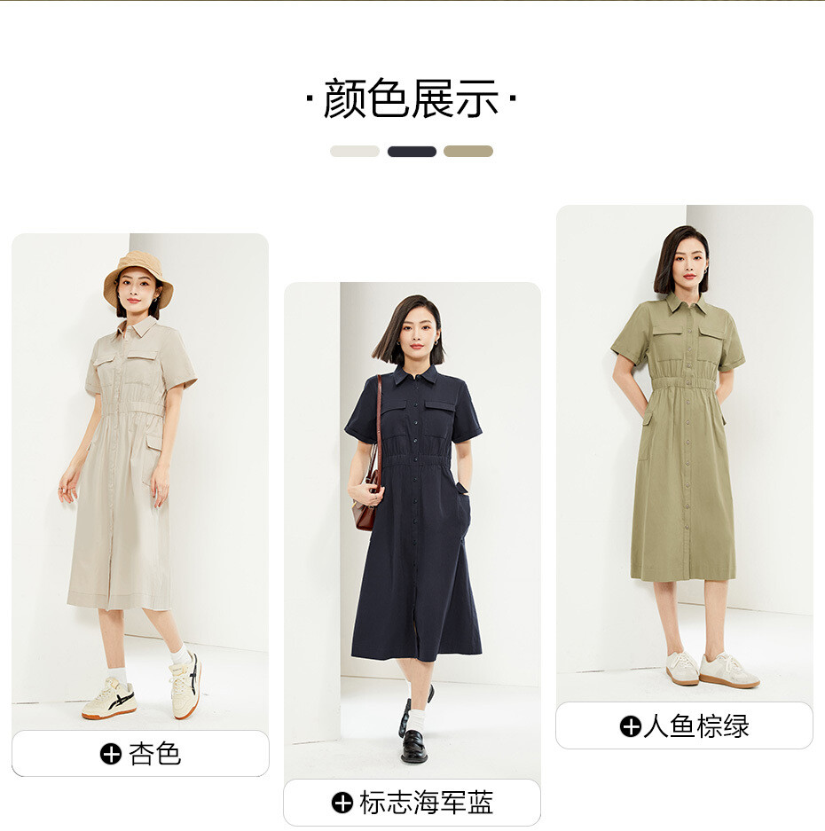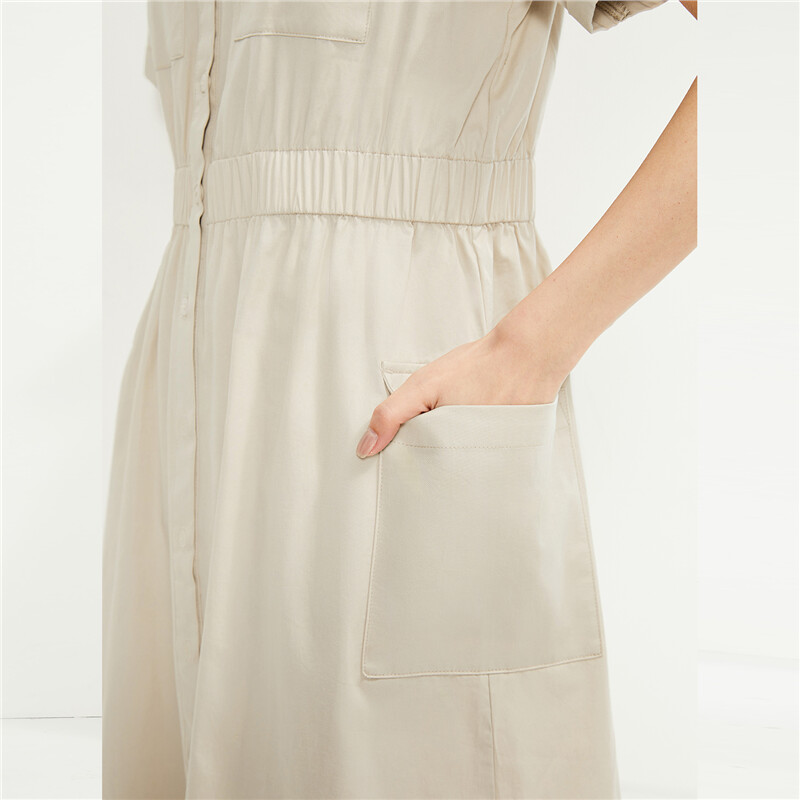 纯棉梭织工装口袋收腰薄衬衫连衣裙