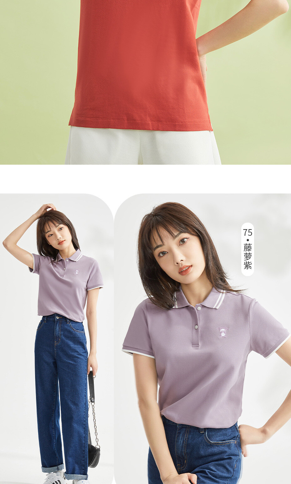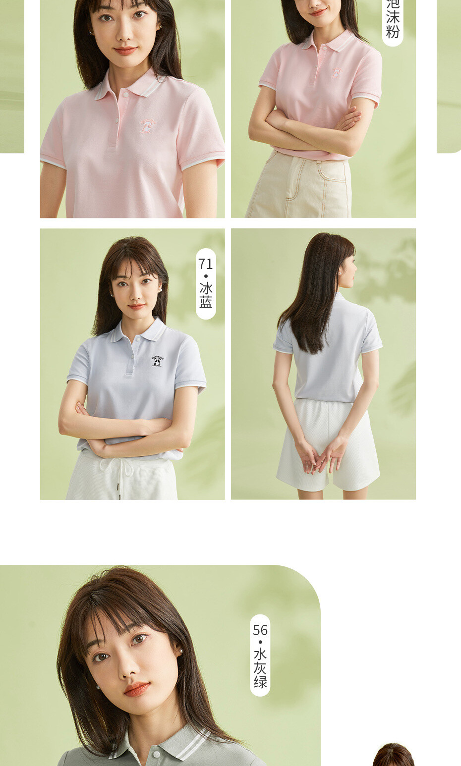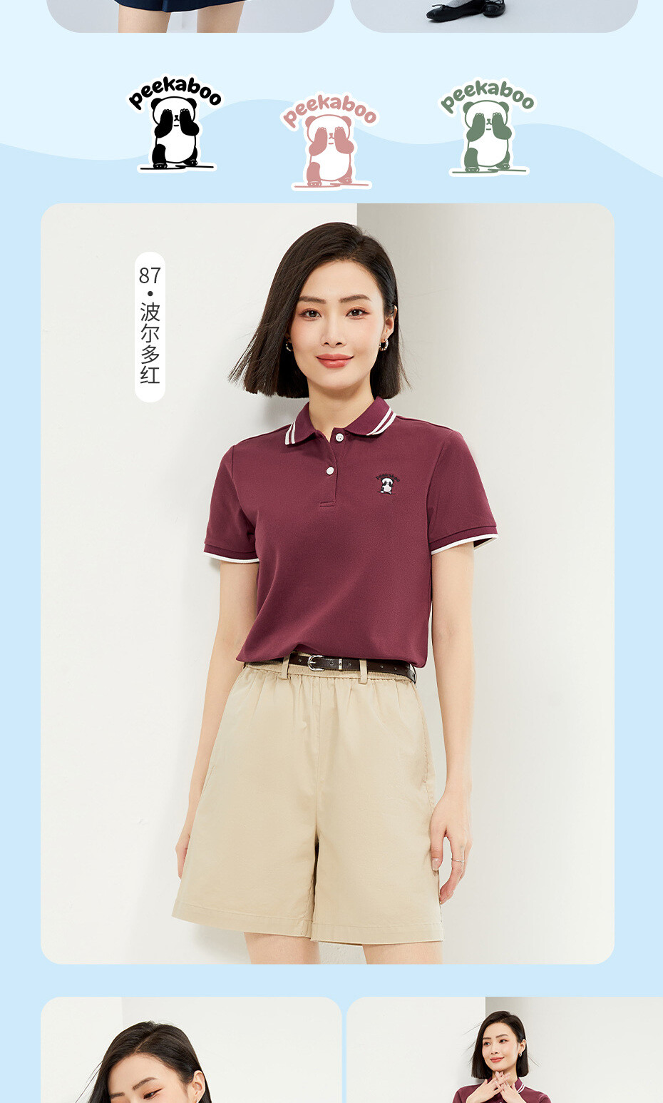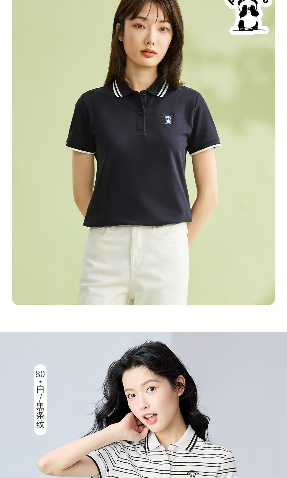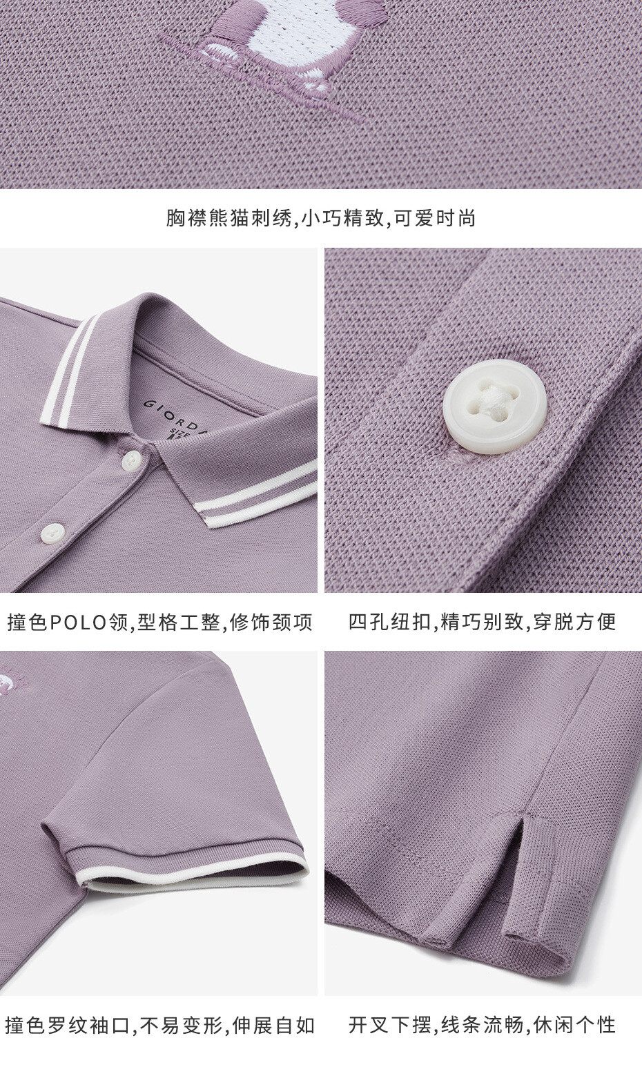 莱卡棉珠地布,质感细腻,富有弹性;撞色POLO领,型格工整,修饰颈项;罗纹袖口,不易变形,伸展自如;胸襟熊猫刺绣,小巧精致,可爱时尚。温馨提示:由于批次不同,此款25色、75色领标、纽扣颜色存在差异;不影响品质与舒适度,请放心选购。