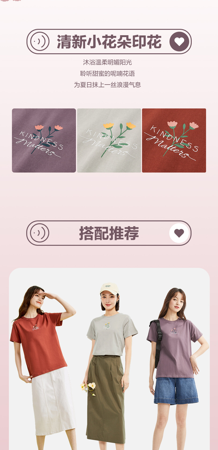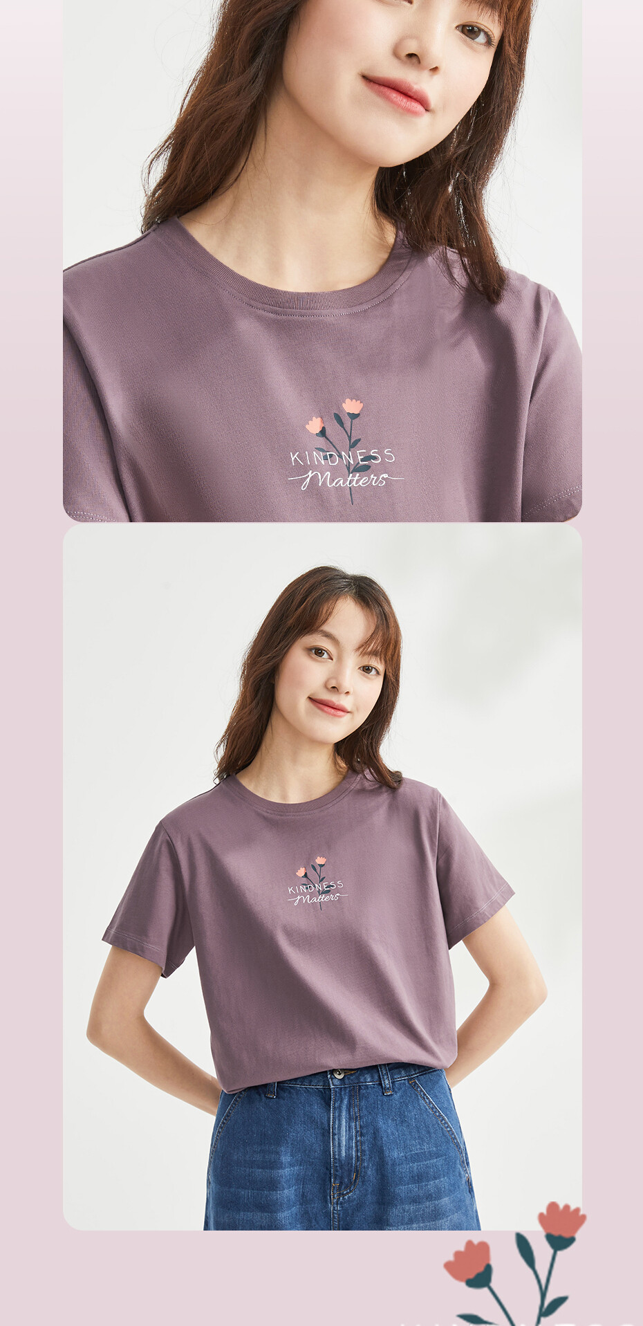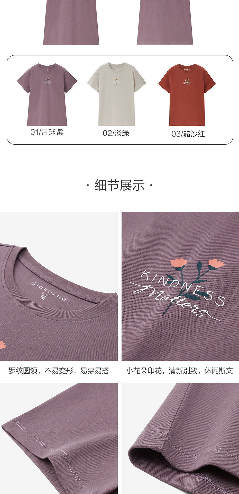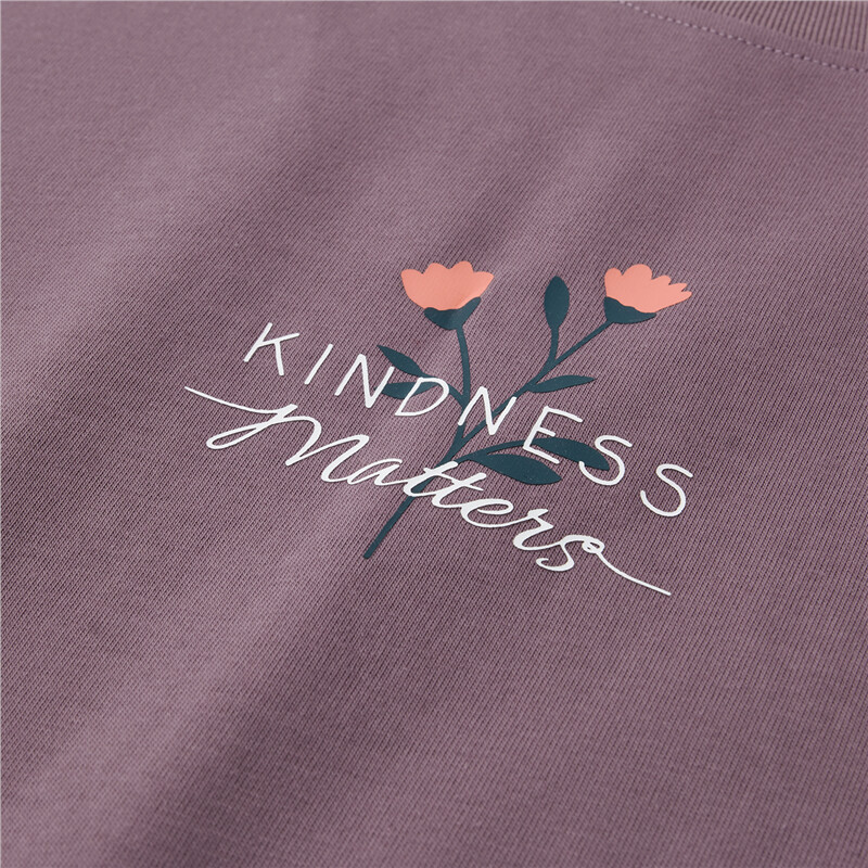 100%棉面料,质感细腻,舒适耐穿;罗纹圆领,不易变形,易穿易搭;小花朵印花,清新别致,休闲斯文。