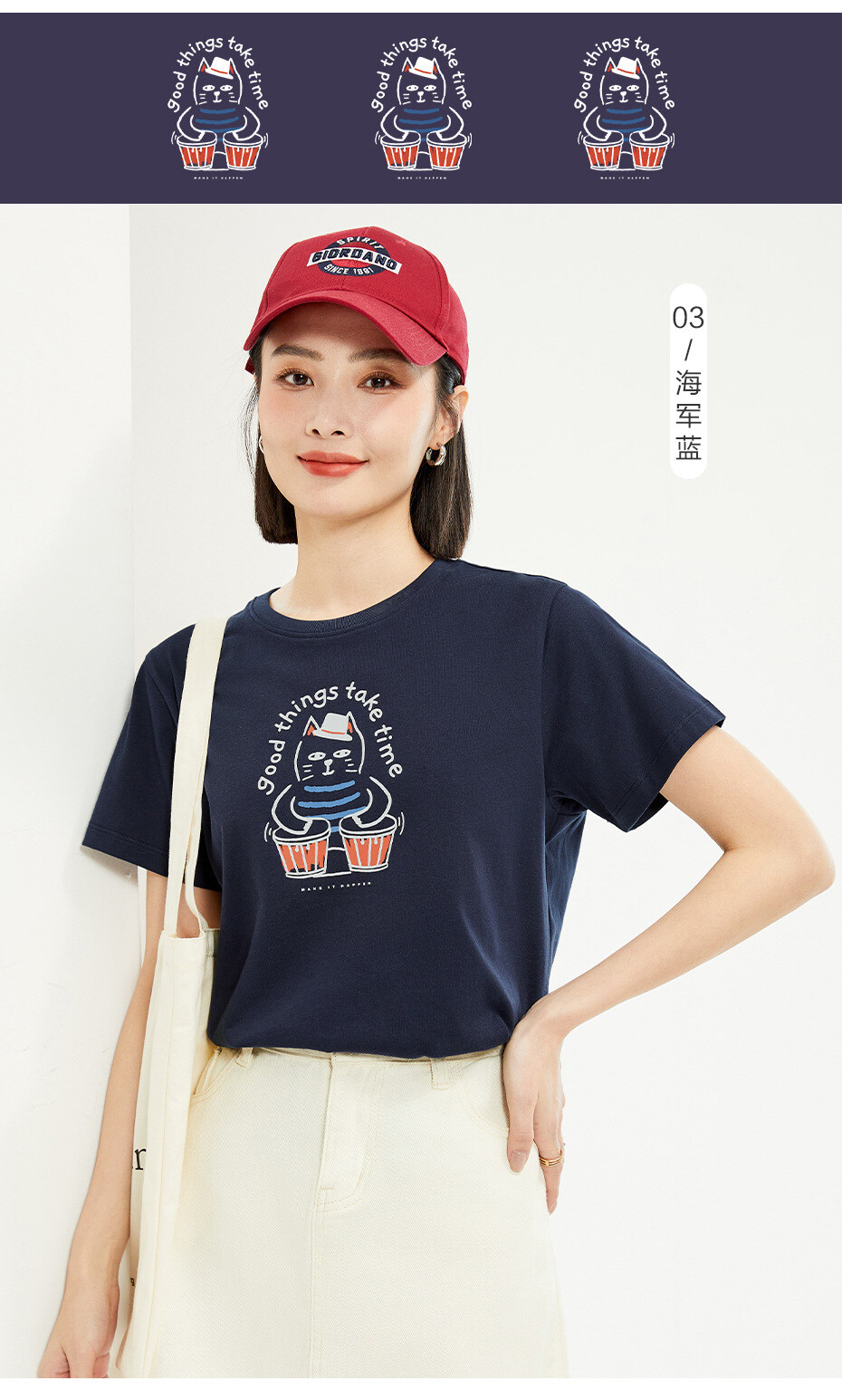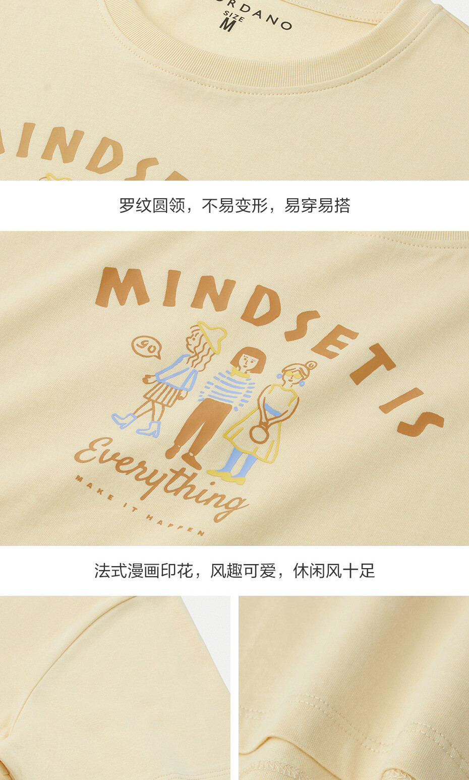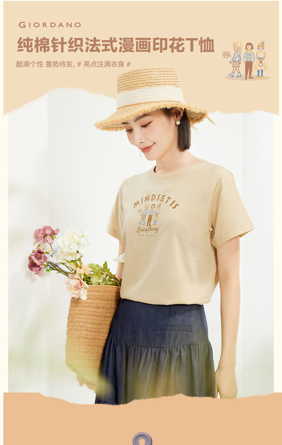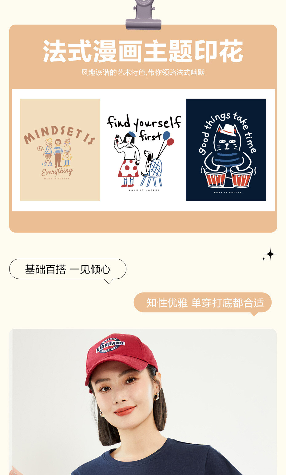 100%棉面料,质感细腻,舒适耐穿;罗纹圆领,不易变形,易穿易搭;法式漫画印花,风趣可爱,休闲风十足。