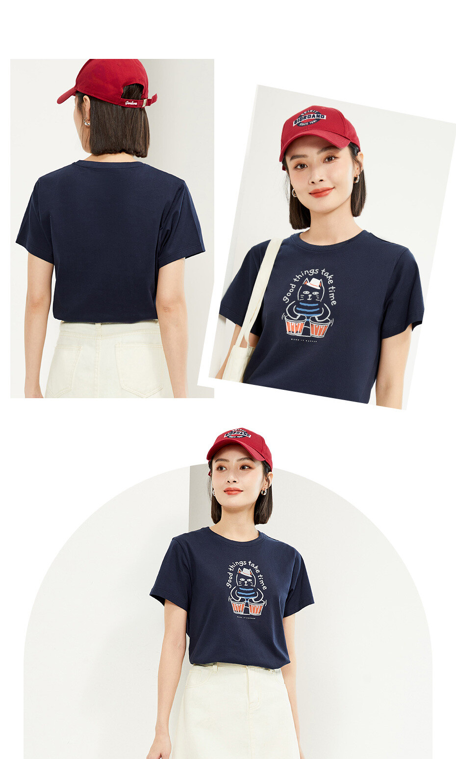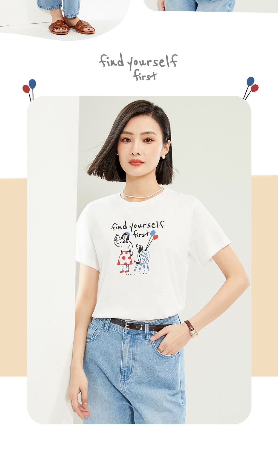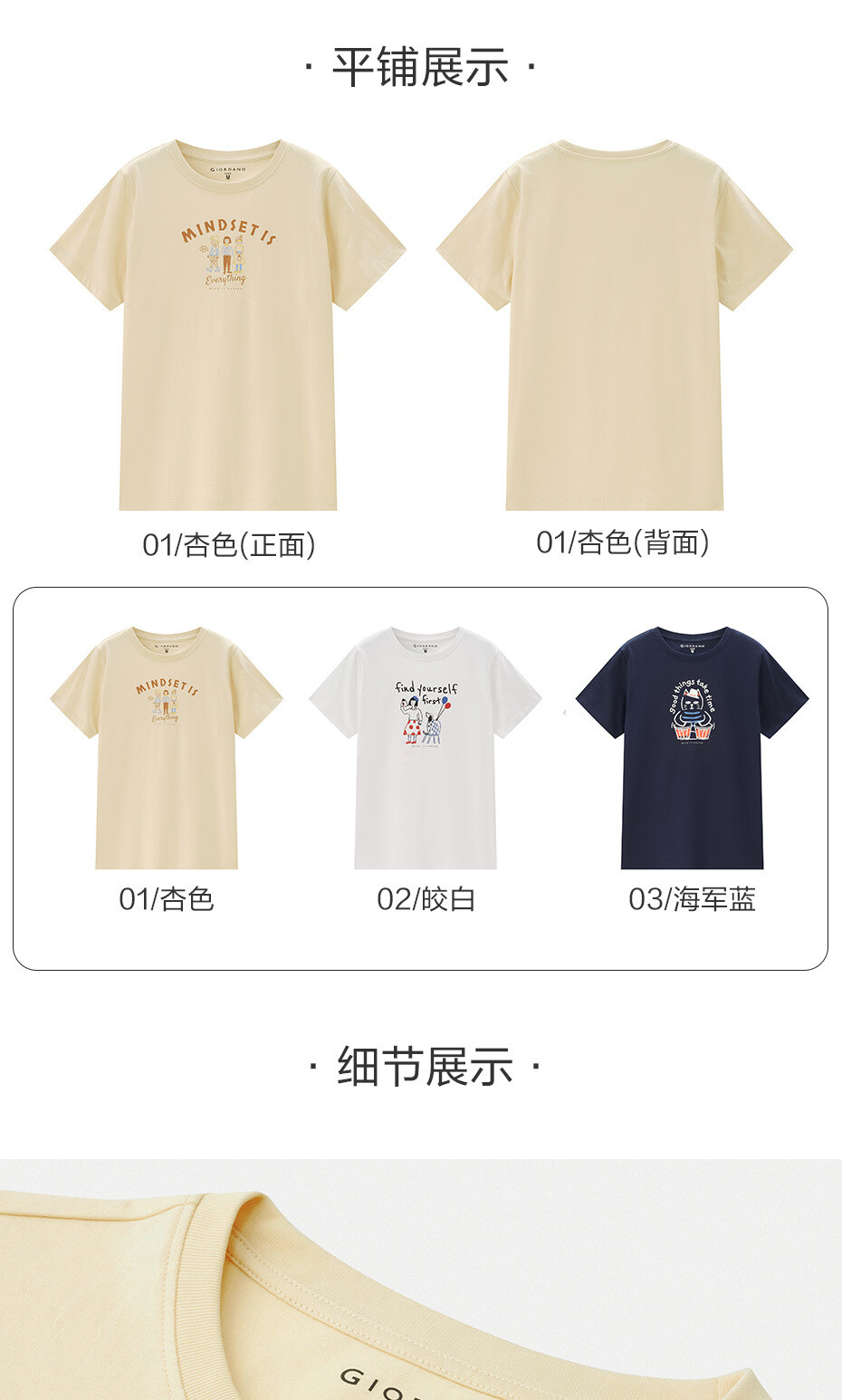 100%棉面料,质感细腻,舒适耐穿;罗纹圆领,不易变形,易穿易搭;法式漫画印花,风趣可爱,休闲风十足。