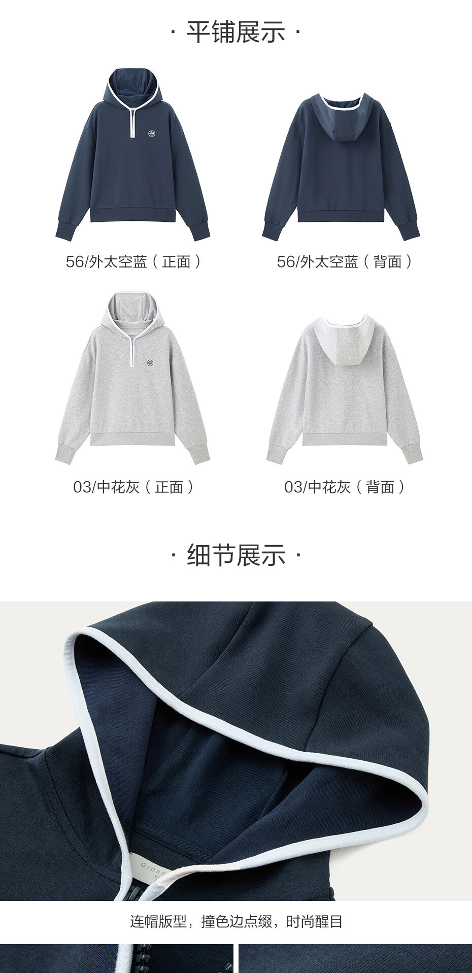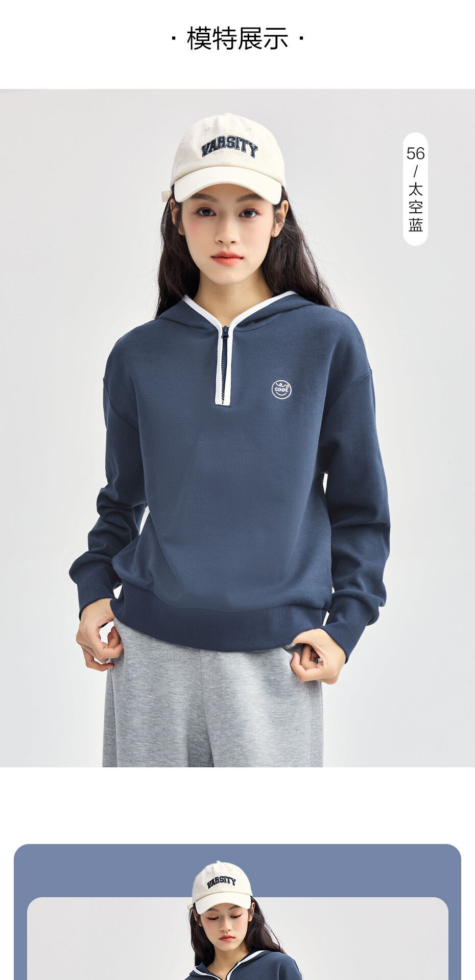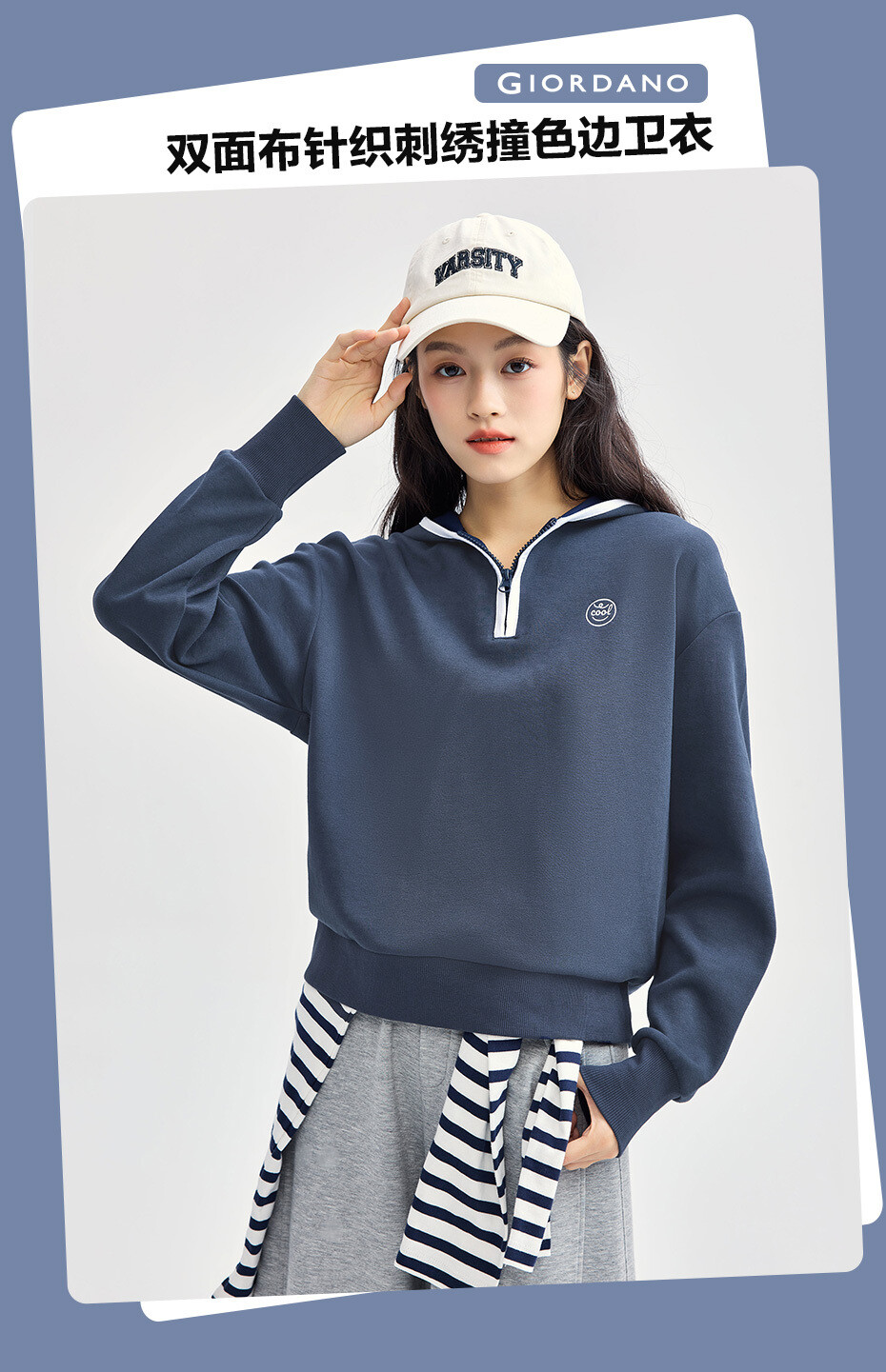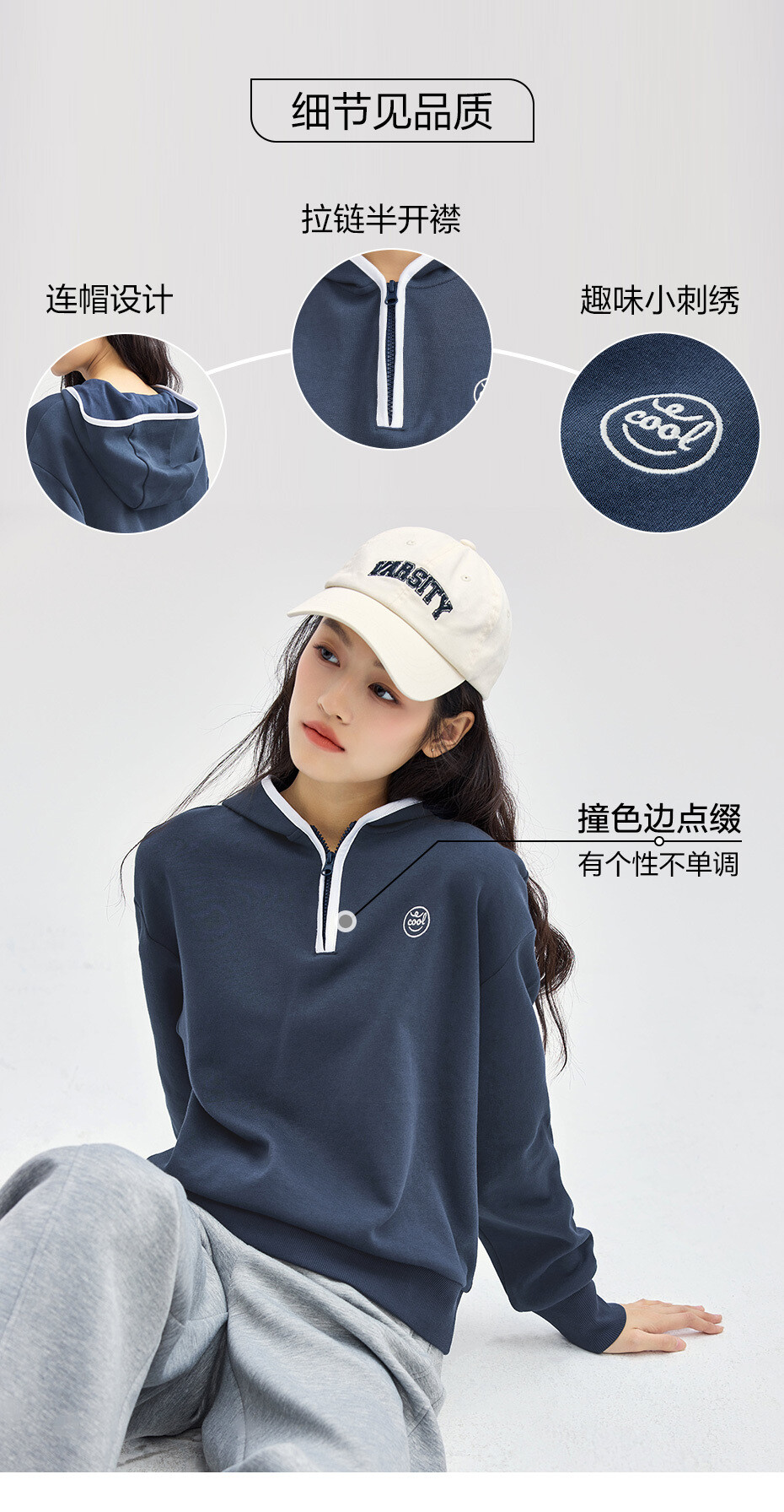 刺绣撞色边连帽半开胸双面布针织卫衣