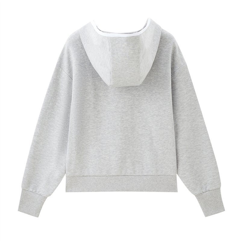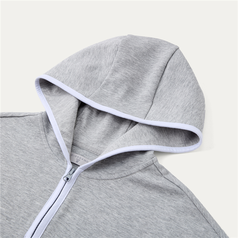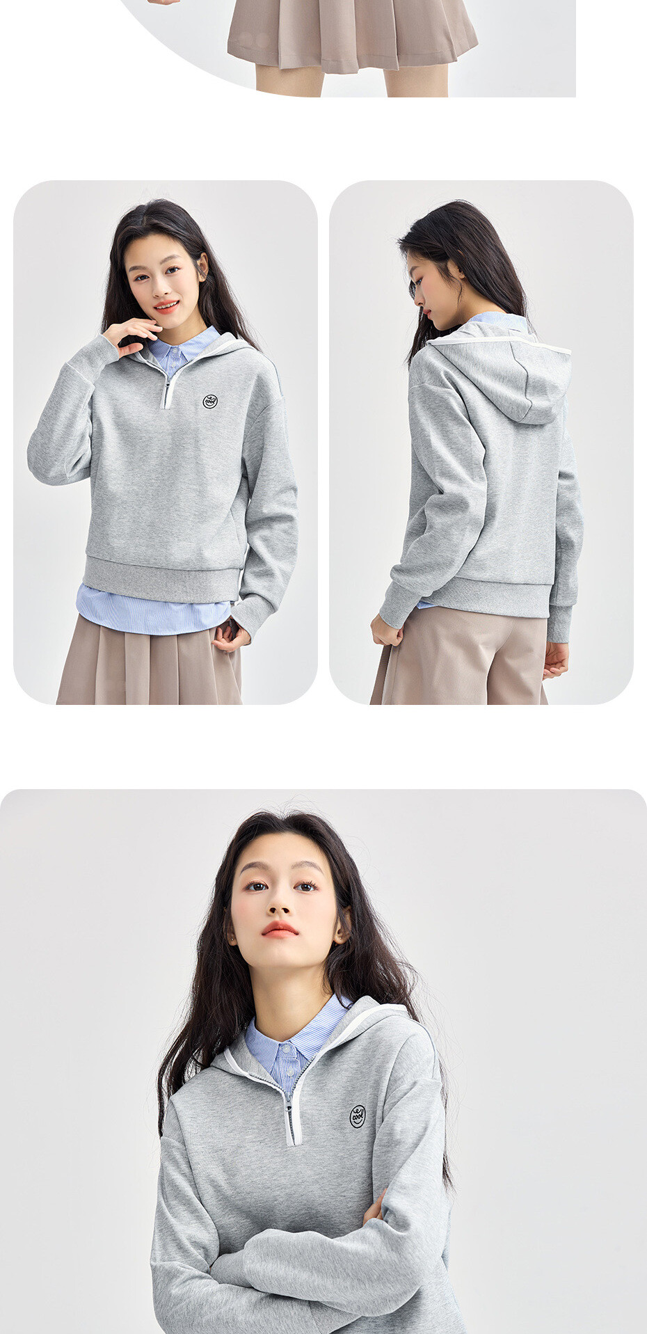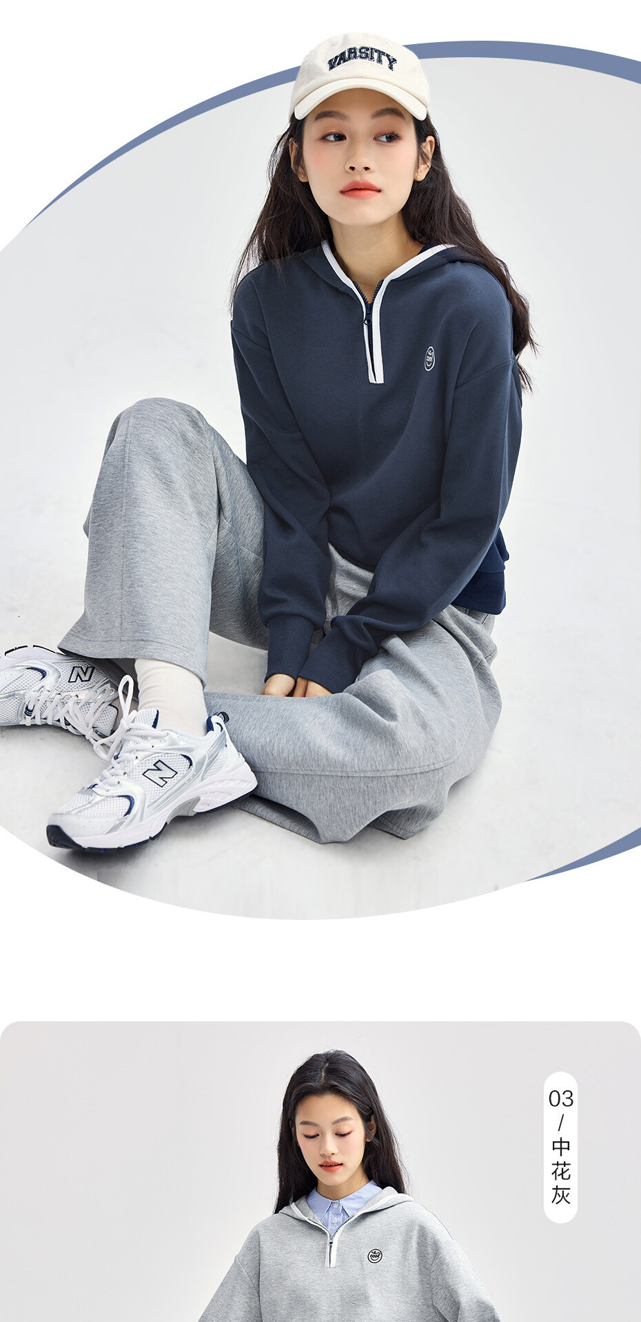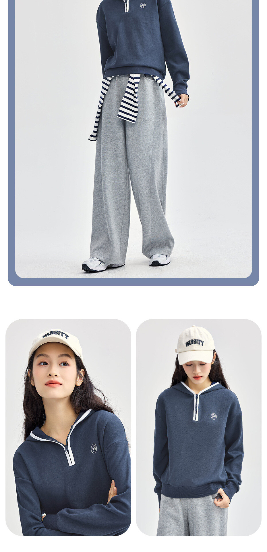 刺绣撞色边连帽半开胸双面布针织卫衣