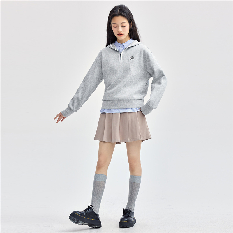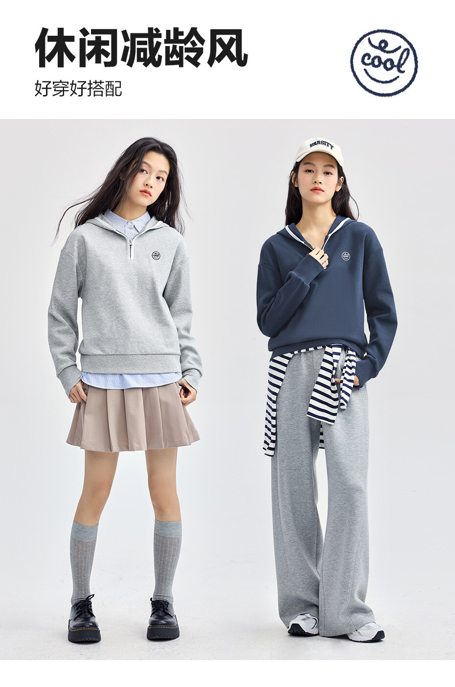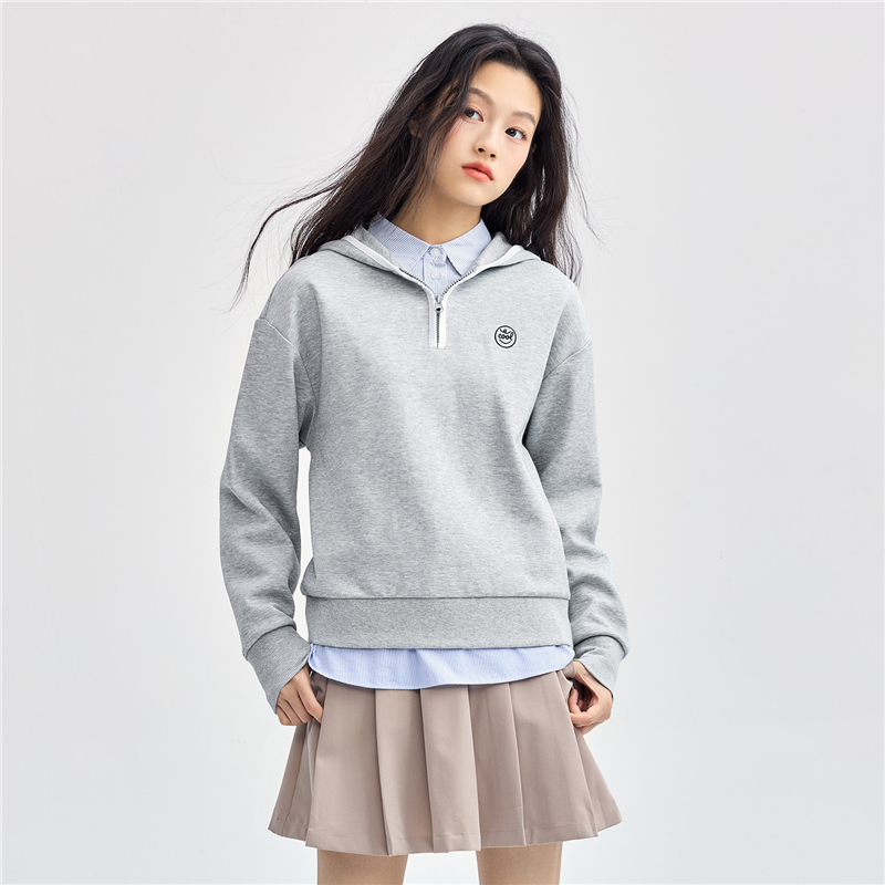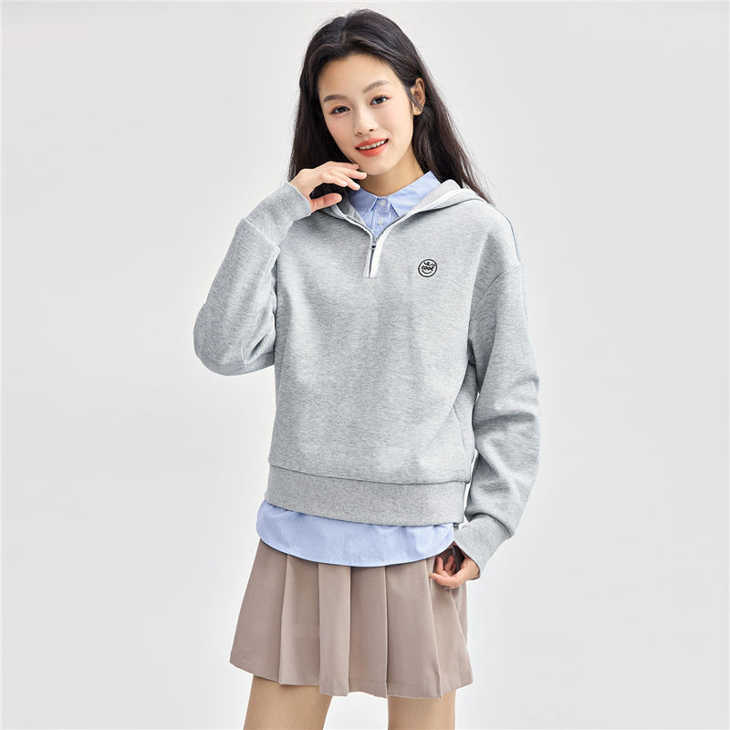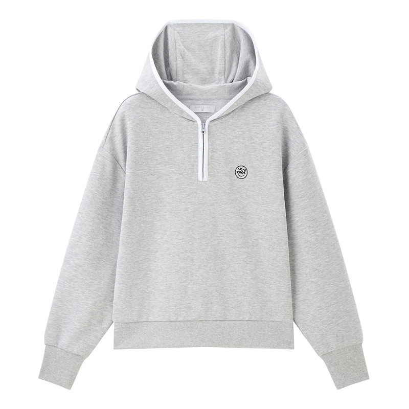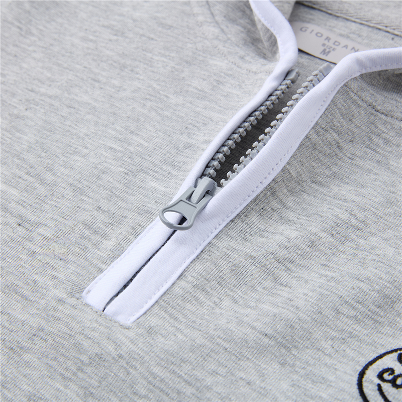 刺绣撞色边连帽半开胸双面布针织卫衣