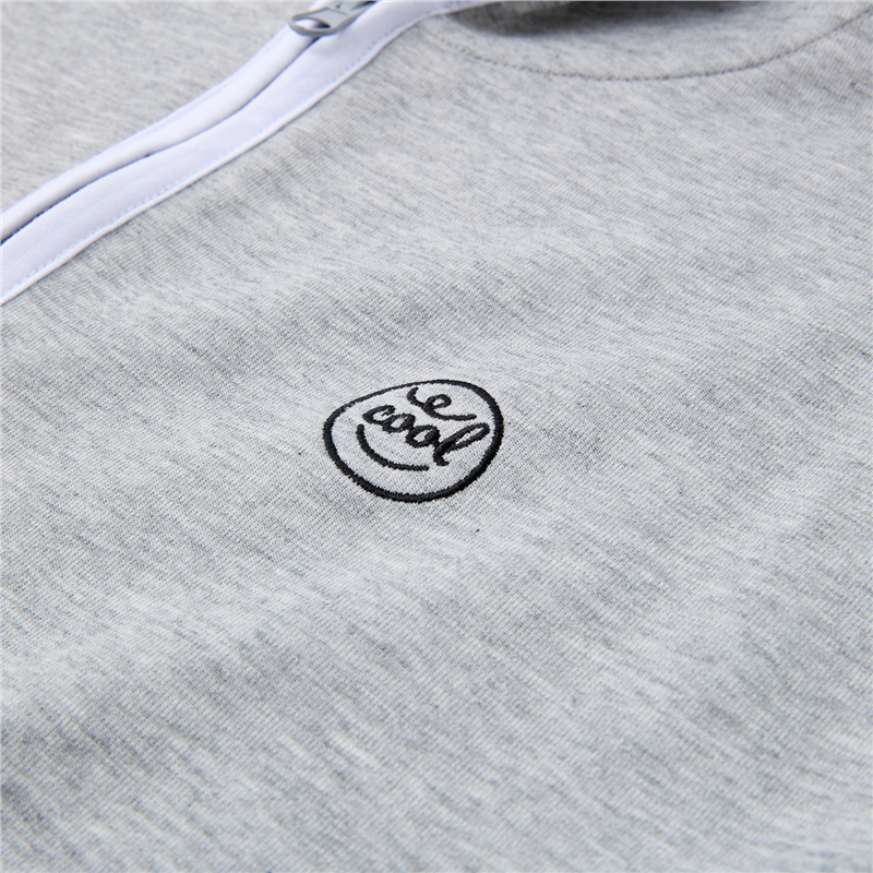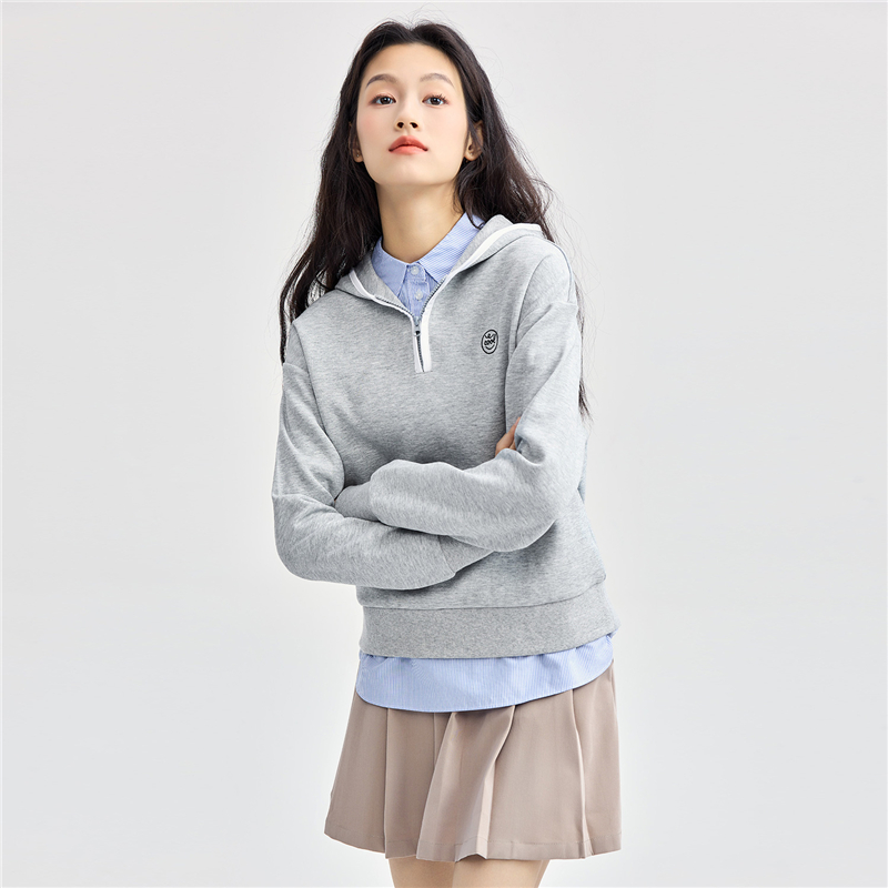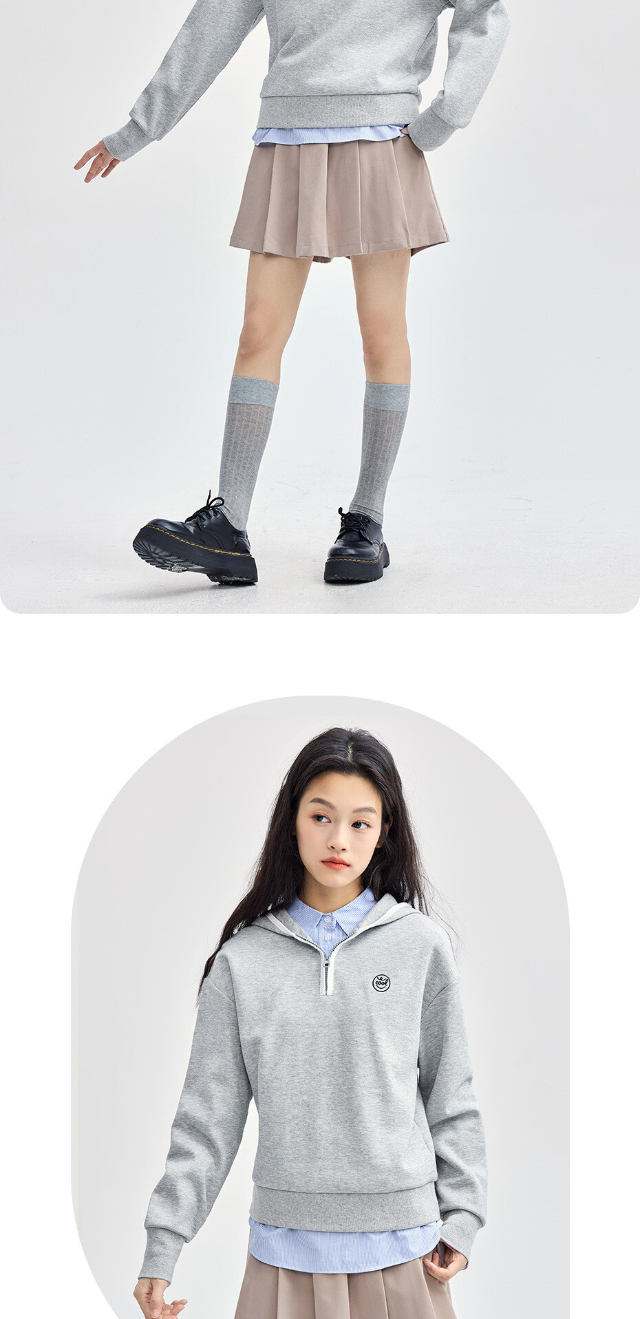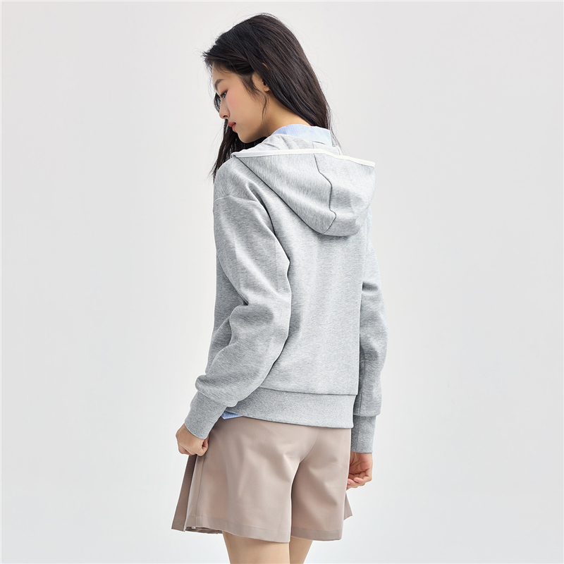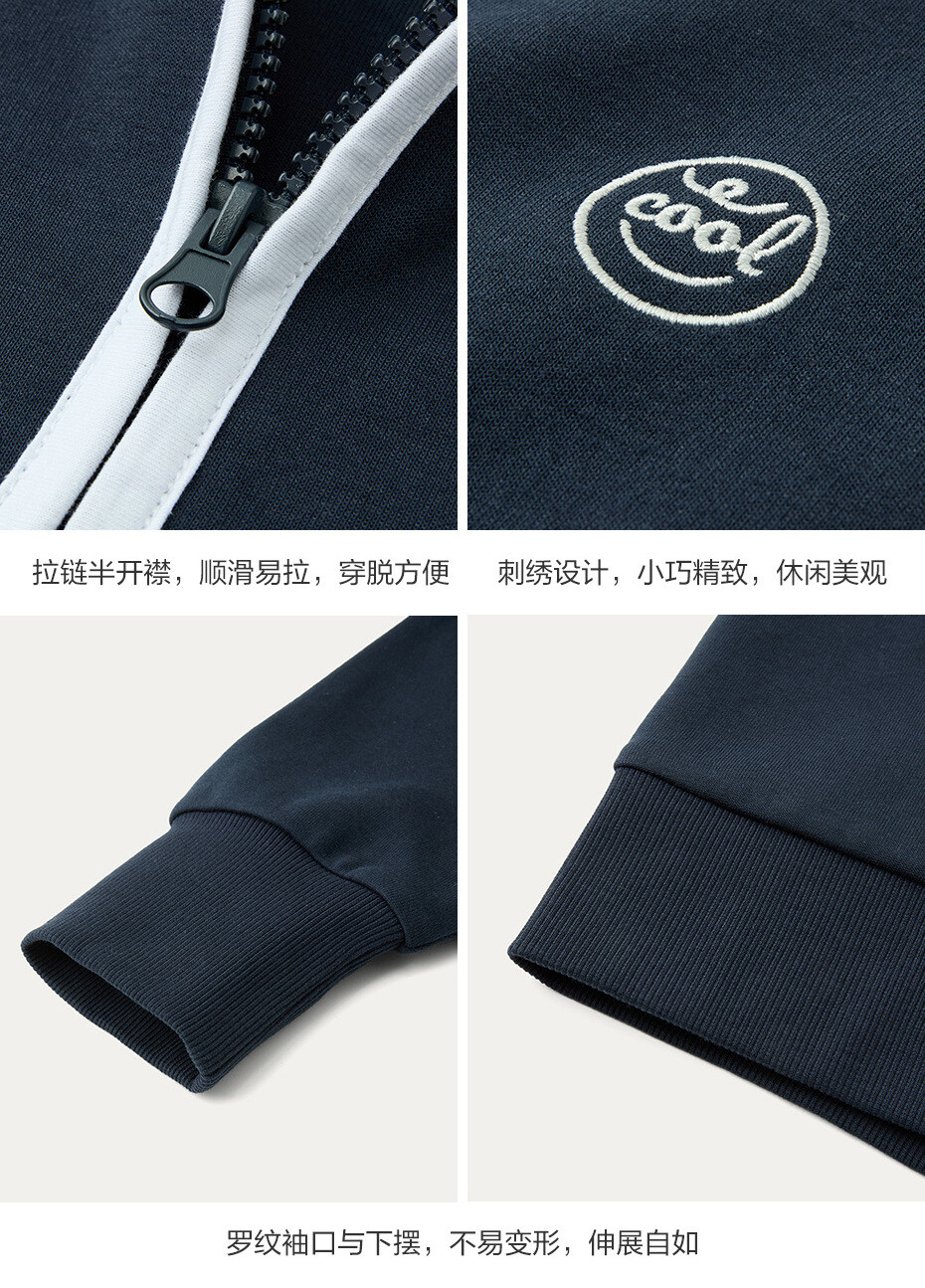 双面布面料,质感细腻;连帽版型,撞色边点缀,时尚醒目;拉链半开襟,顺滑易拉,穿脱方便;刺绣设计,小巧精致,休闲美观。