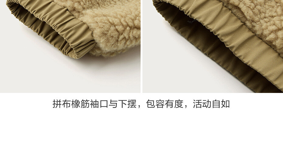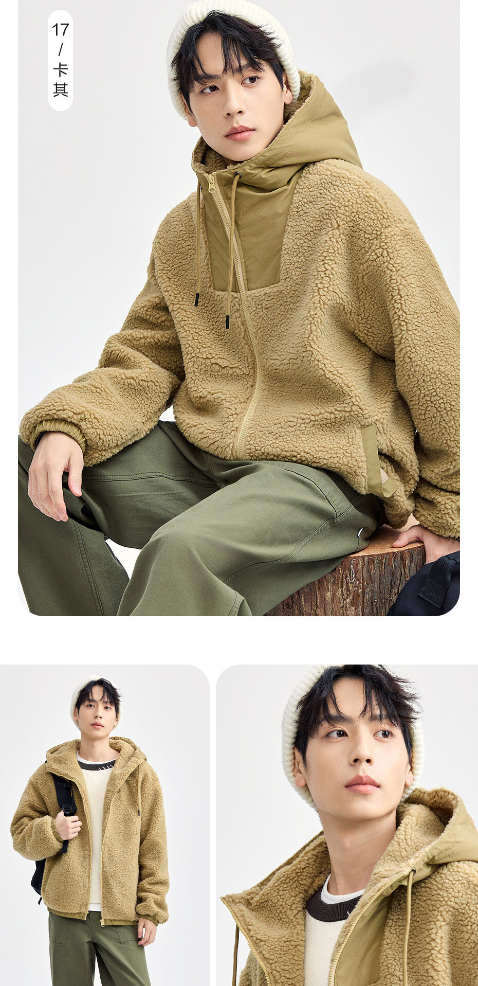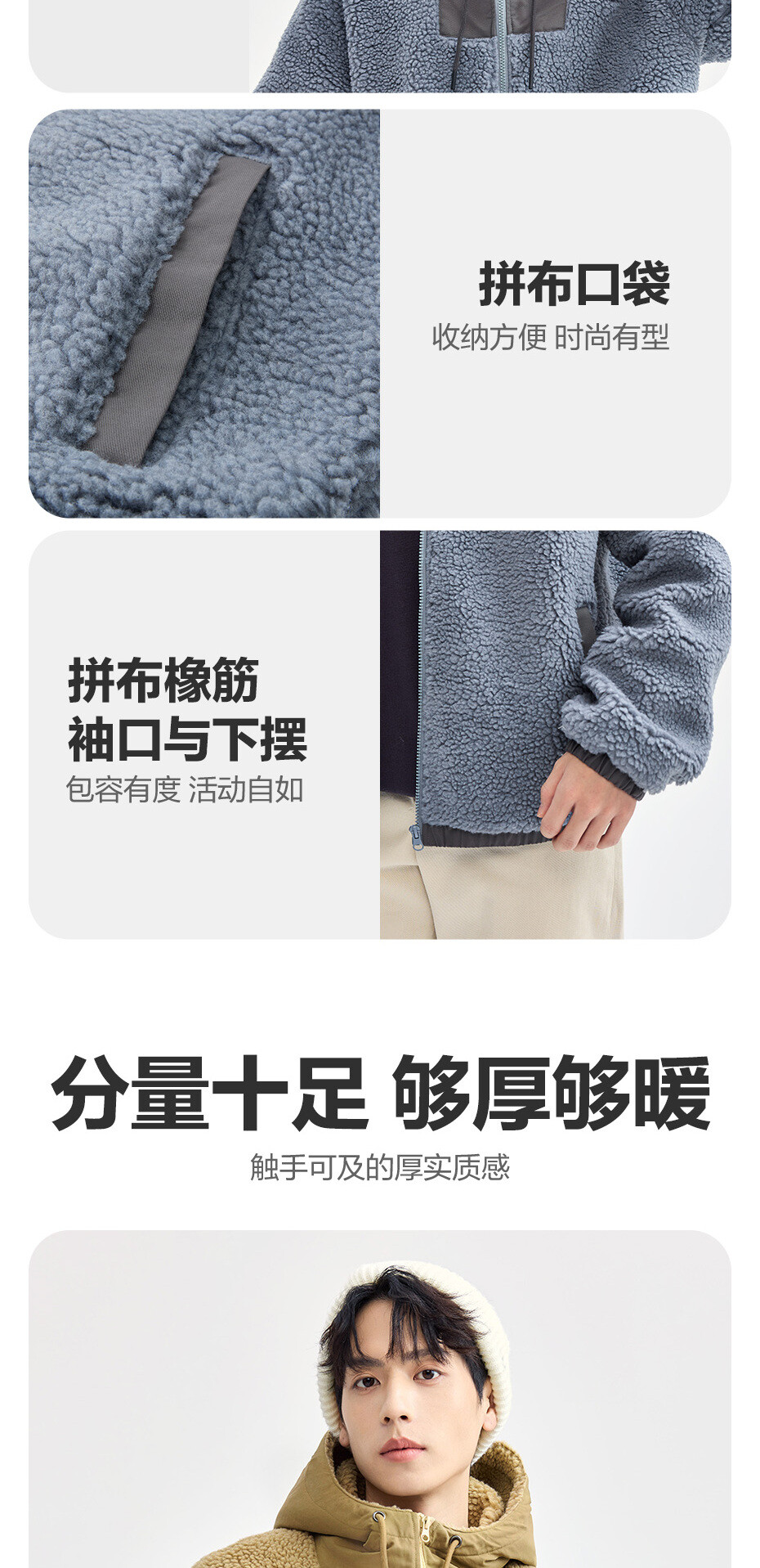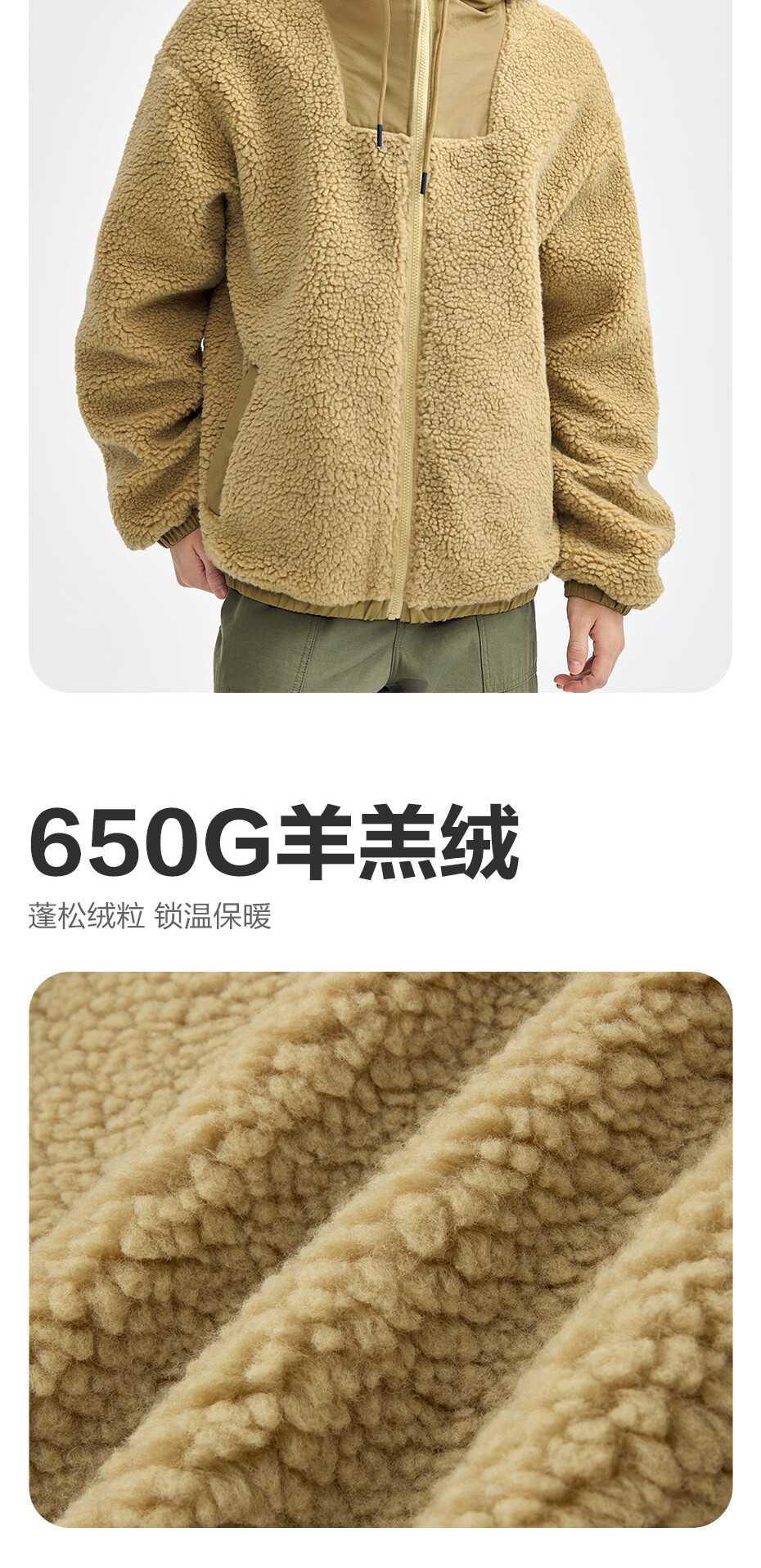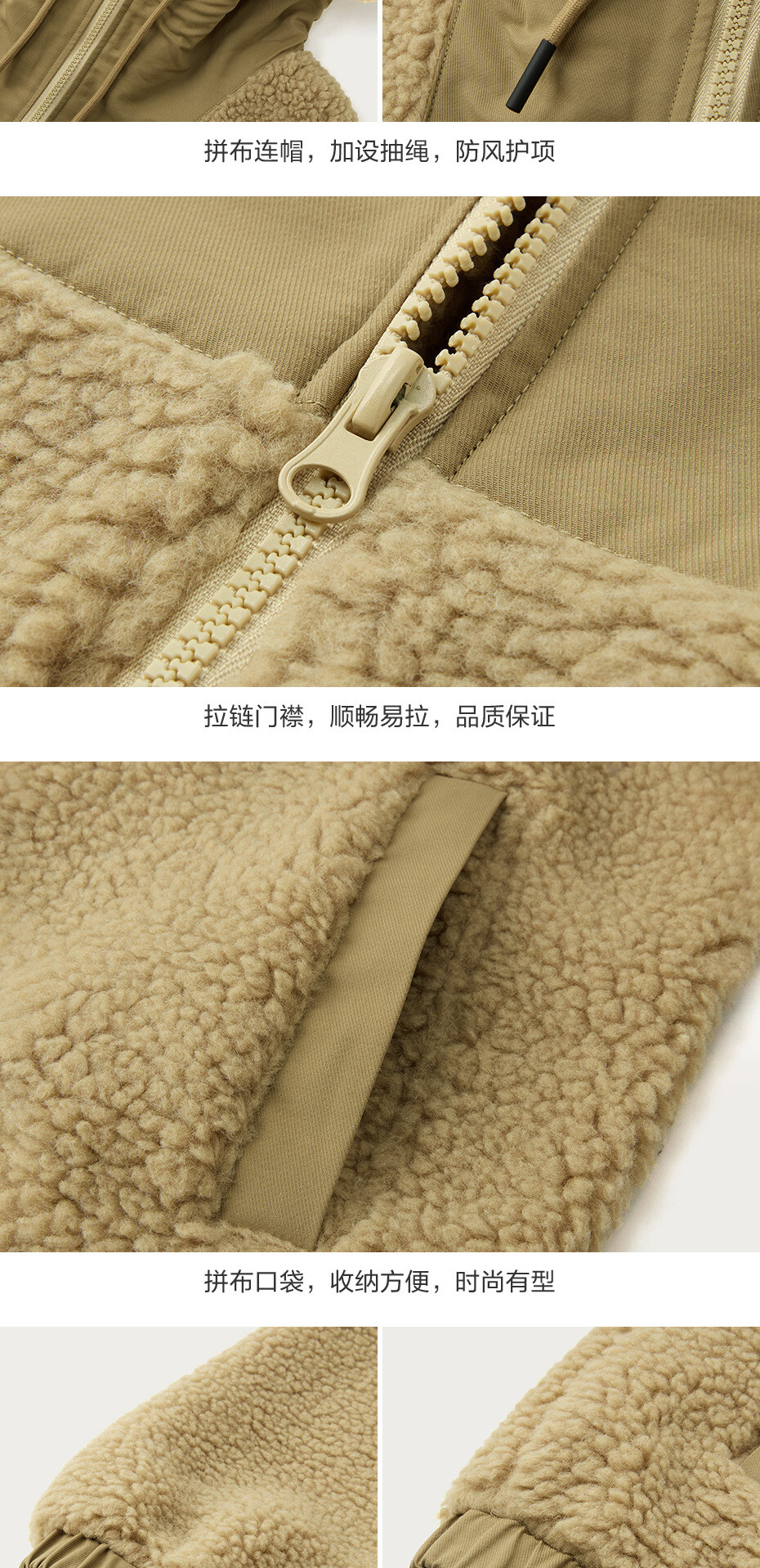 仿羊羔绒面料,厚实温暖;拼布连帽,加设抽绳,防风护项;拉链门襟,顺畅易拉,品质保证;拼布口袋,收纳方便,时尚有型。温馨提示:此款面料成分为针织(100%聚酯纤维)、梭织(64%棉 36%锦纶);里料成分为100%聚酯纤维。