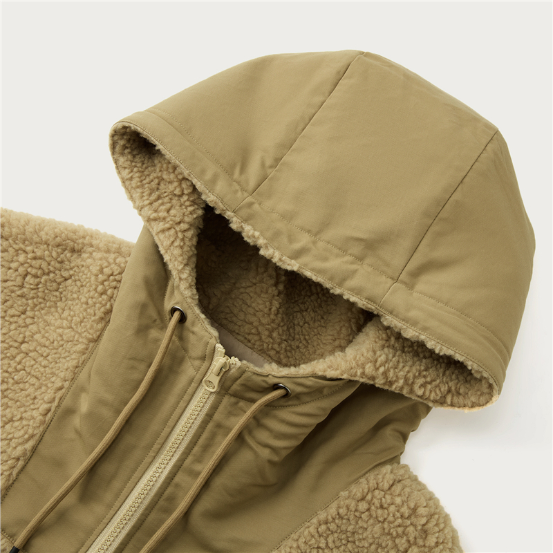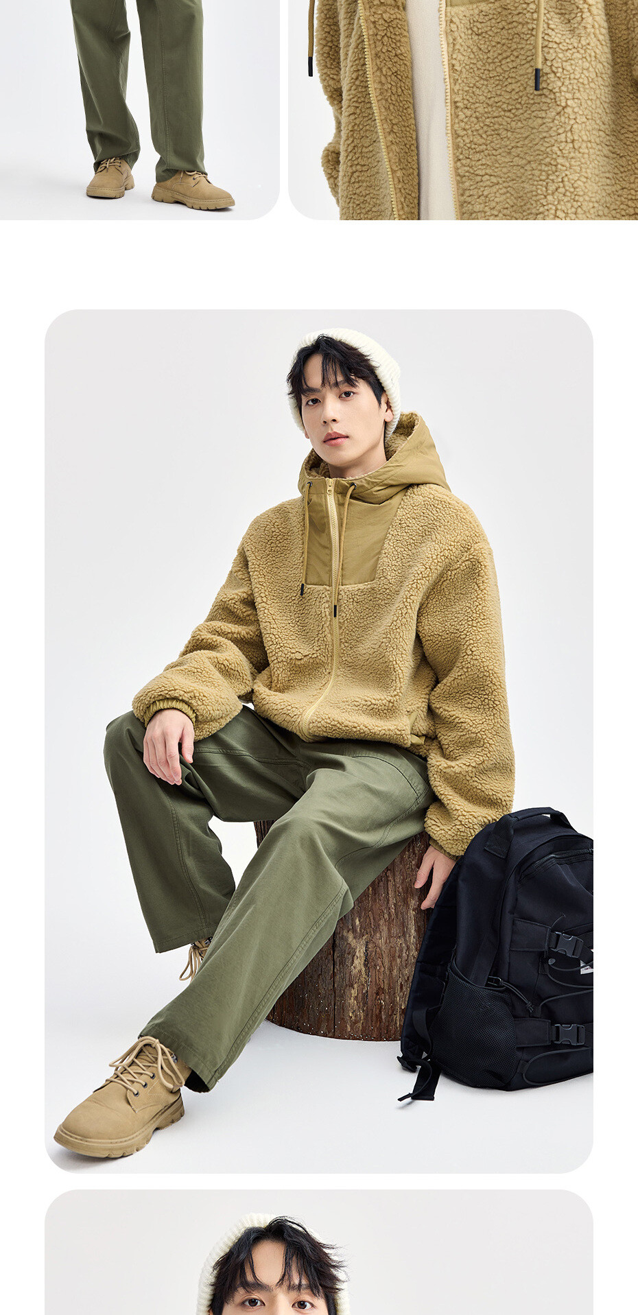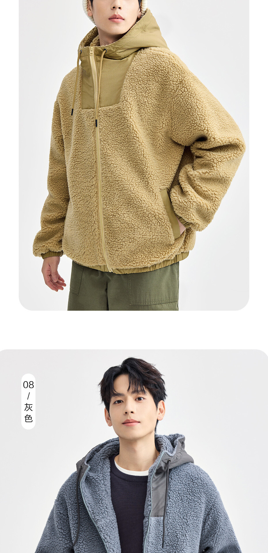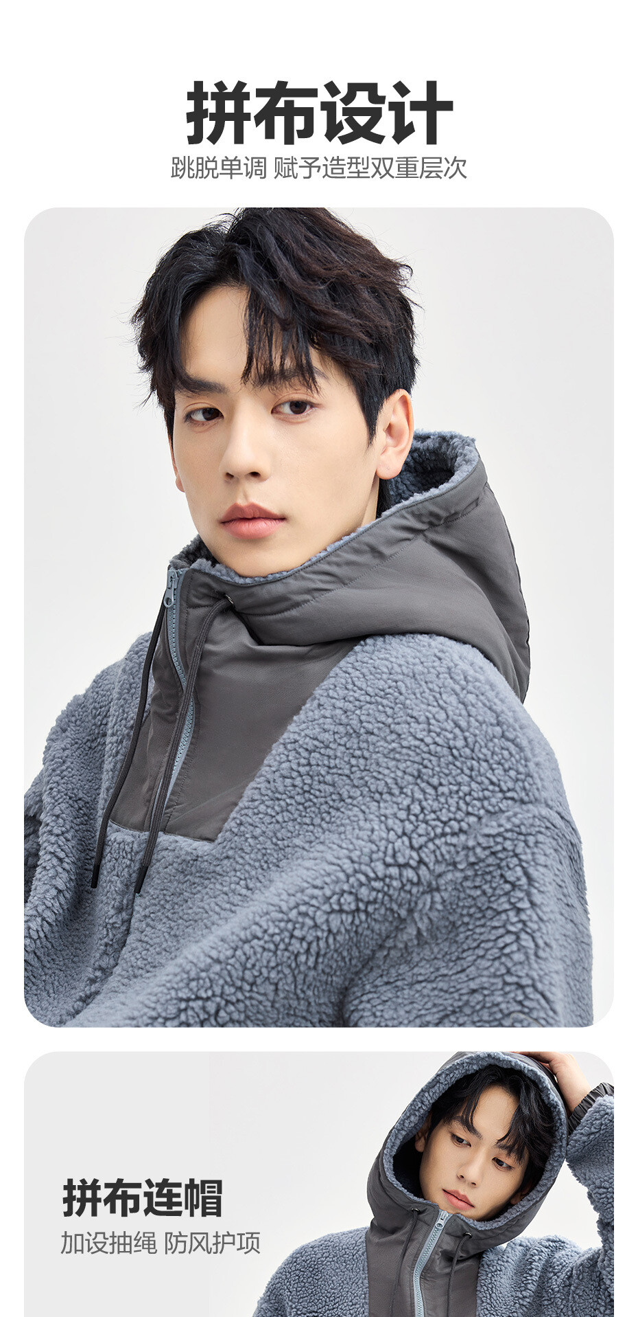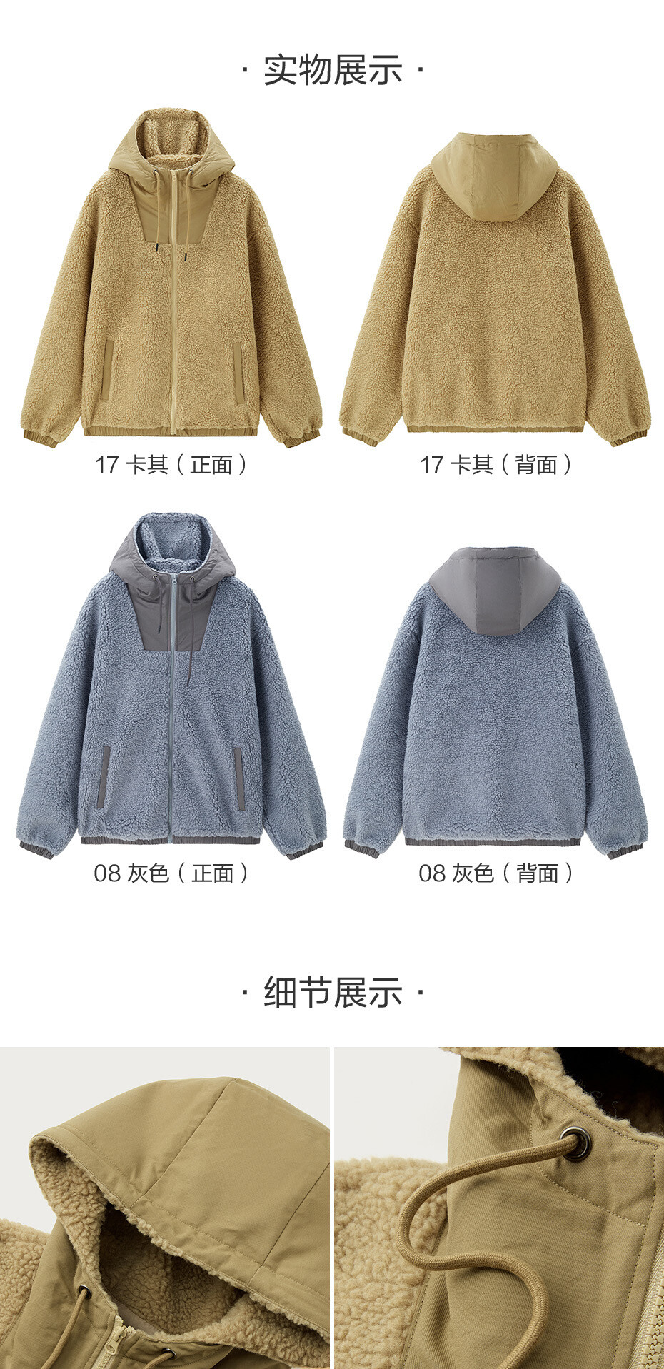 仿羊羔绒面料,厚实温暖;拼布连帽,加设抽绳,防风护项;拉链门襟,顺畅易拉,品质保证;拼布口袋,收纳方便,时尚有型。温馨提示:此款面料成分为针织(100%聚酯纤维)、梭织(64%棉 36%锦纶);里料成分为100%聚酯纤维。