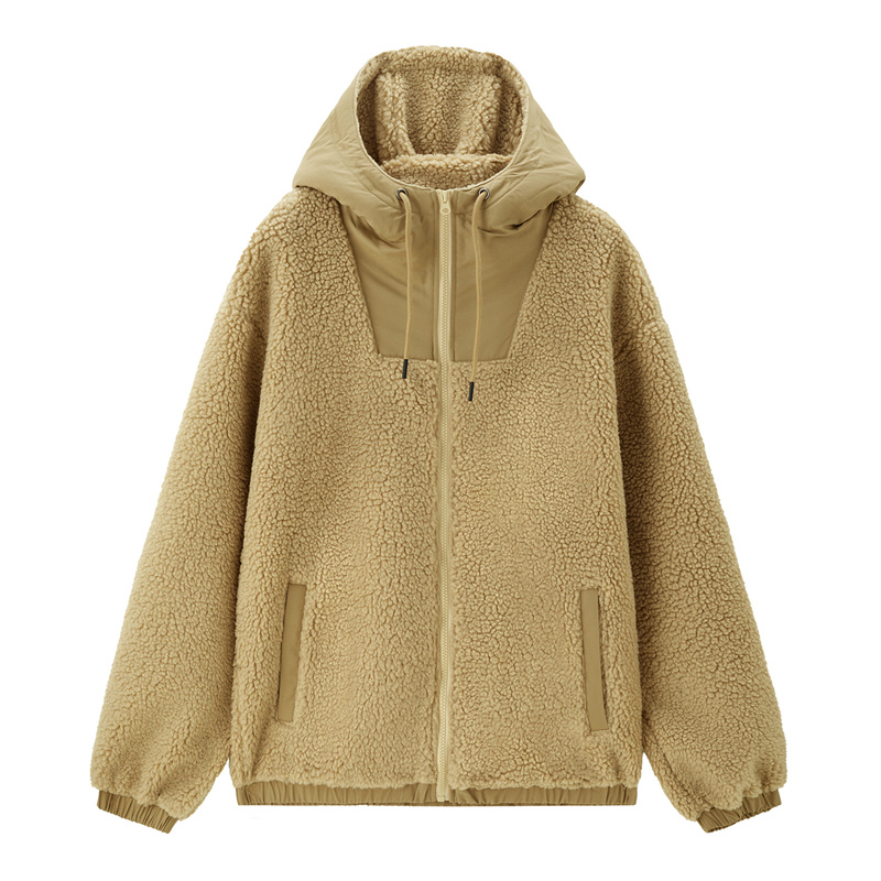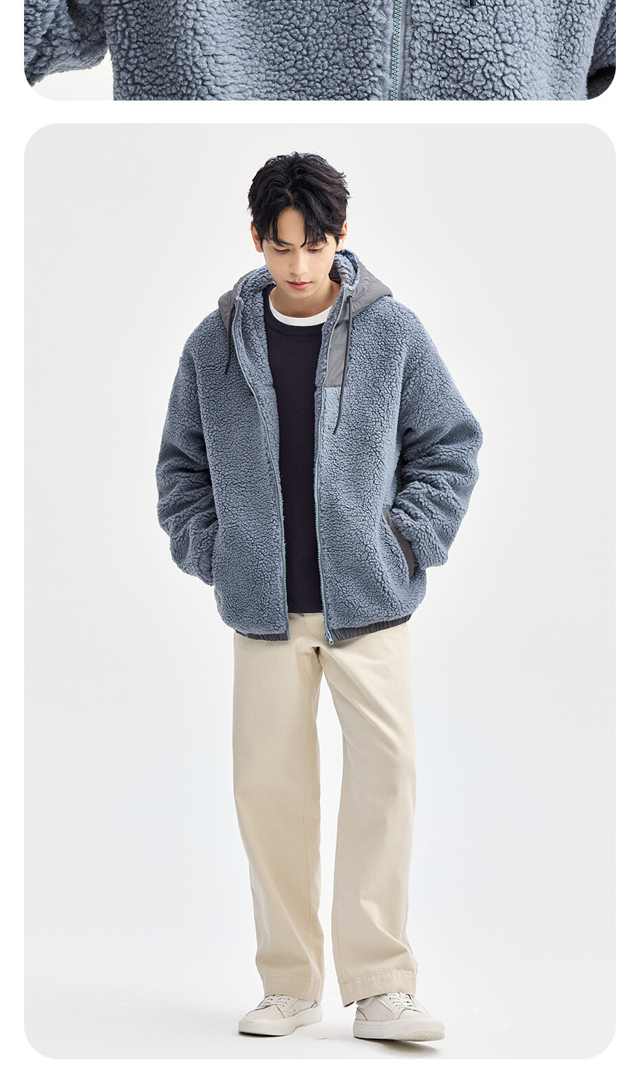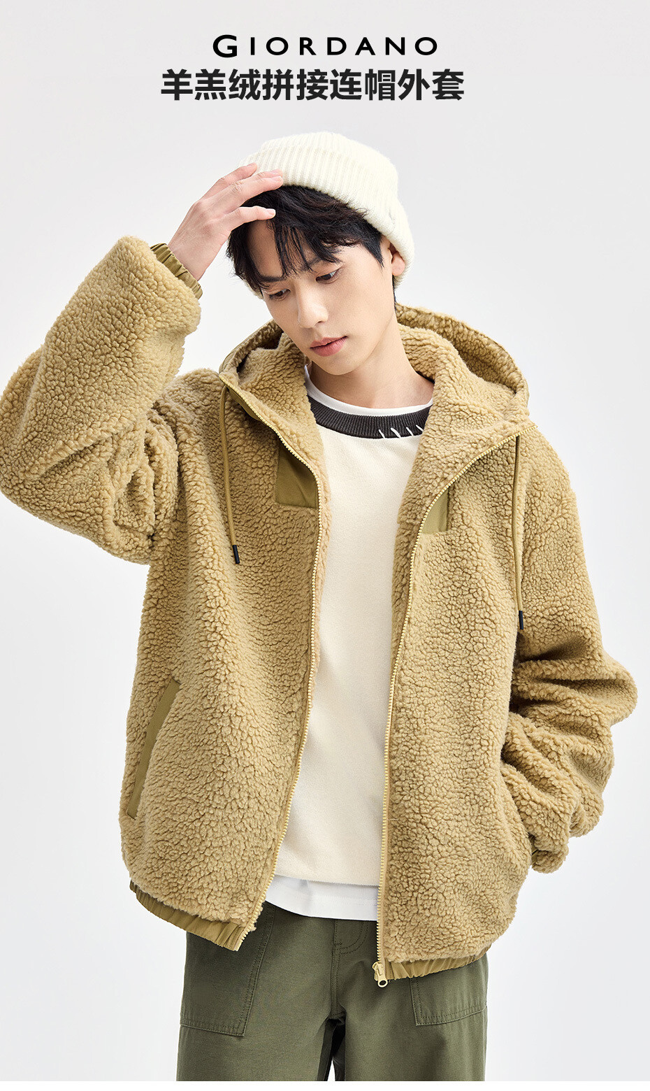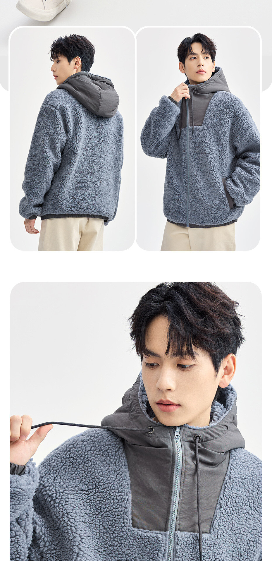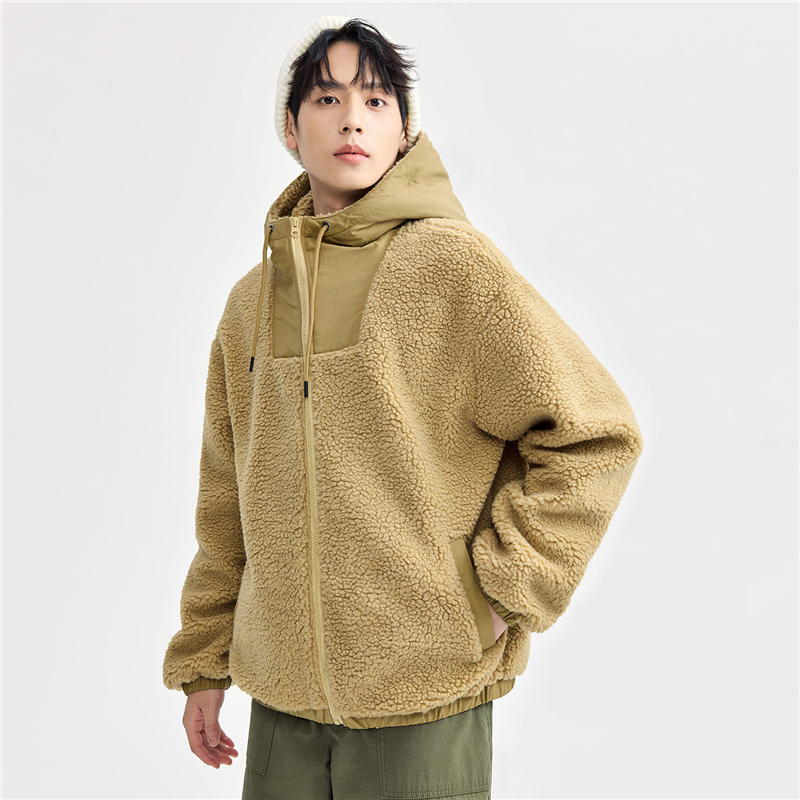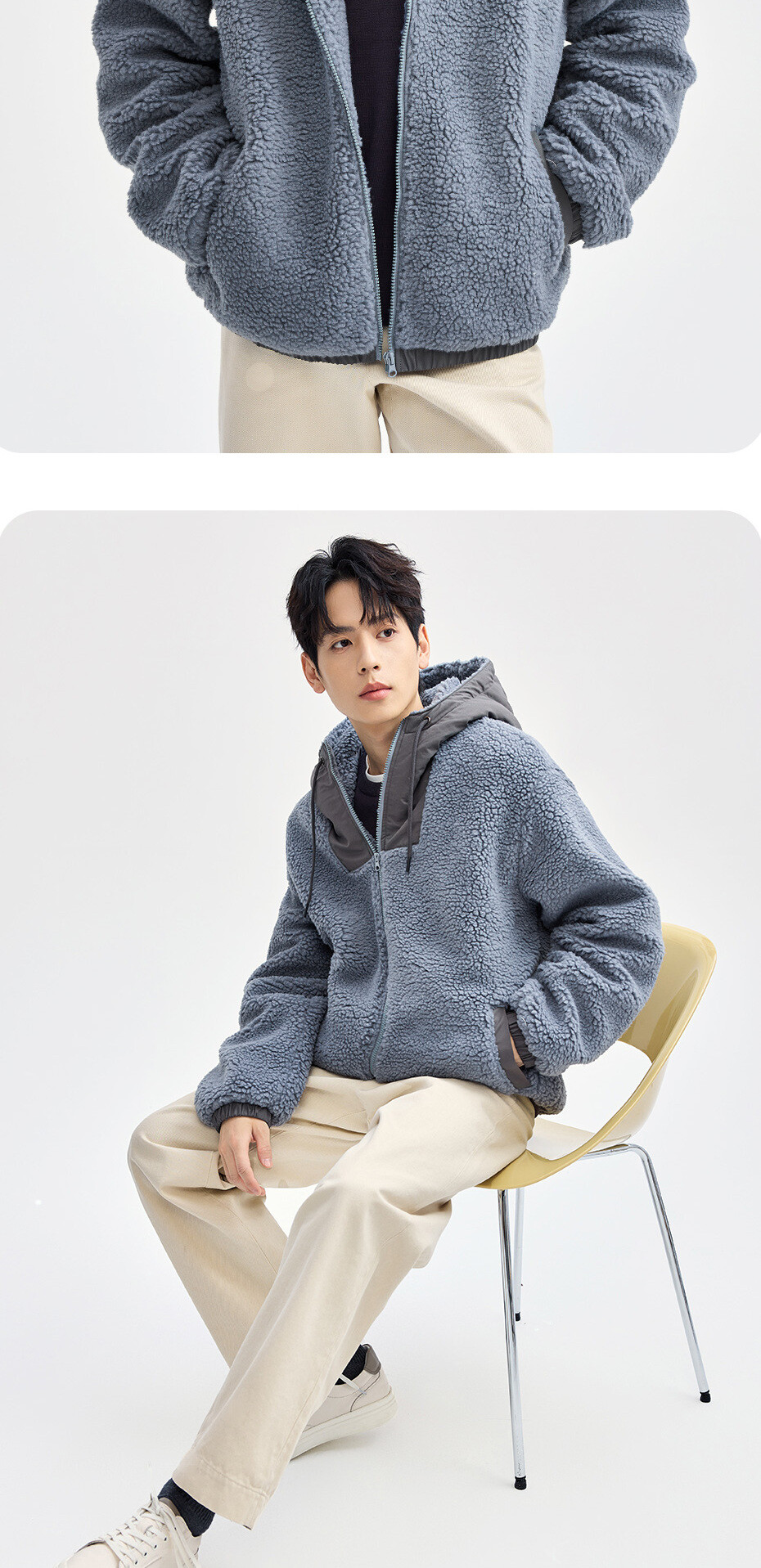 仿羊羔绒面料,厚实温暖;拼布连帽,加设抽绳,防风护项;拉链门襟,顺畅易拉,品质保证;拼布口袋,收纳方便,时尚有型。温馨提示:此款面料成分为针织(100%聚酯纤维)、梭织(64%棉 36%锦纶);里料成分为100%聚酯纤维。