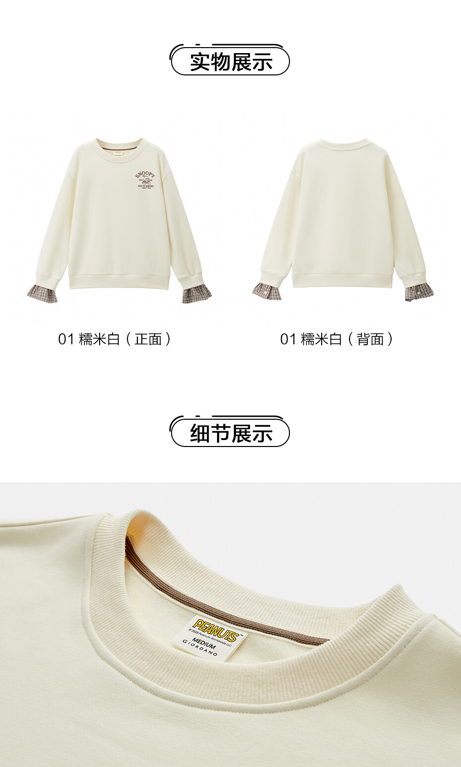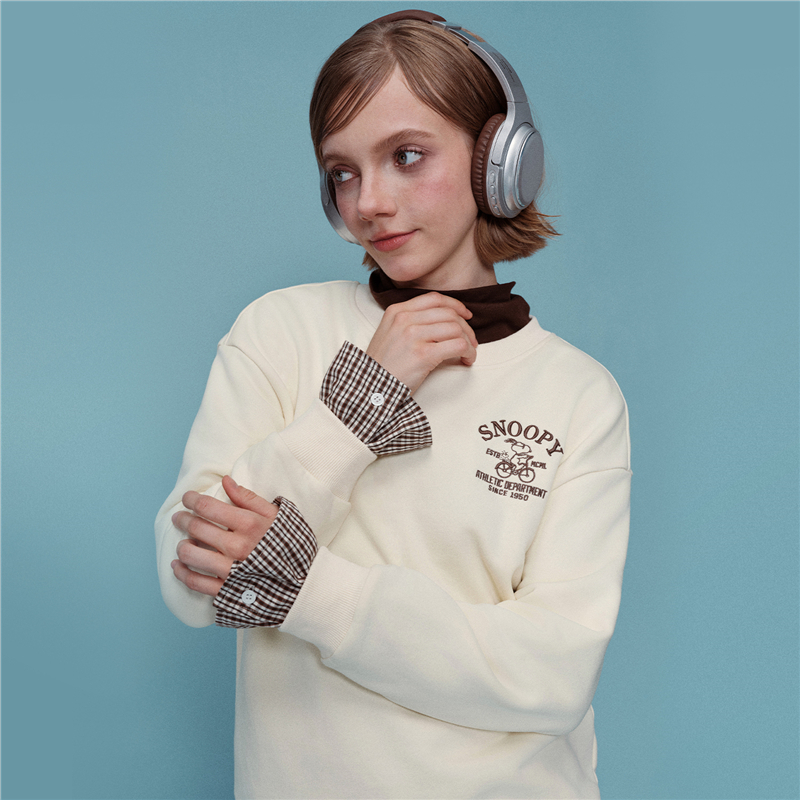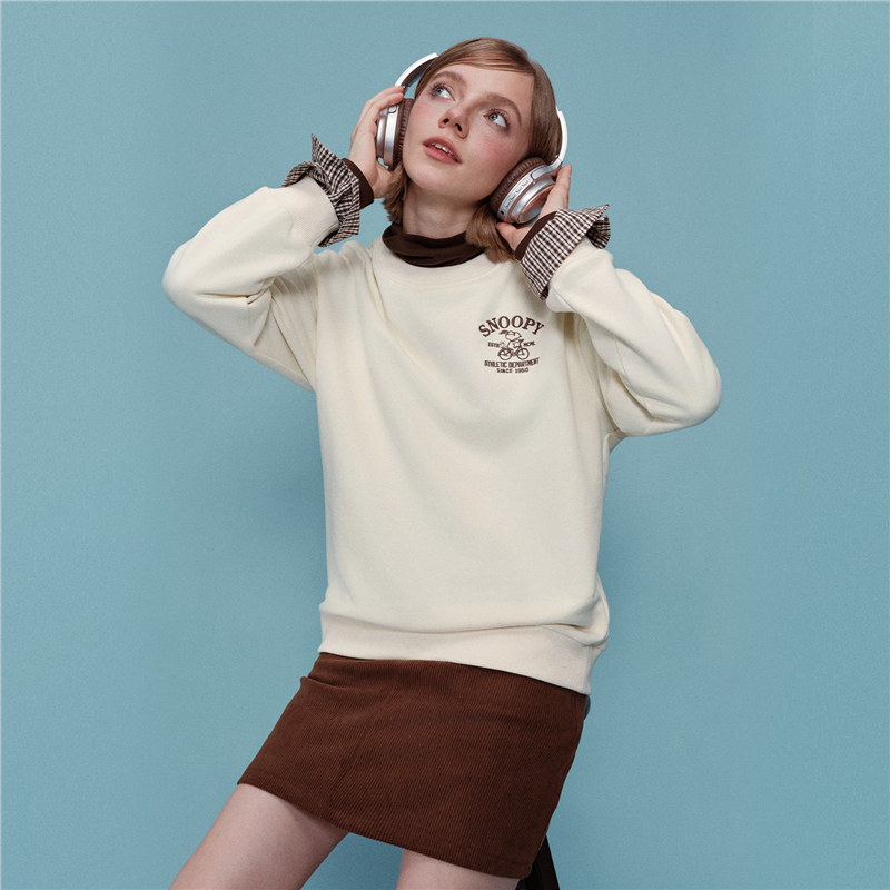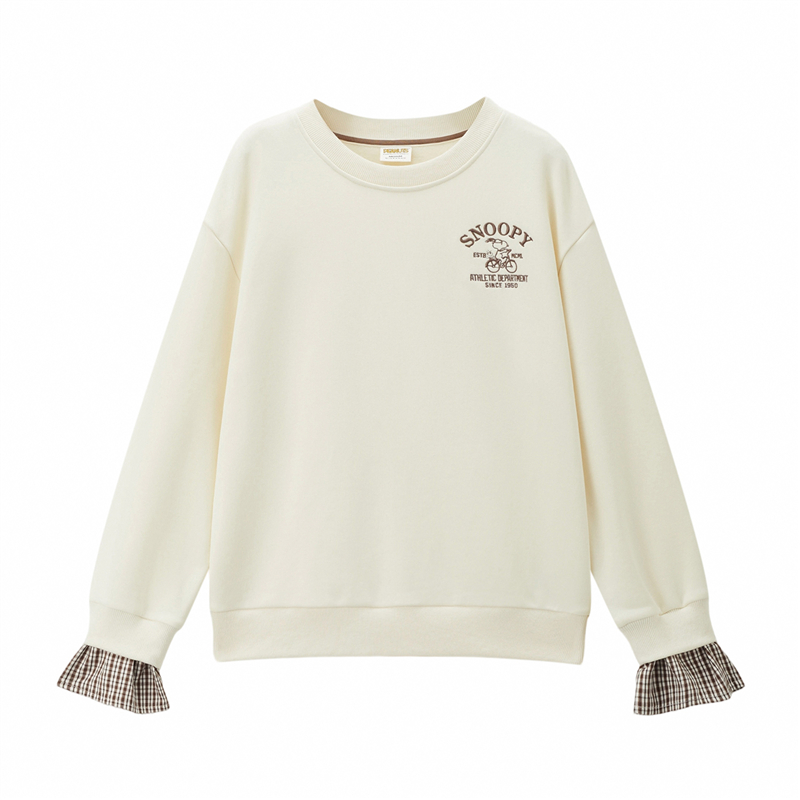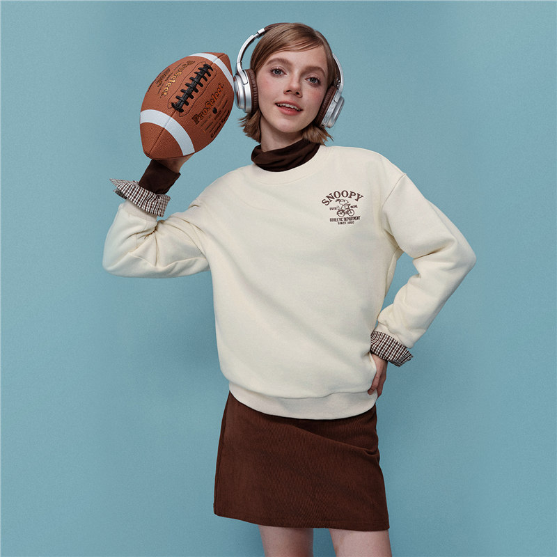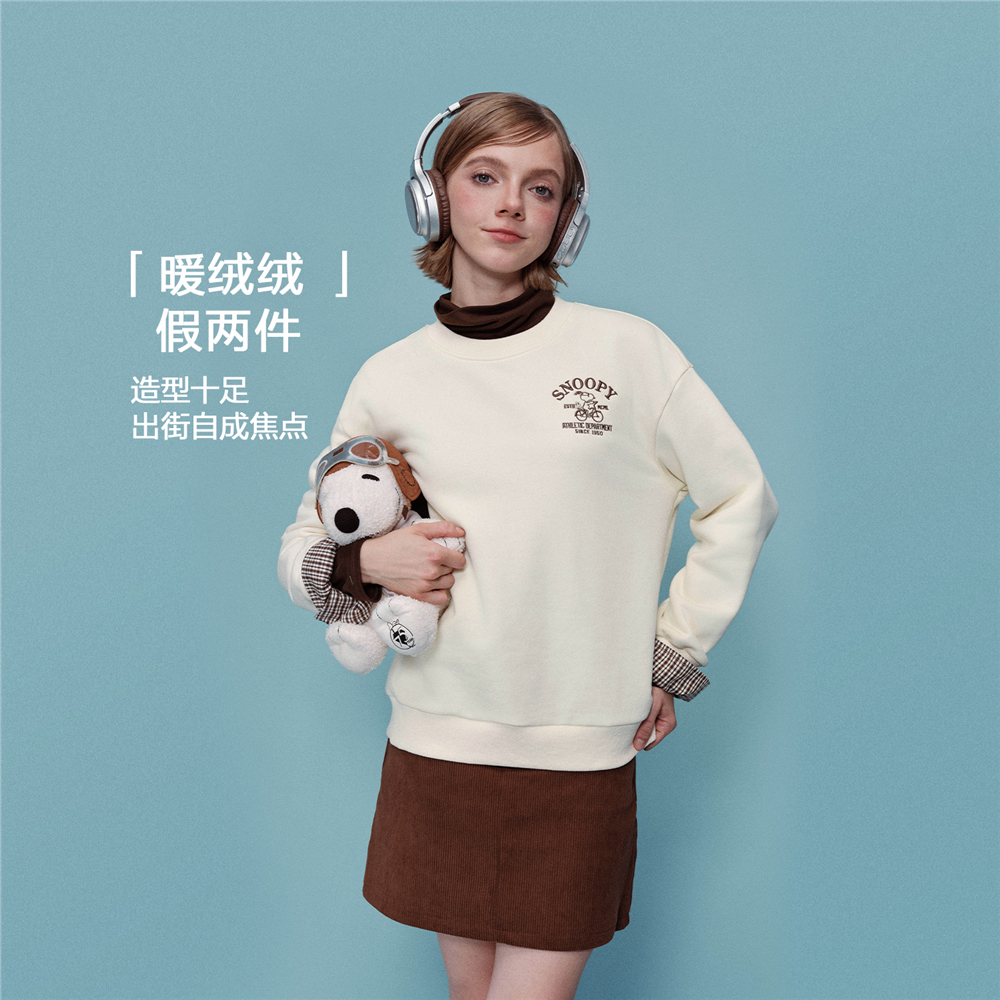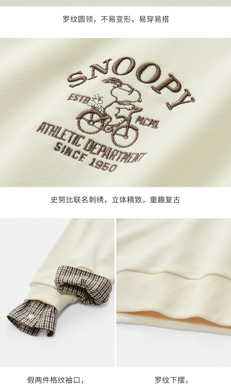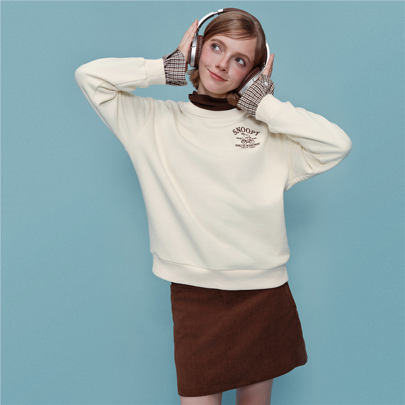 内抓绒卫衣布,温暖舒适;罗纹圆领,不易变形,易穿易搭;史努比联名刺绣,立体精致,童趣复古;假两件格纹袖口,丰富造型,时髦吸睛。温馨提示:此款面料成分为衫身(82%棉 18%聚酯纤维)、格纹(100%棉)