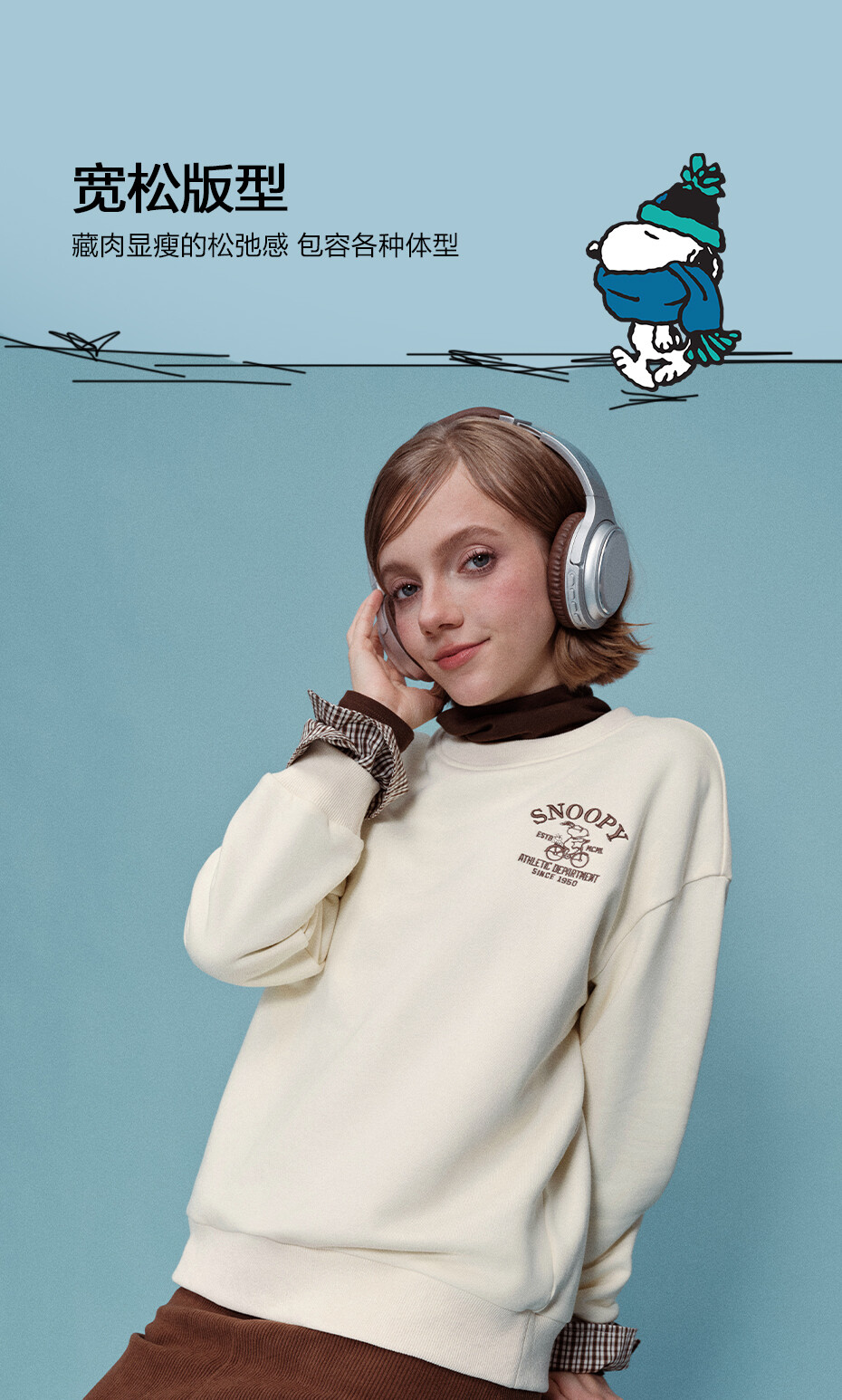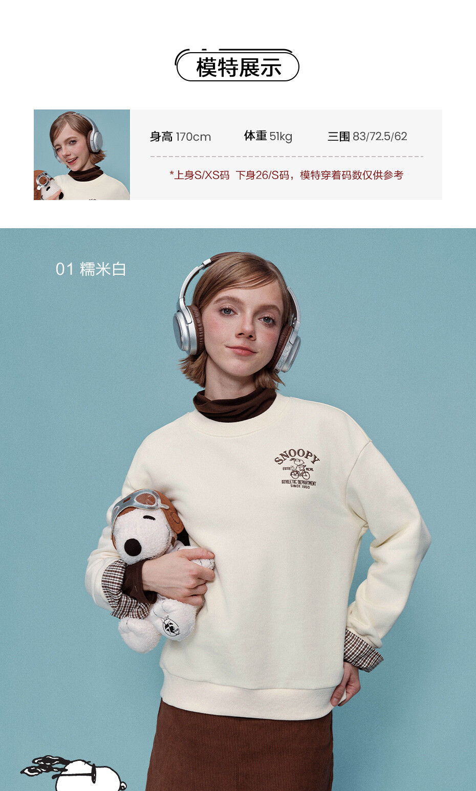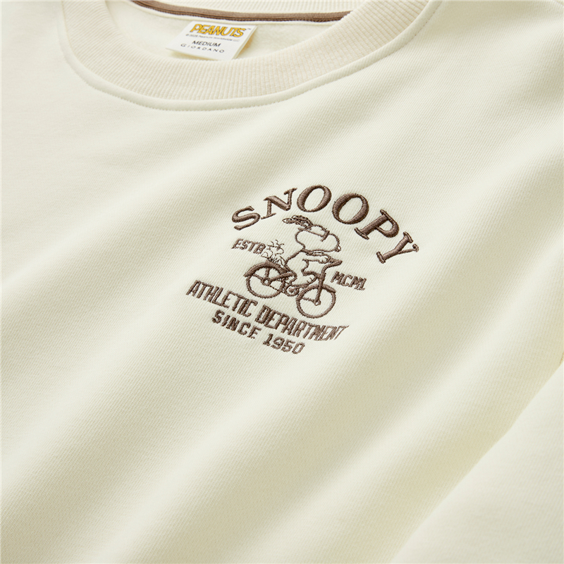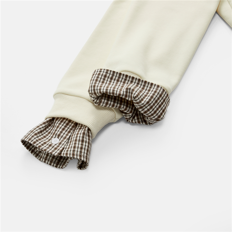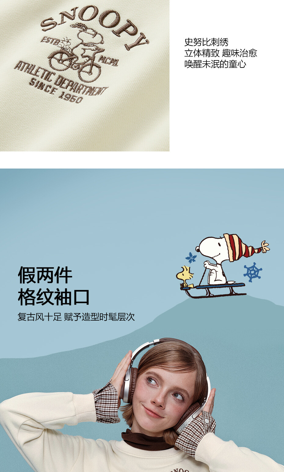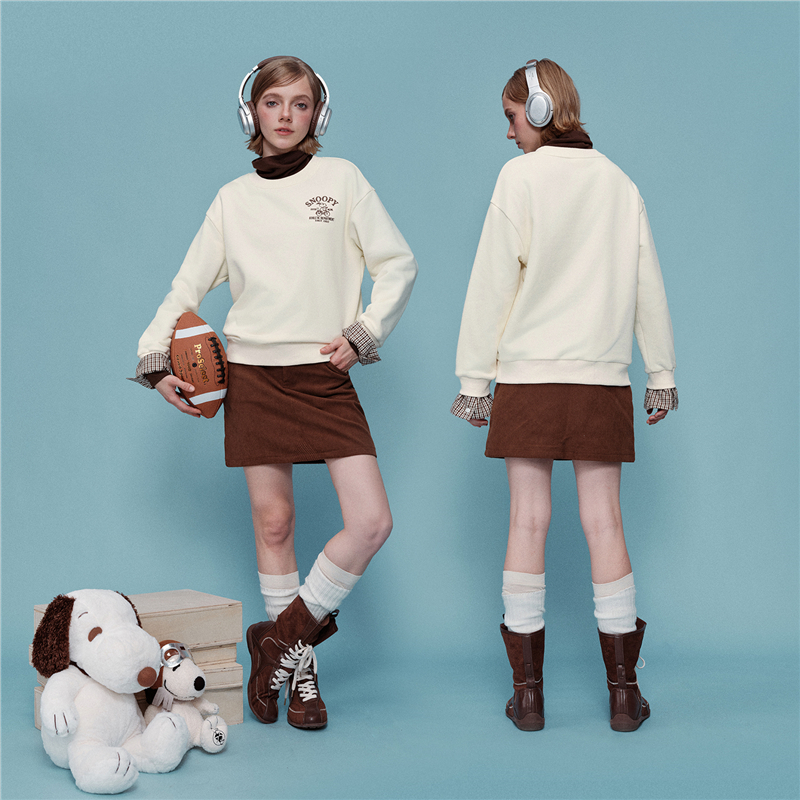 内抓绒卫衣布,温暖舒适;罗纹圆领,不易变形,易穿易搭;史努比联名刺绣,立体精致,童趣复古;假两件格纹袖口,丰富造型,时髦吸睛。温馨提示:此款面料成分为衫身(82%棉 18%聚酯纤维)、格纹(100%棉)