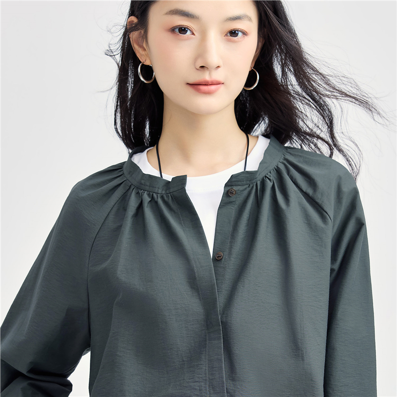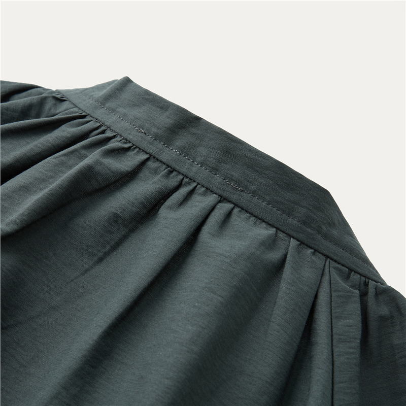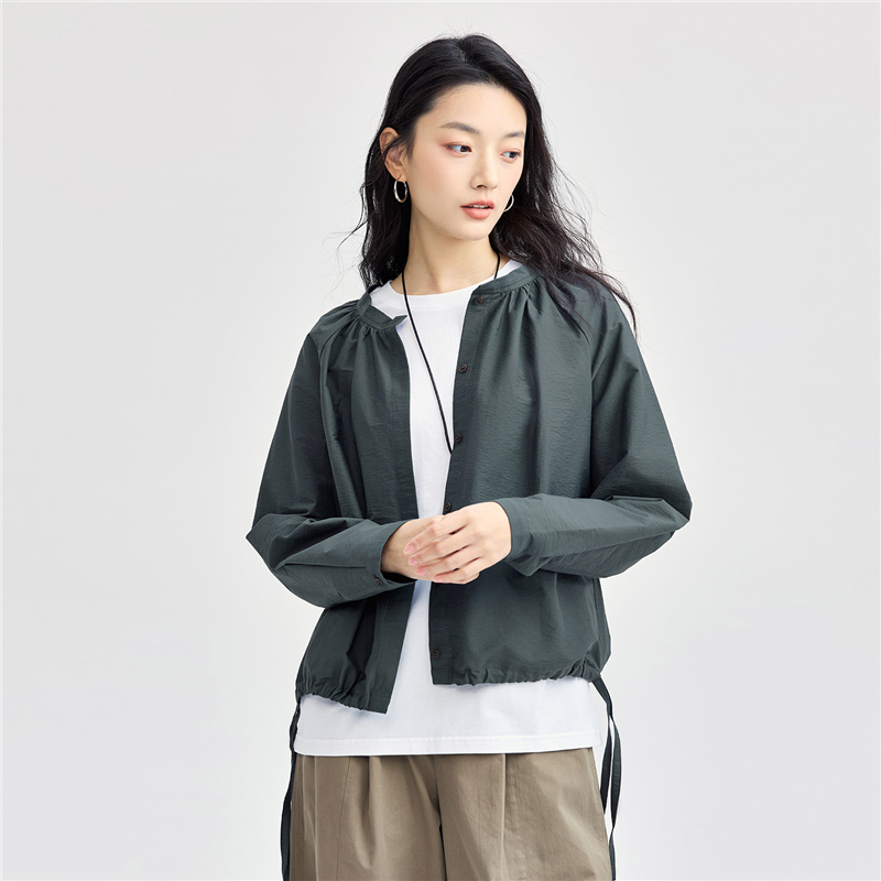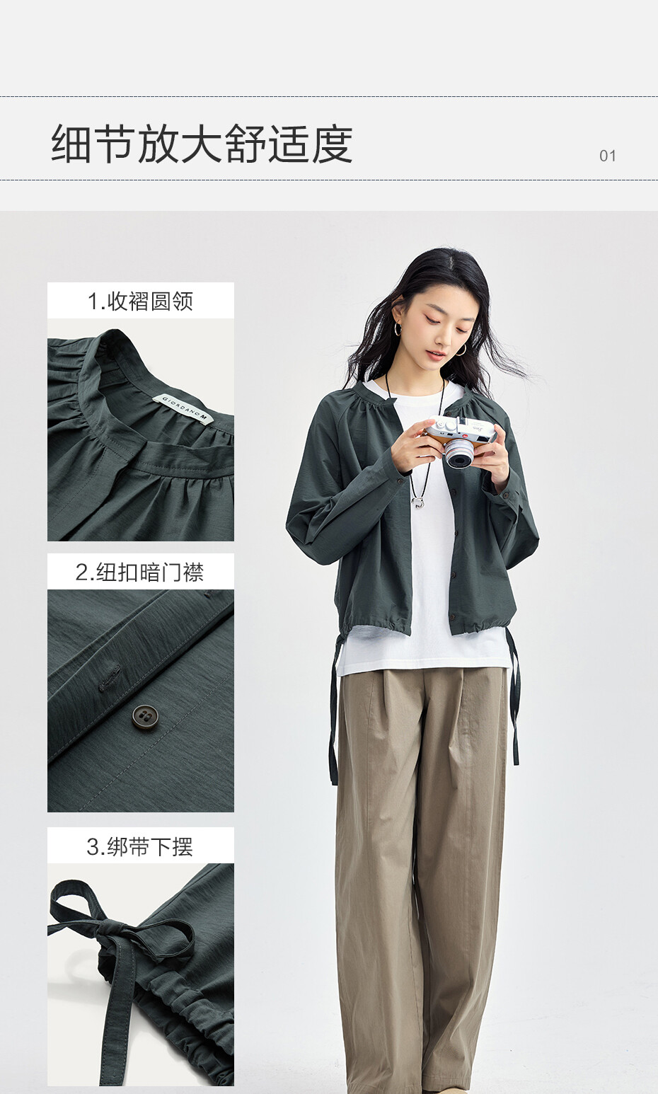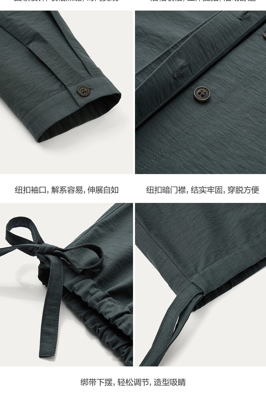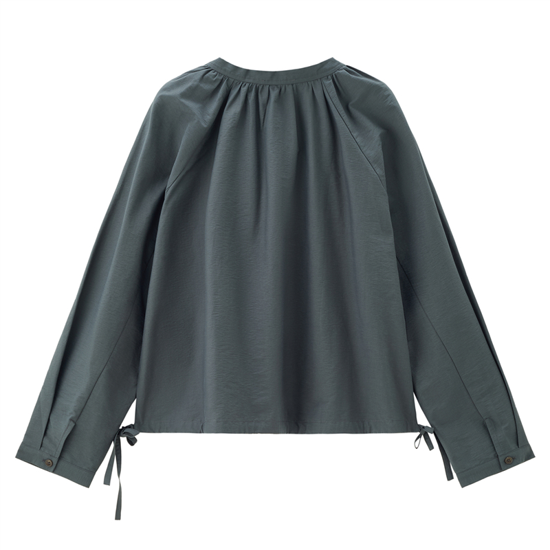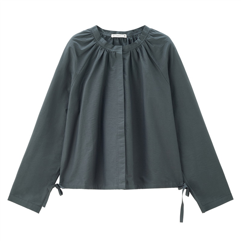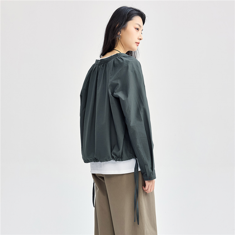 肌理挺阔混纺棉,质感细腻;圆领设计,收褶点缀,时尚美观;纽扣暗门襟,结实牢固,穿脱方便;绑带下摆,轻松调节,造型吸睛。温馨提示:由于批次不同,此款纽扣存在不同;不影响品质与舒适度,请放心选购。