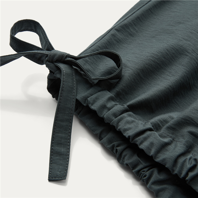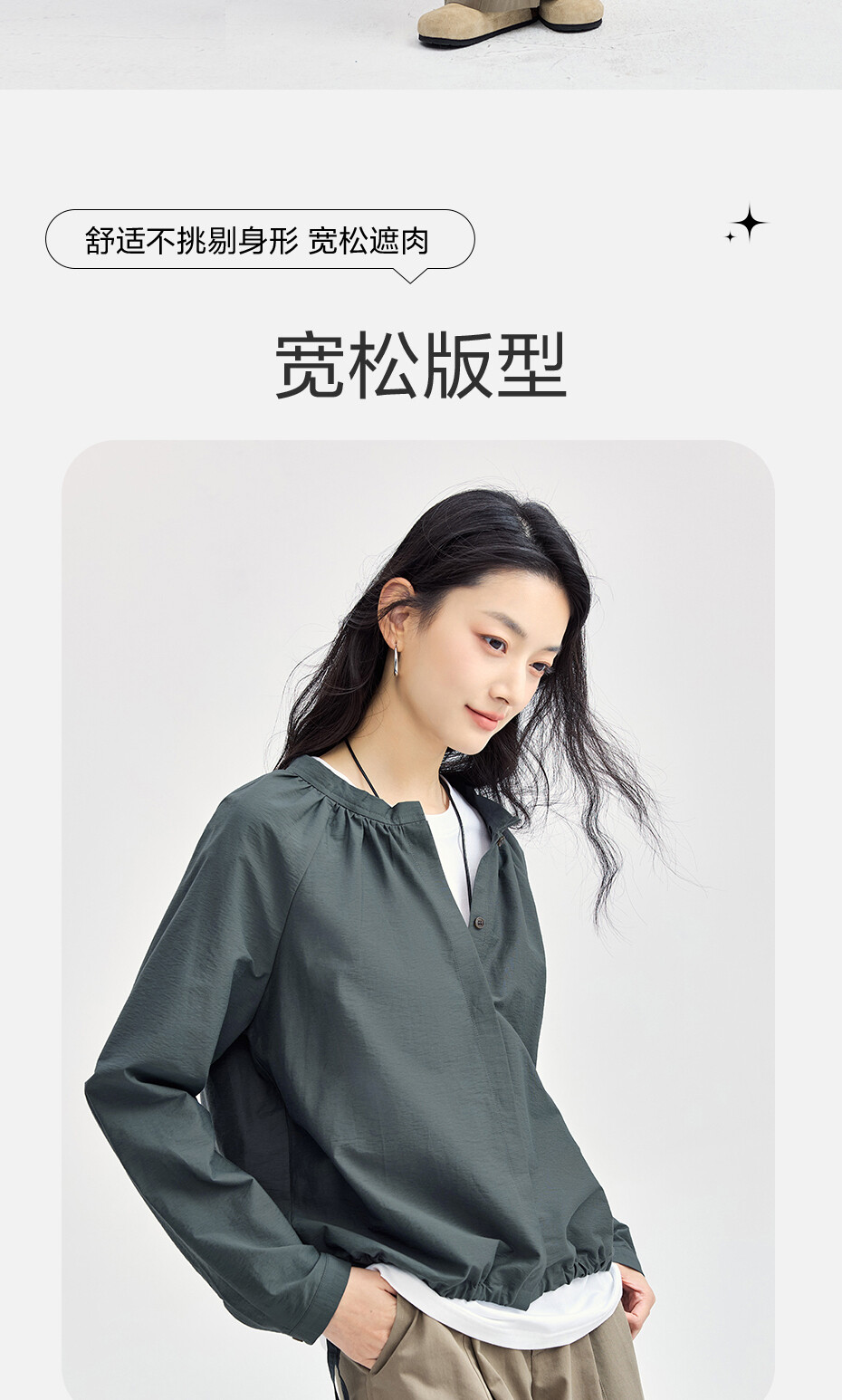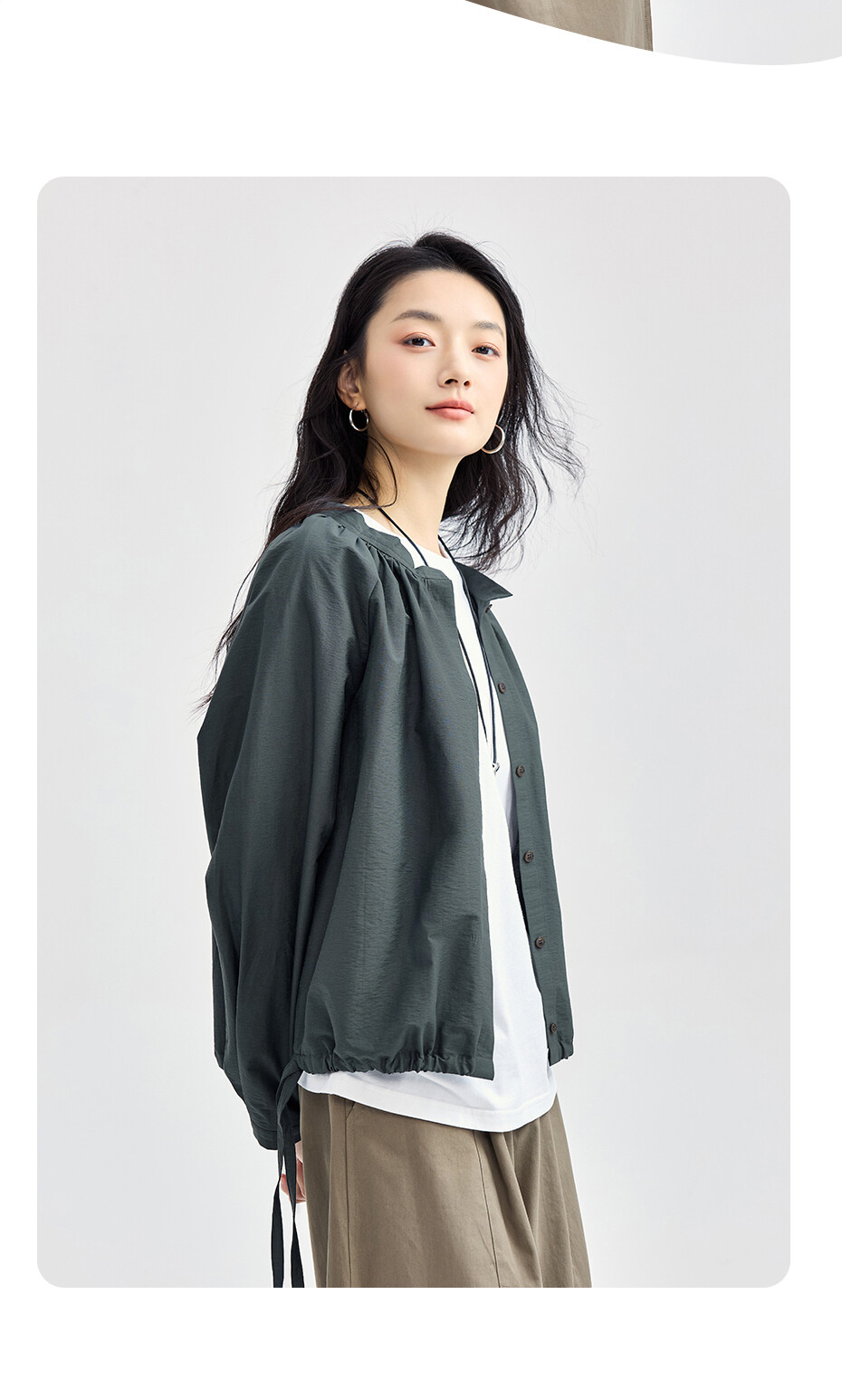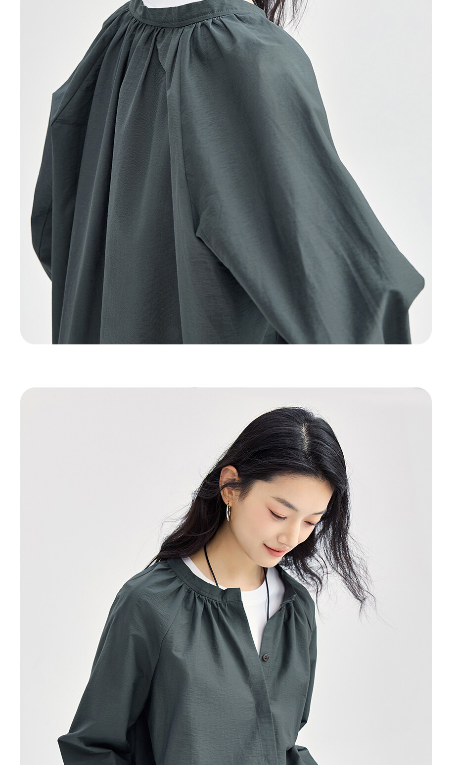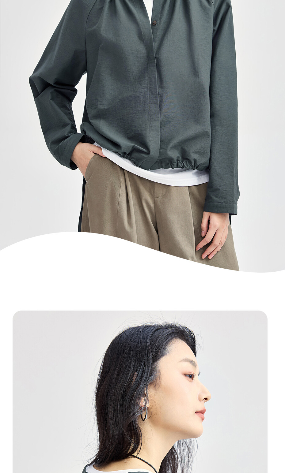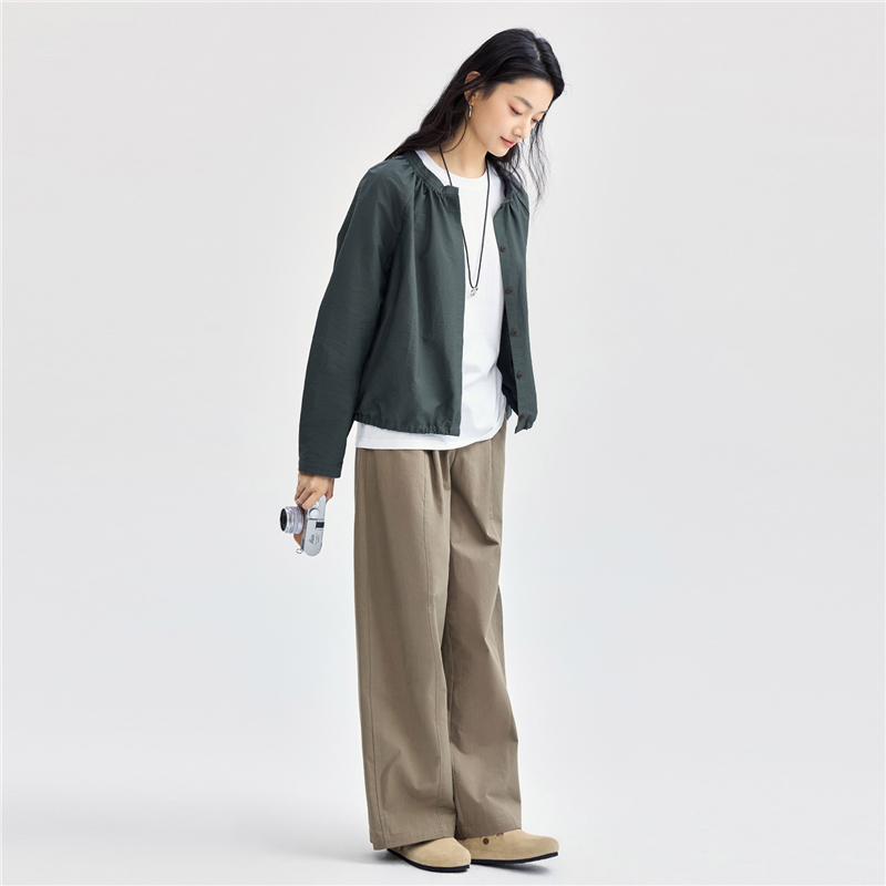 肌理挺阔混纺棉,质感细腻;圆领设计,收褶点缀,时尚美观;纽扣暗门襟,结实牢固,穿脱方便;绑带下摆,轻松调节,造型吸睛。温馨提示:由于批次不同,此款纽扣存在不同;不影响品质与舒适度,请放心选购。