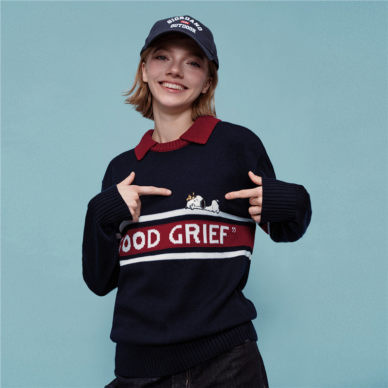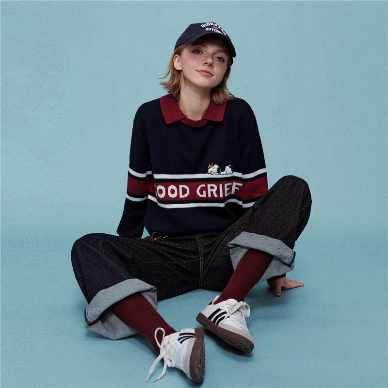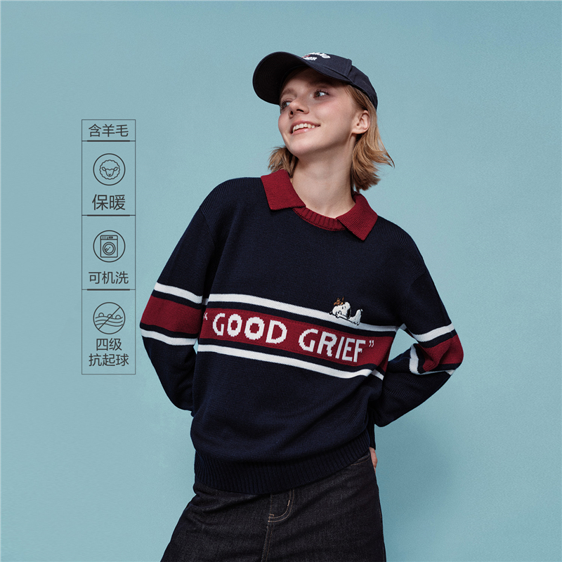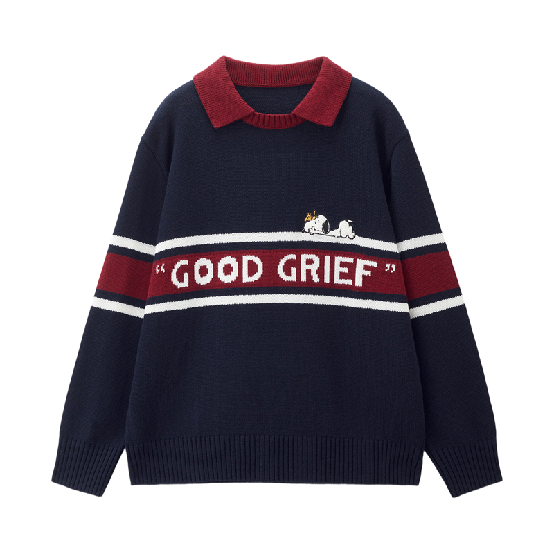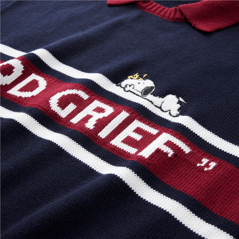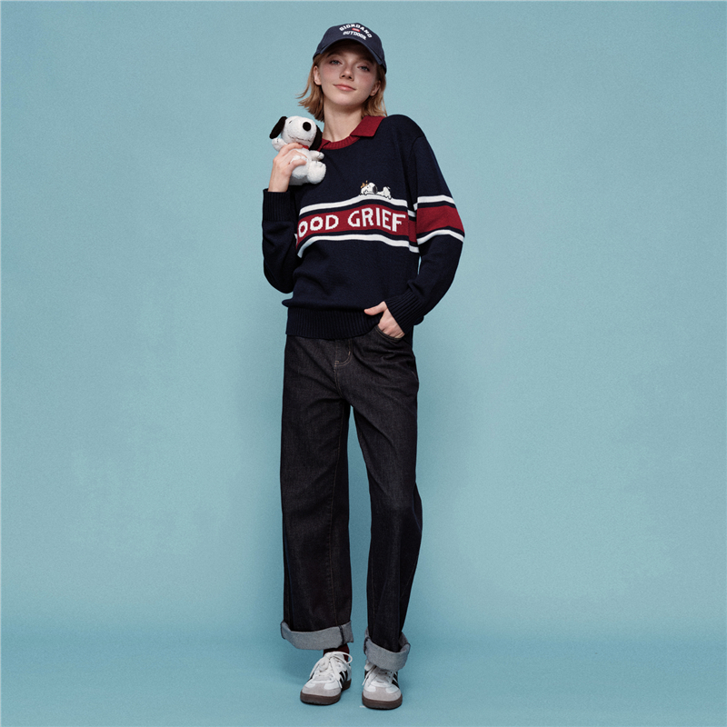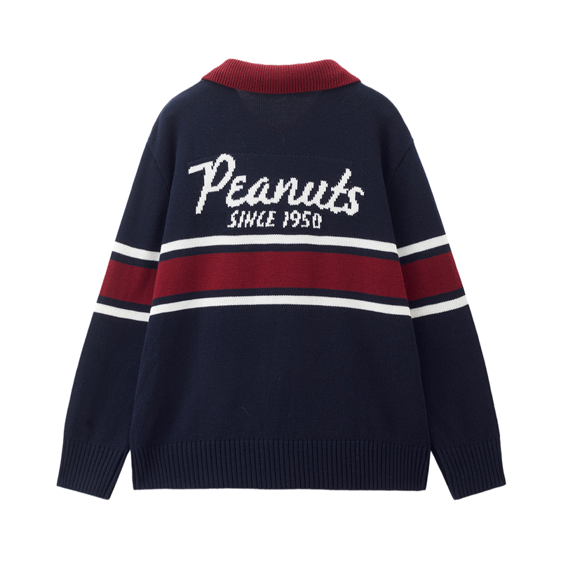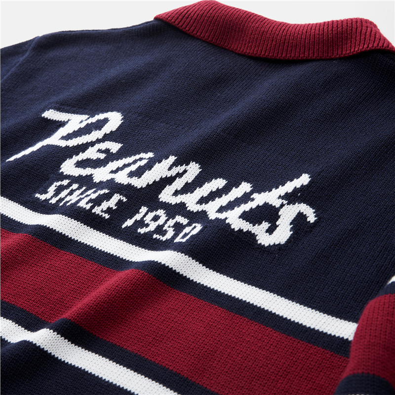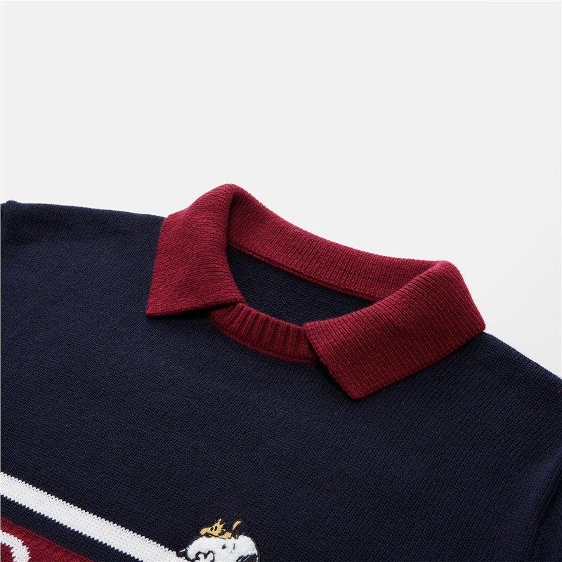 史努比联名刺绣提花撞色翻领套头针织衫