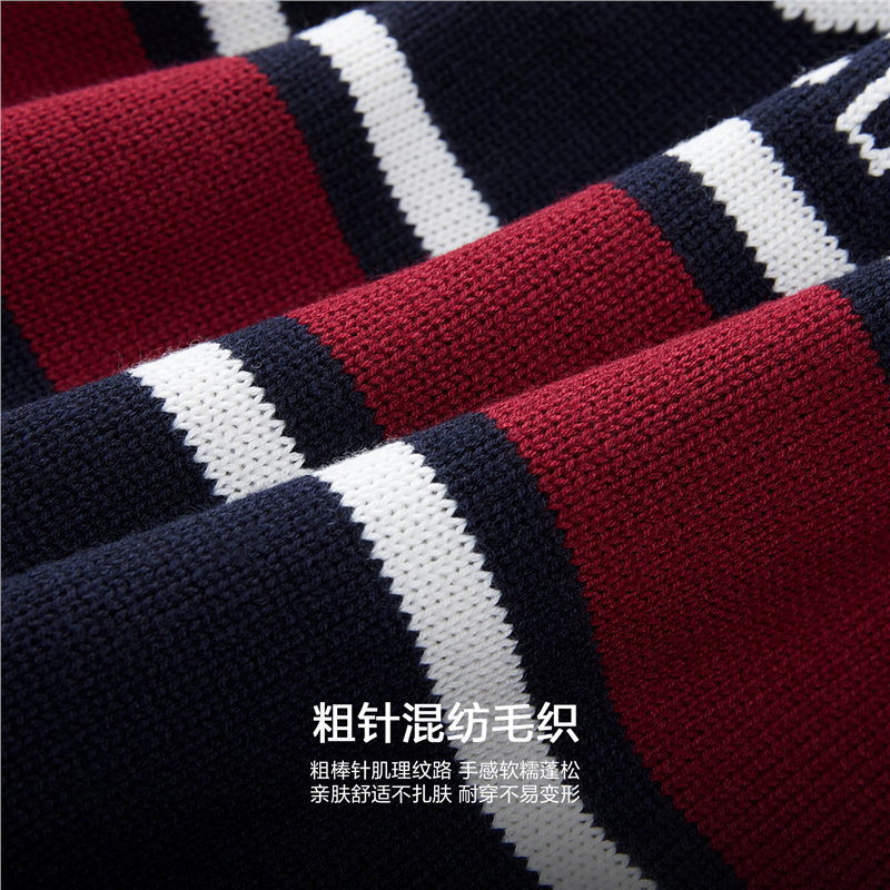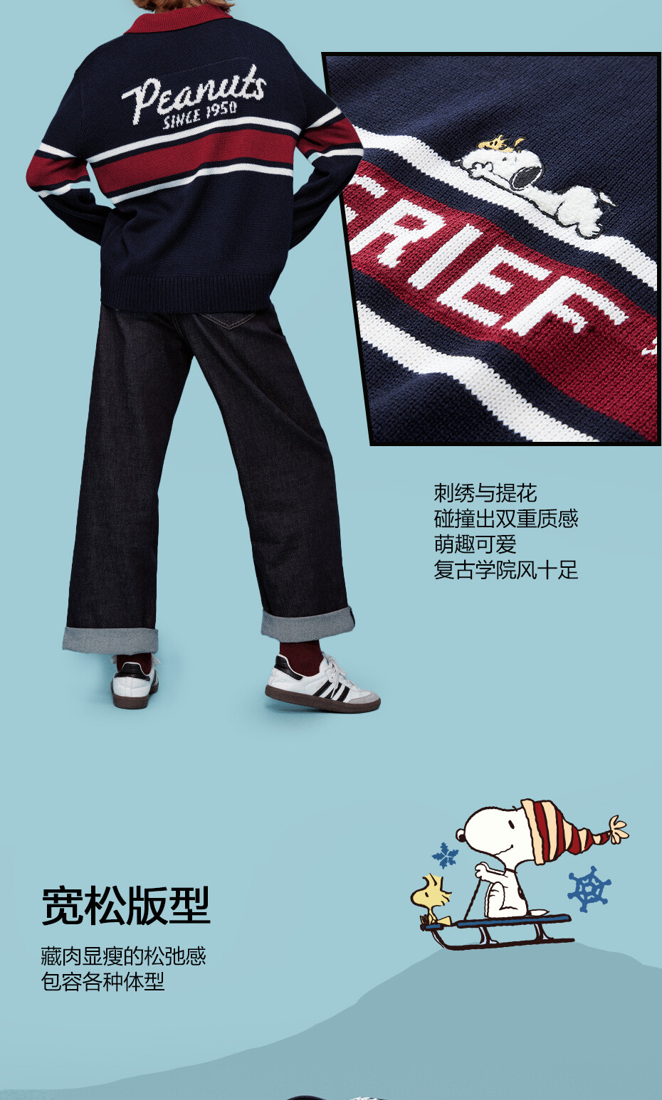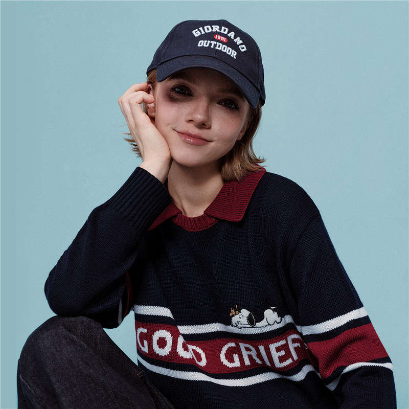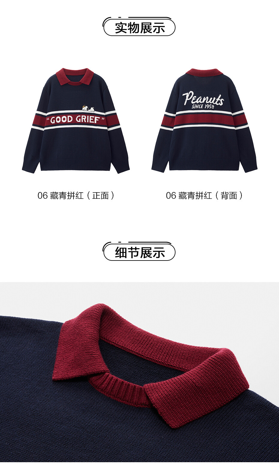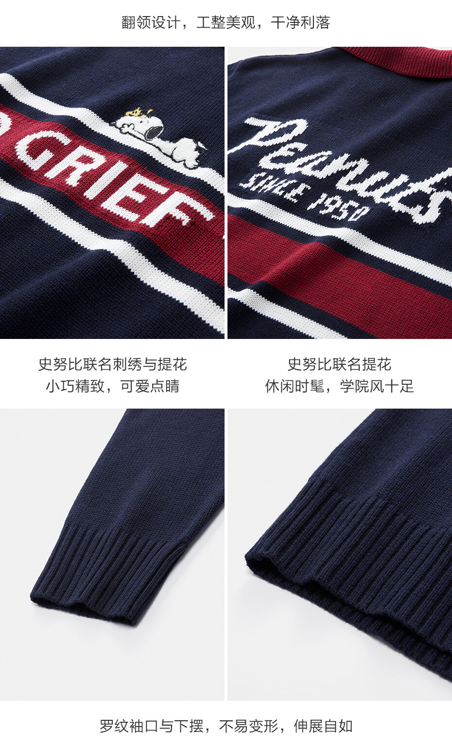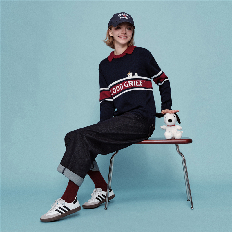 史努比联名刺绣提花撞色翻领套头针织衫