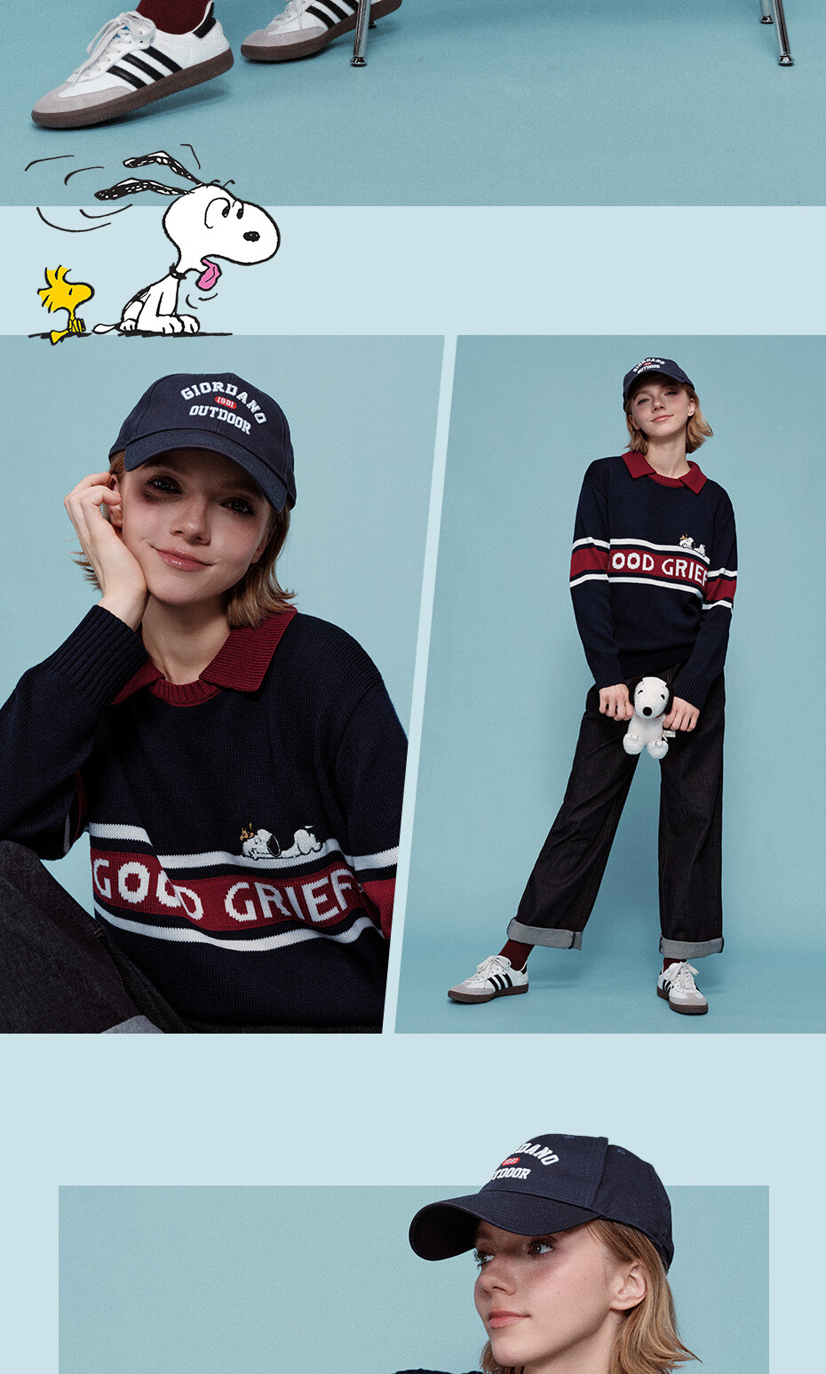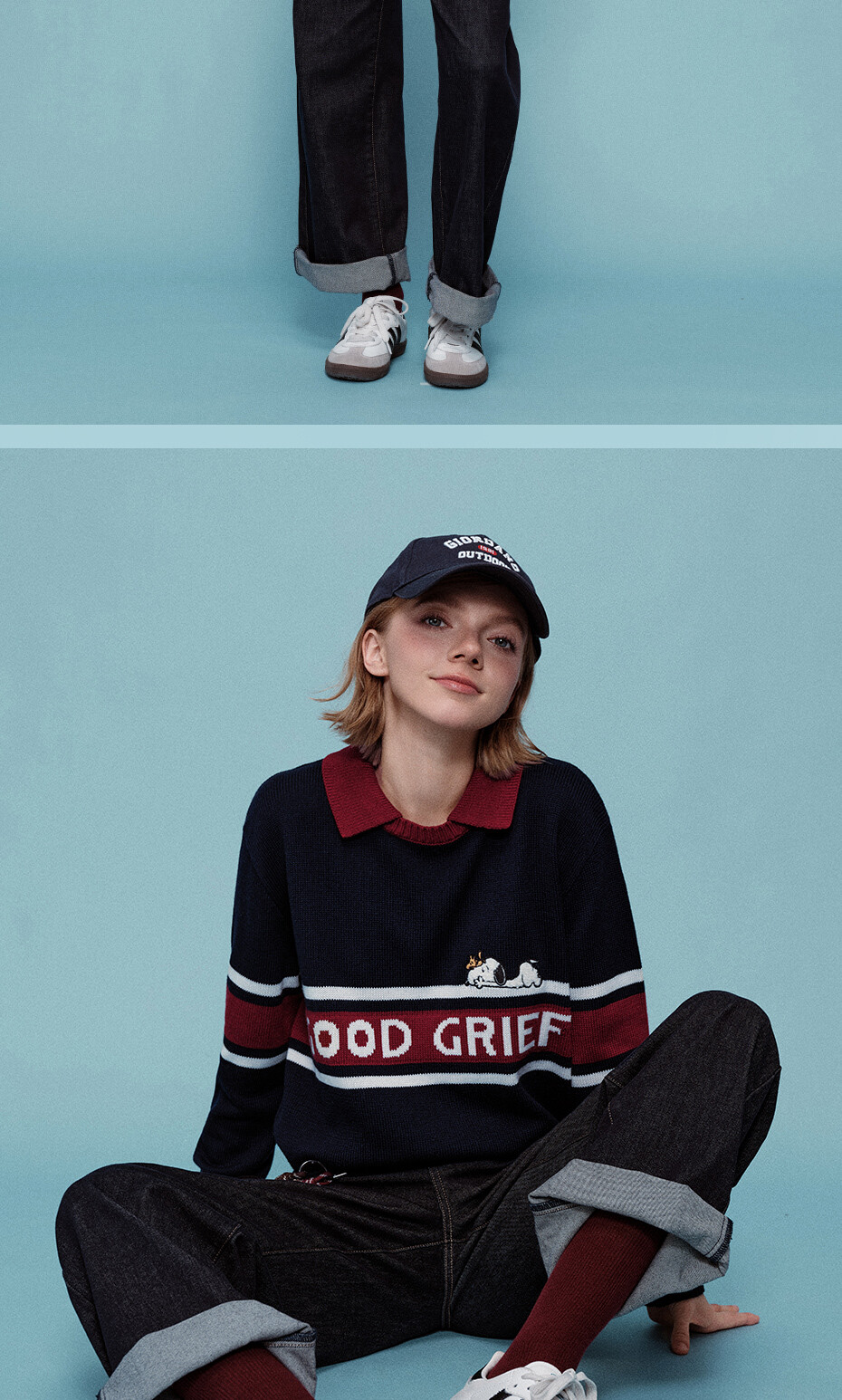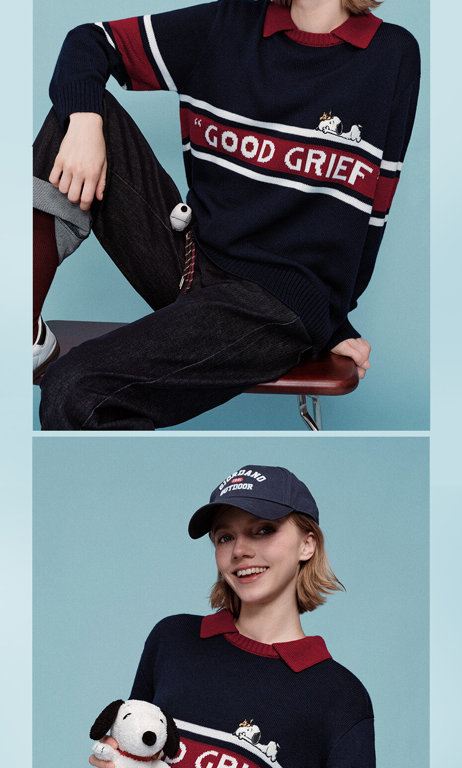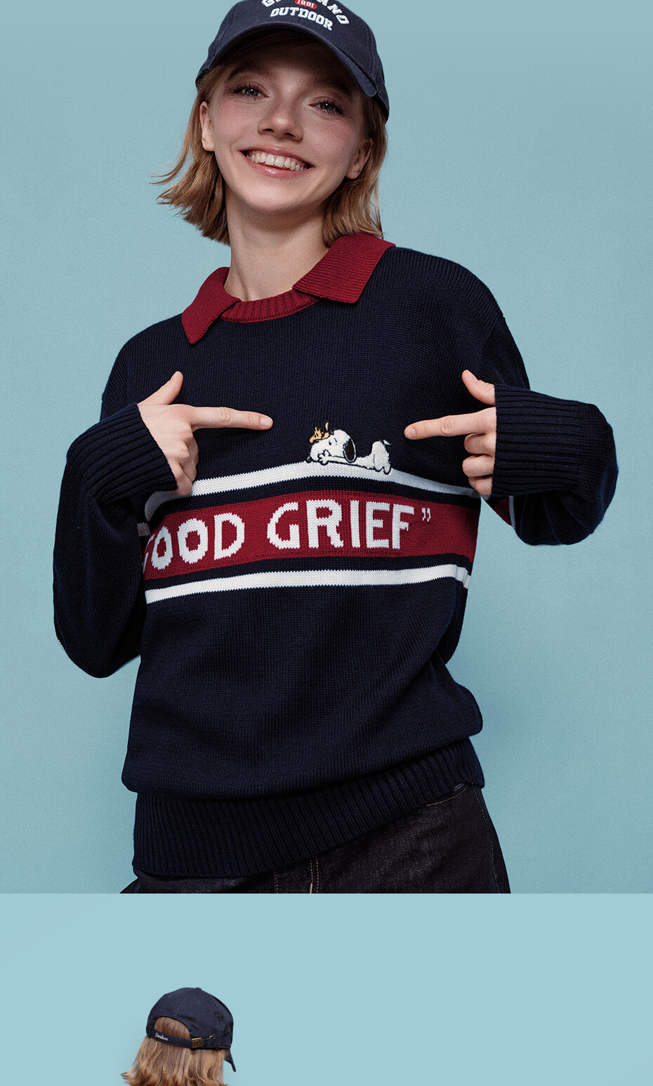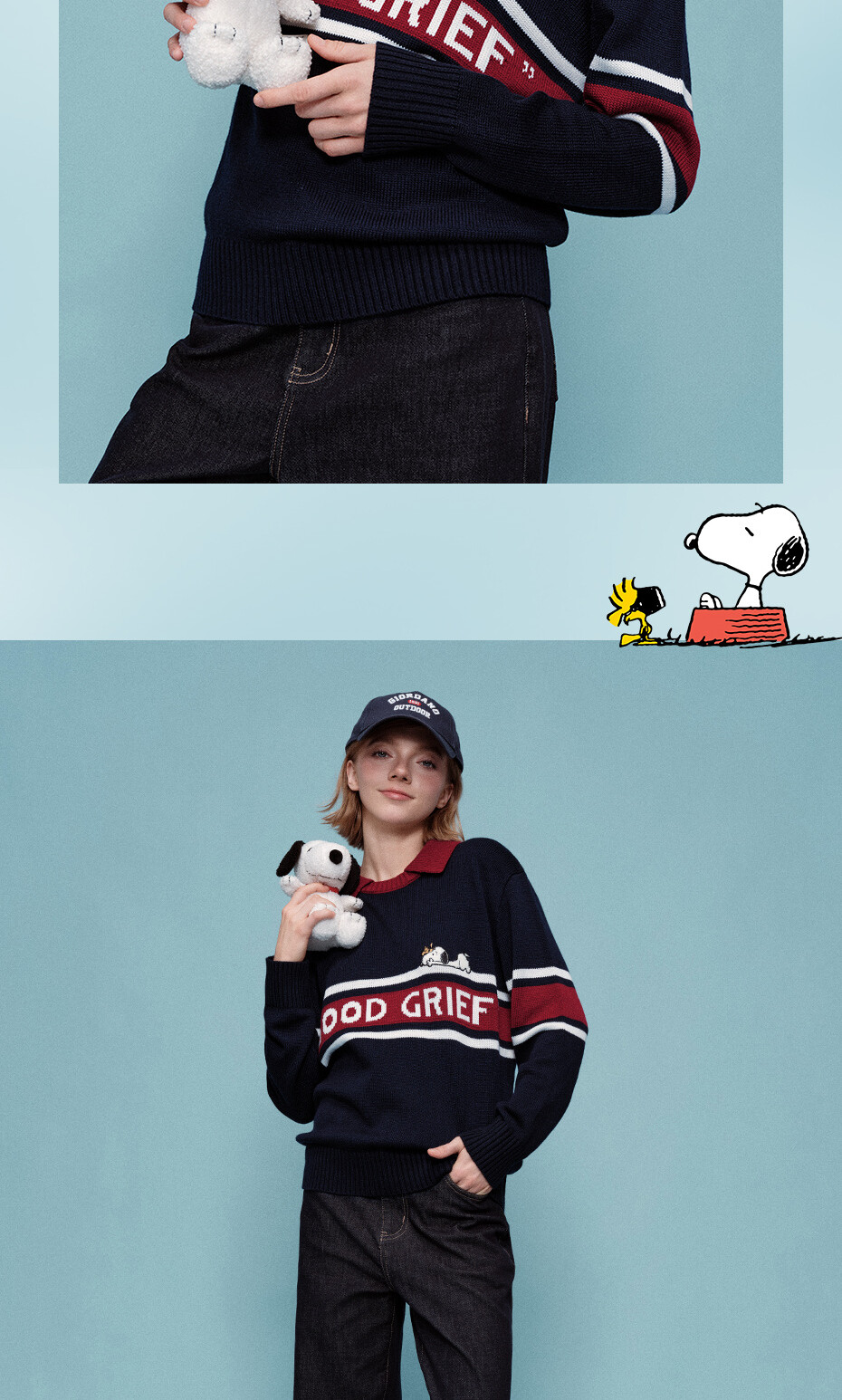 史努比联名刺绣提花撞色翻领套头针织衫