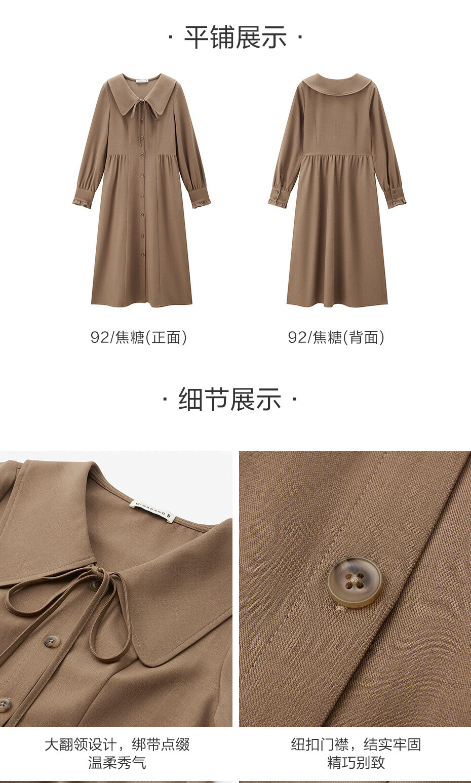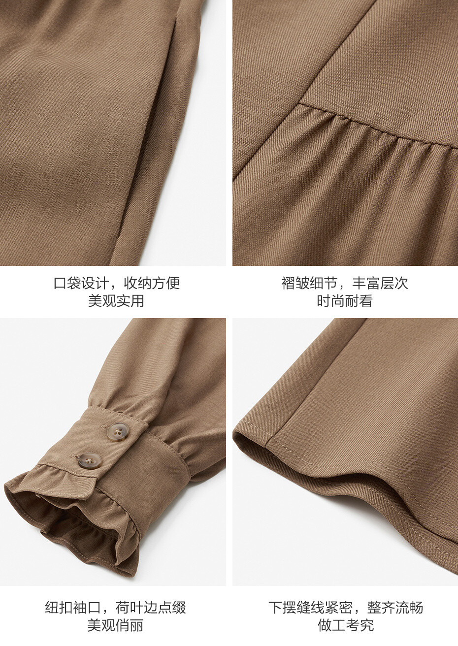 舒适西装料,质感细腻,挺括耐穿;大翻领设计,绑带点缀,温柔秀气;纽扣门襟,结实牢固,穿脱方便;纽扣袖口,荷叶边点缀,美观俏丽。