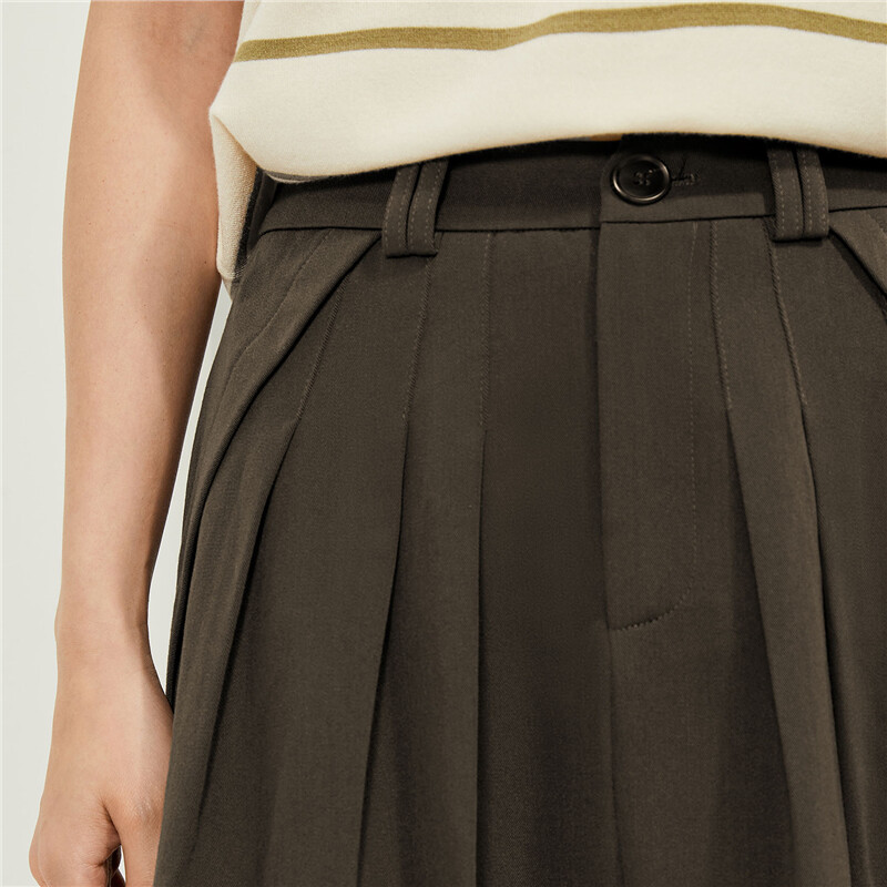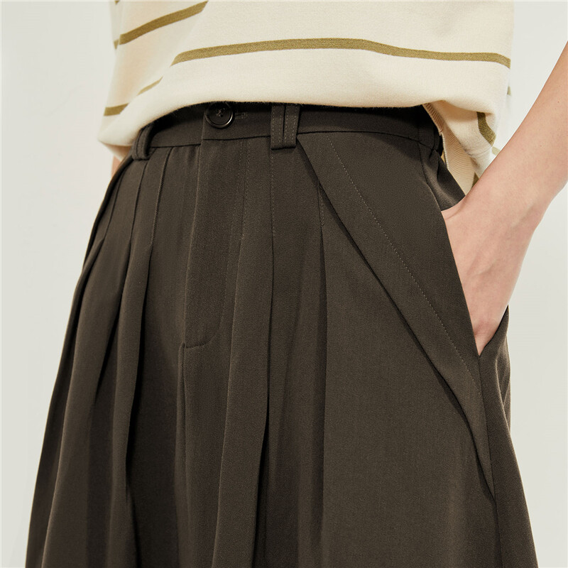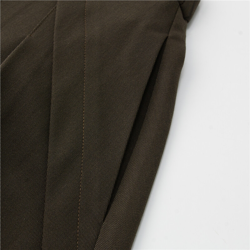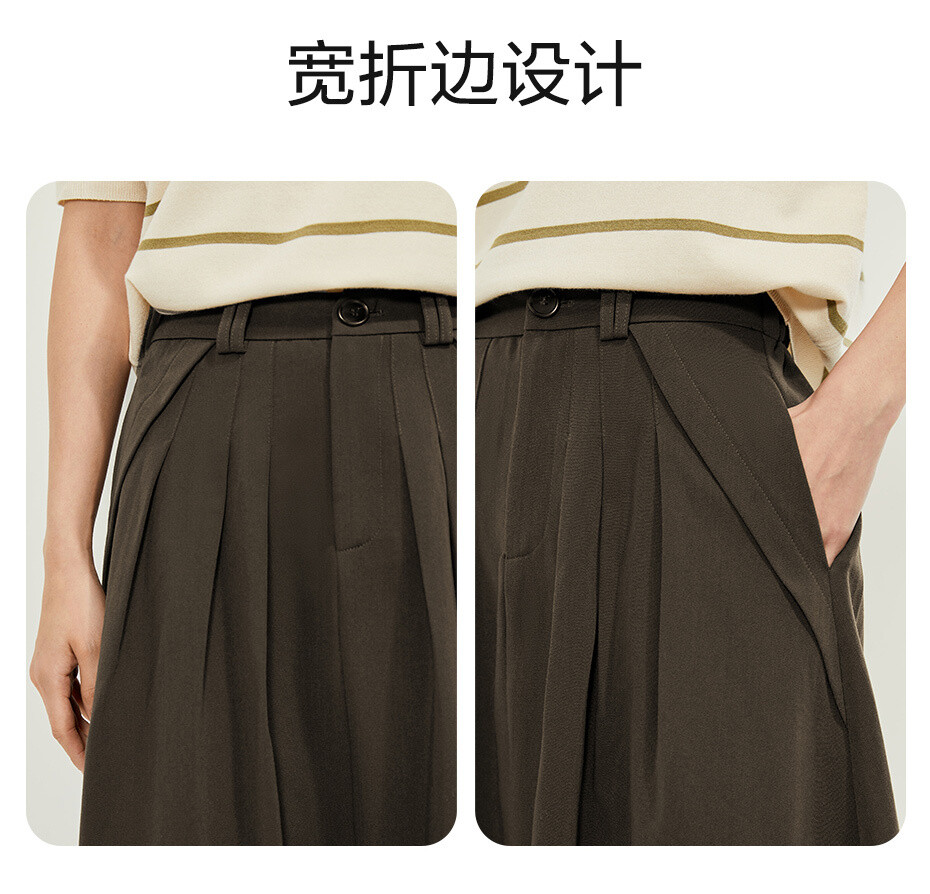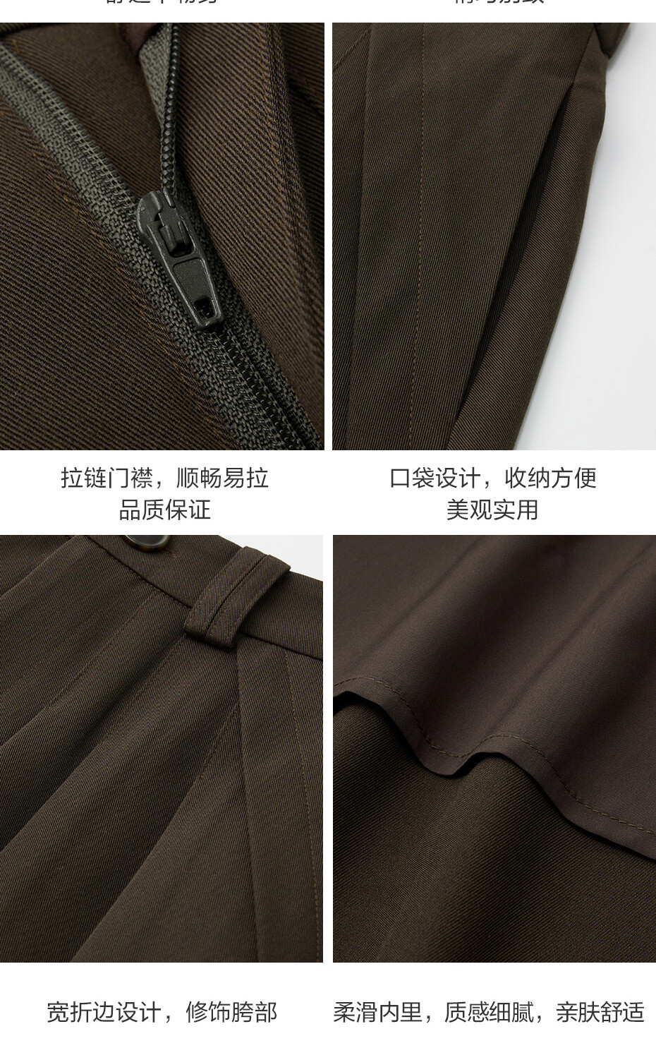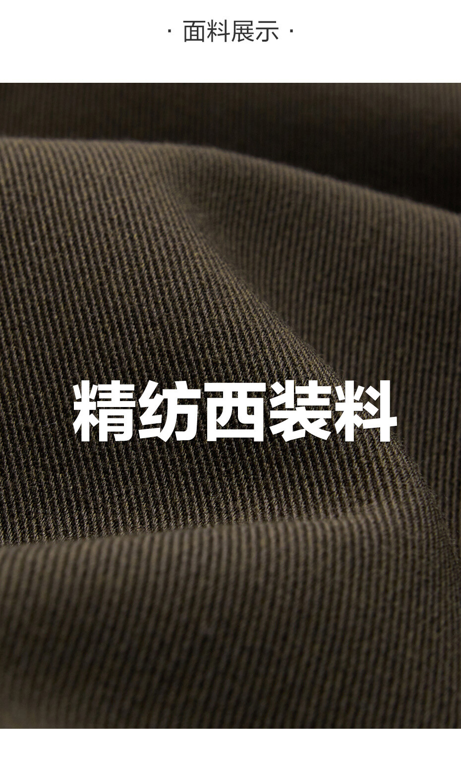 精纺西装料,柔软耐穿;半松紧腰头,包容有度,舒适不勒身;拉链门襟,顺畅易拉,品质保证;胯部拼接设计,丰富层次,修饰身形;口袋设计,收纳方便。
