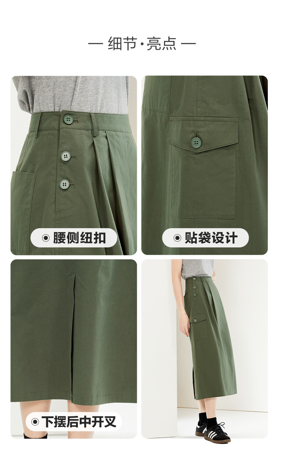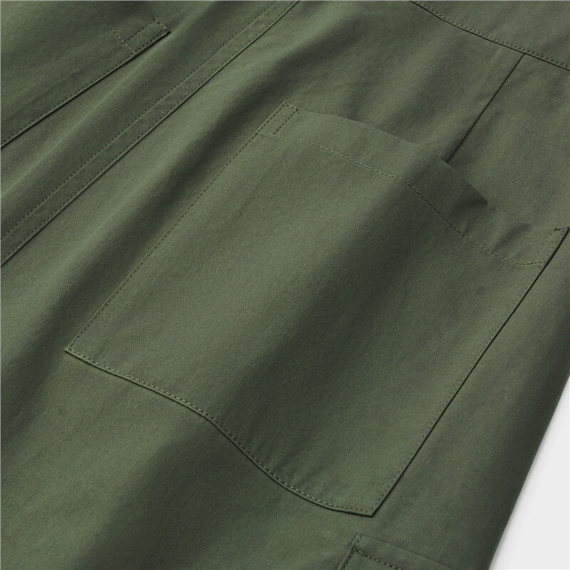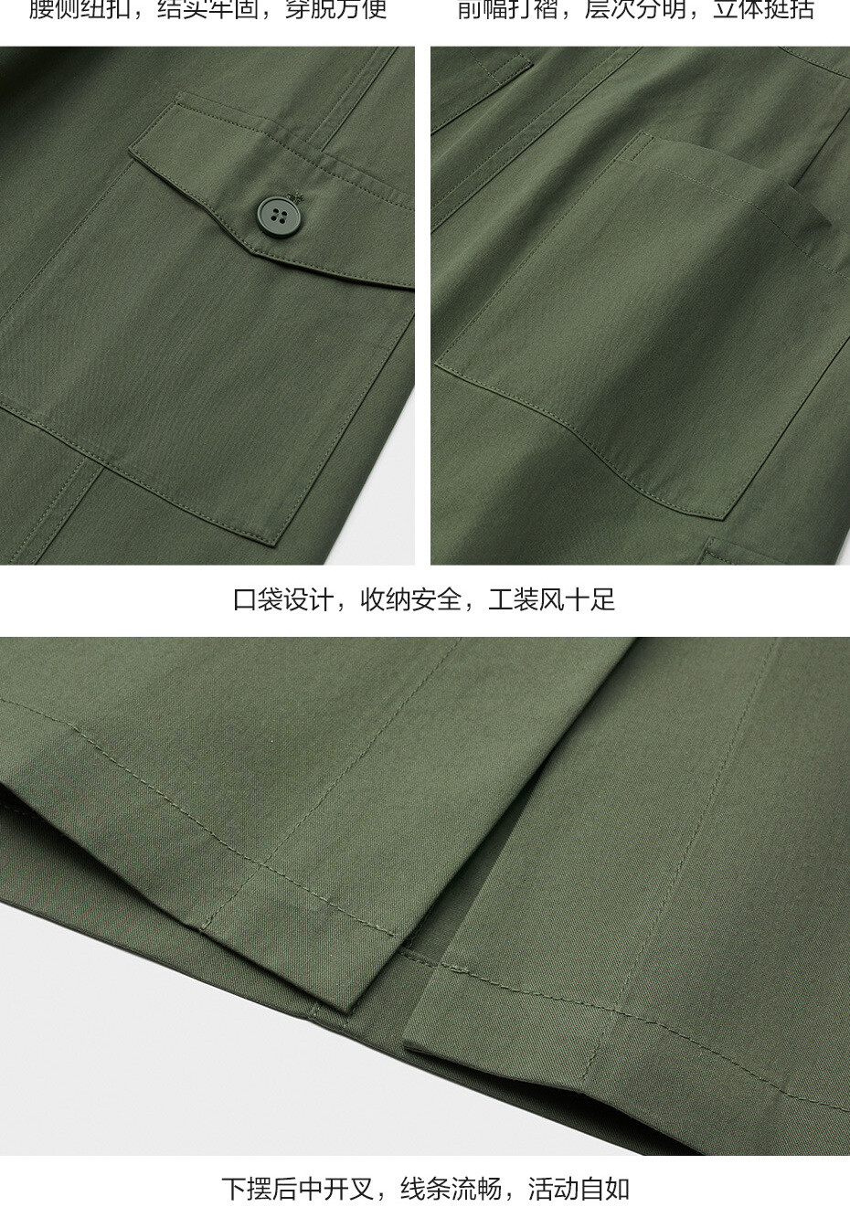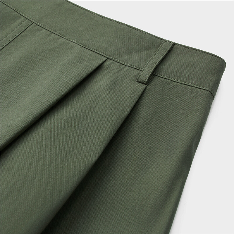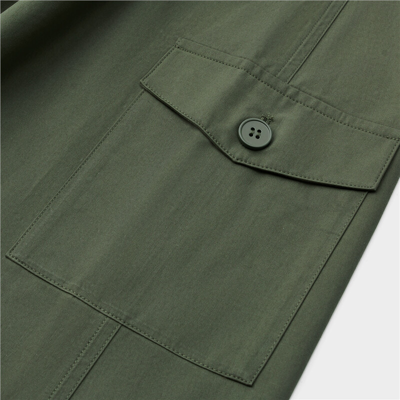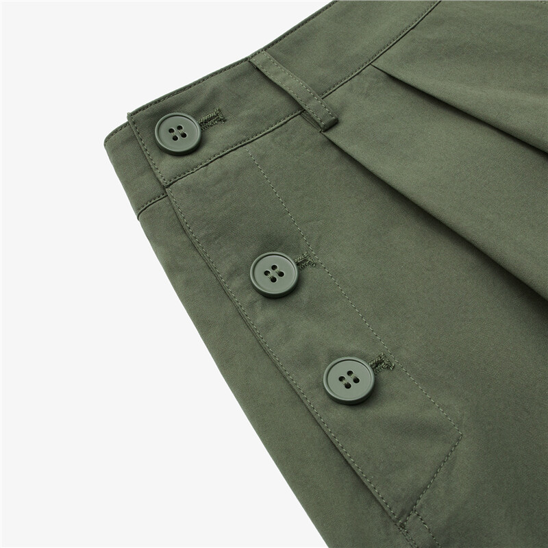 100%棉面料,质感细腻,舒适耐穿;腰侧纽扣,结实牢固,穿脱方便;前幅打褶,层次分明,立体挺括;戴盖口袋,收纳安全,工装风十足。温馨提示:页面腰带仅作搭配展示,所售商品不含腰带。