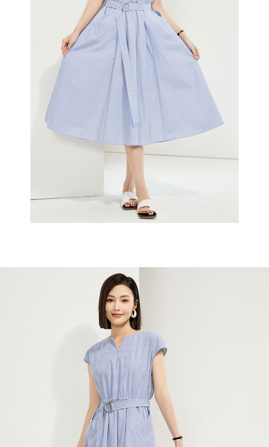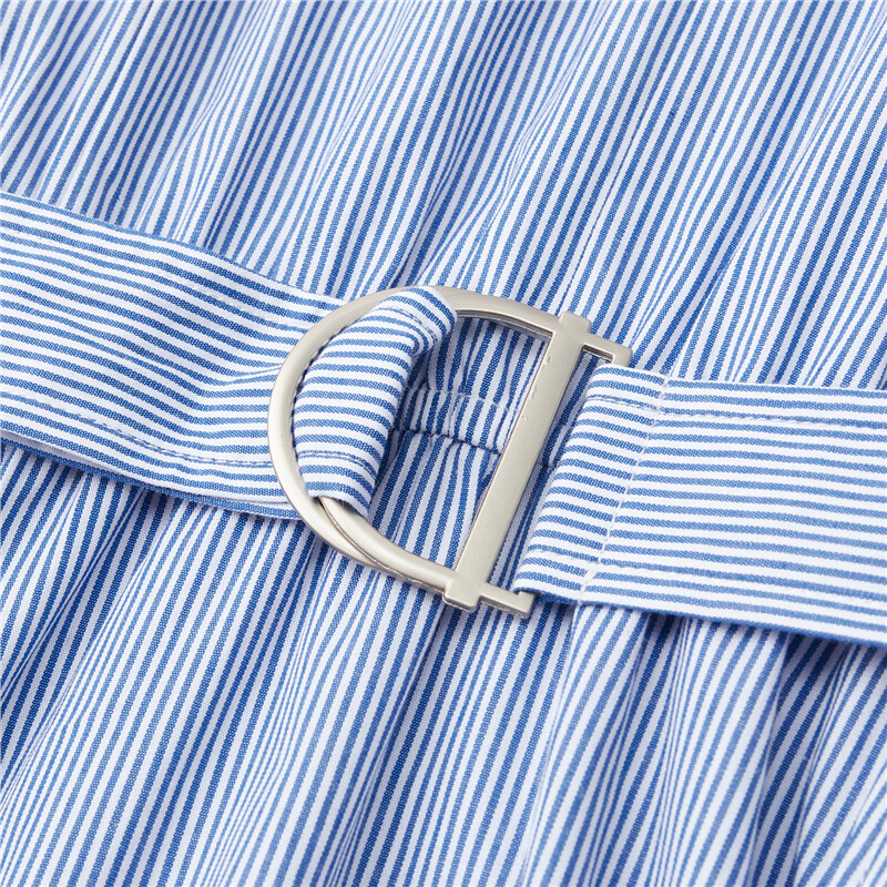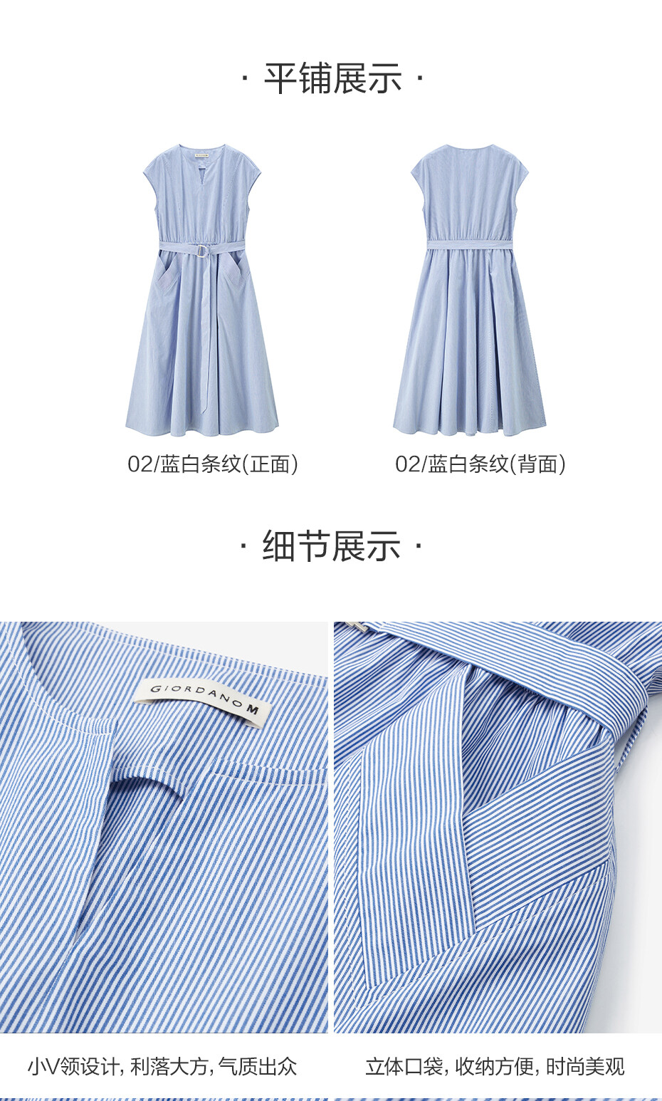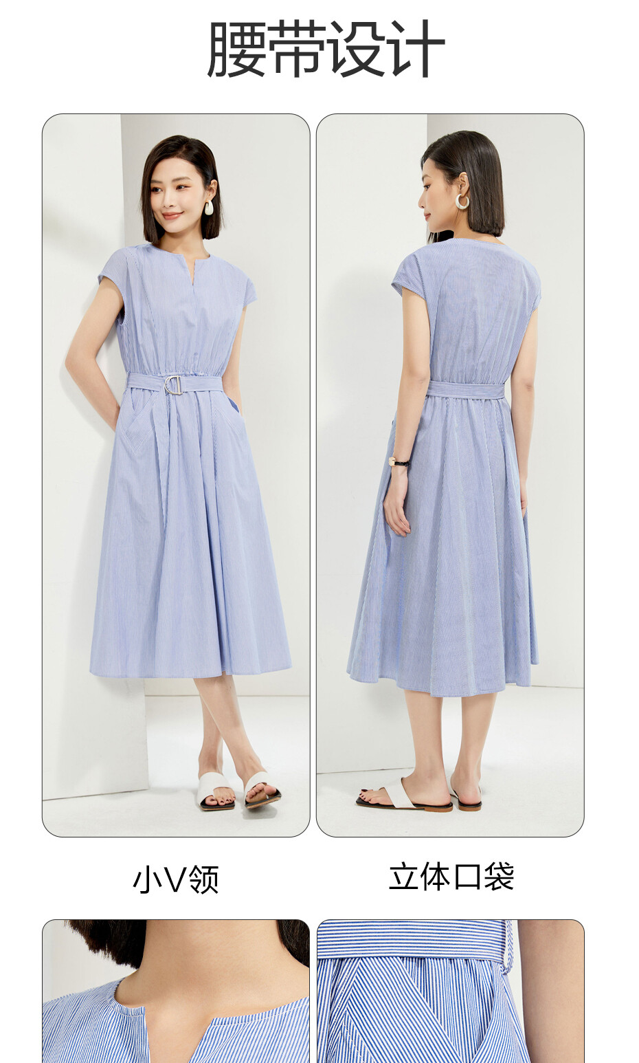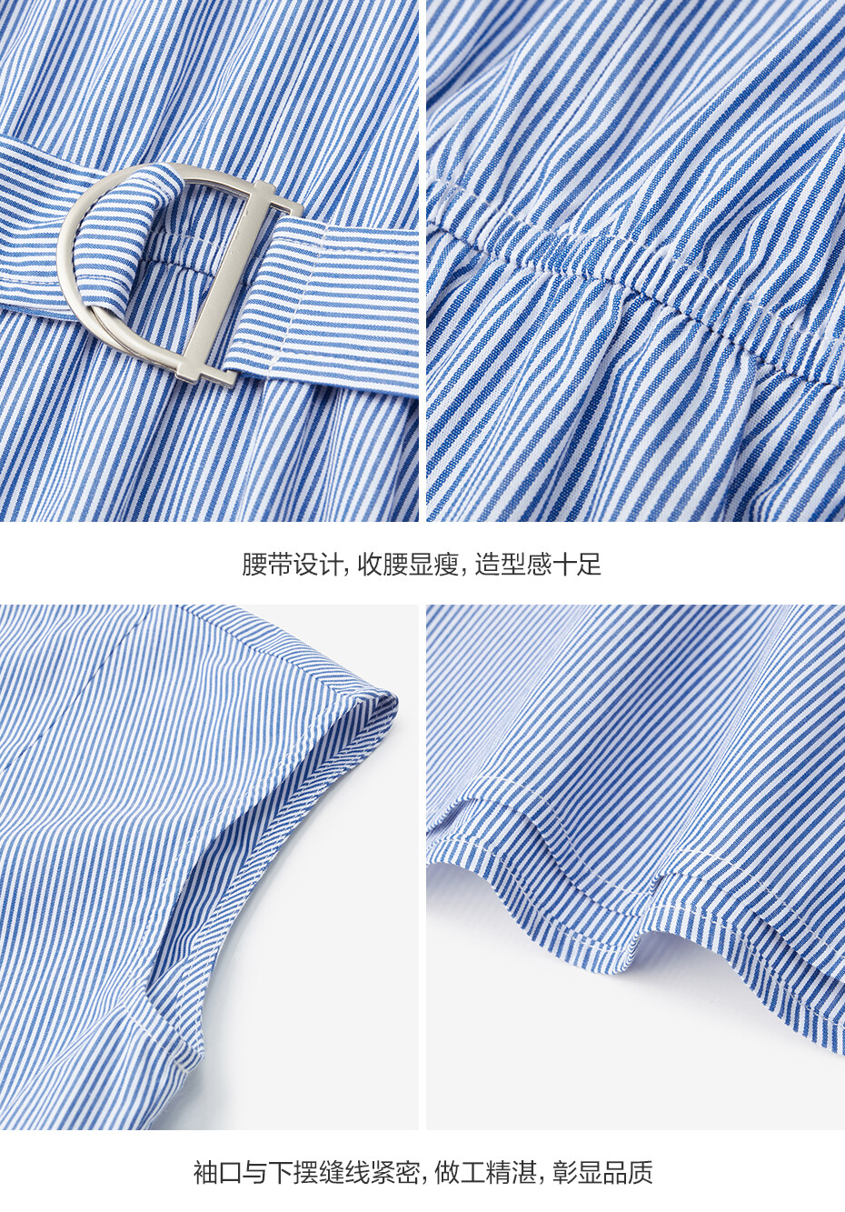 条纹梭织面料,质感细腻;小V领设计,利落大方,气质出众;腰带设计,收腰显瘦,造型感十足;立体口袋,收纳方便,时尚美观。