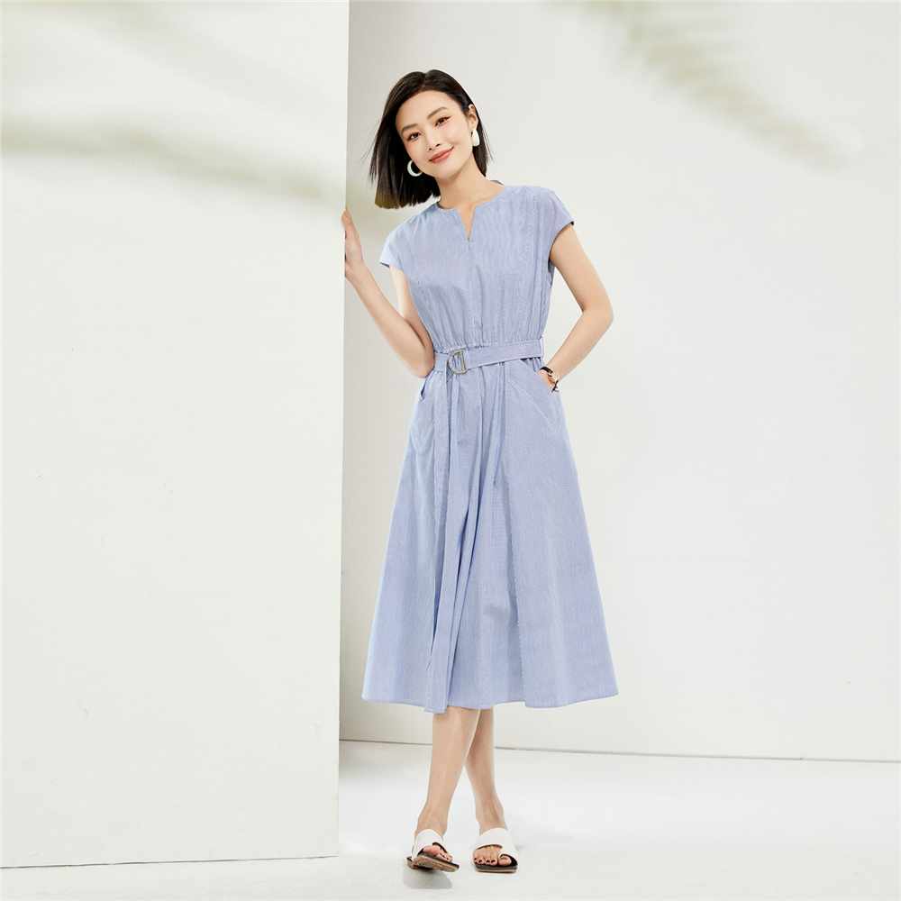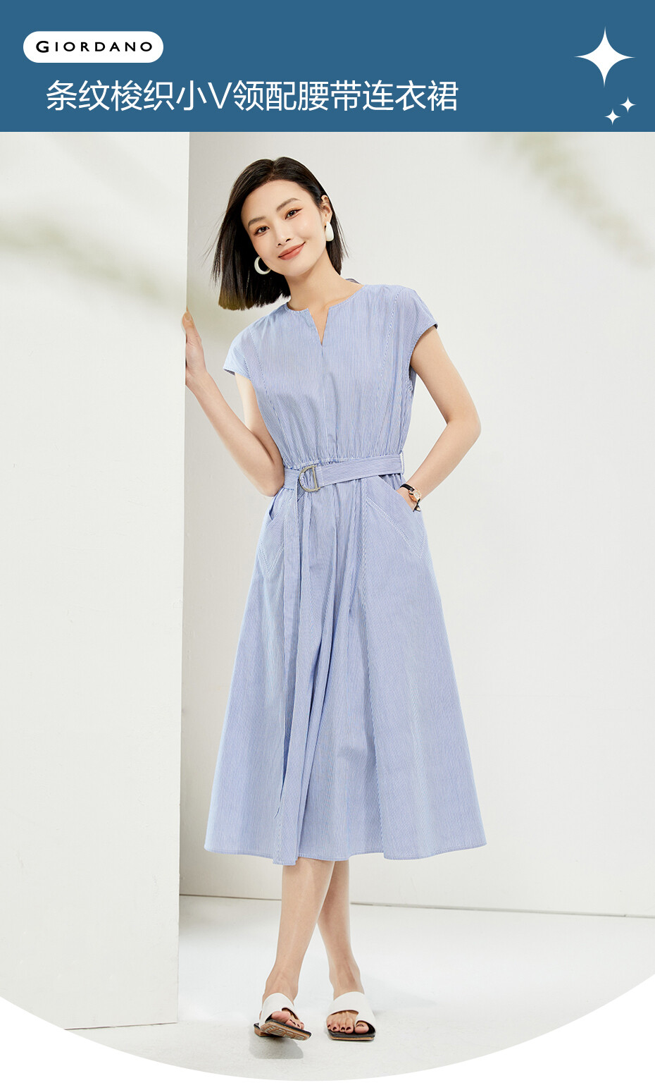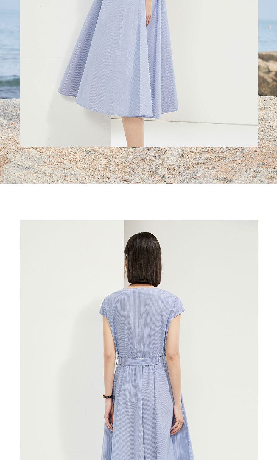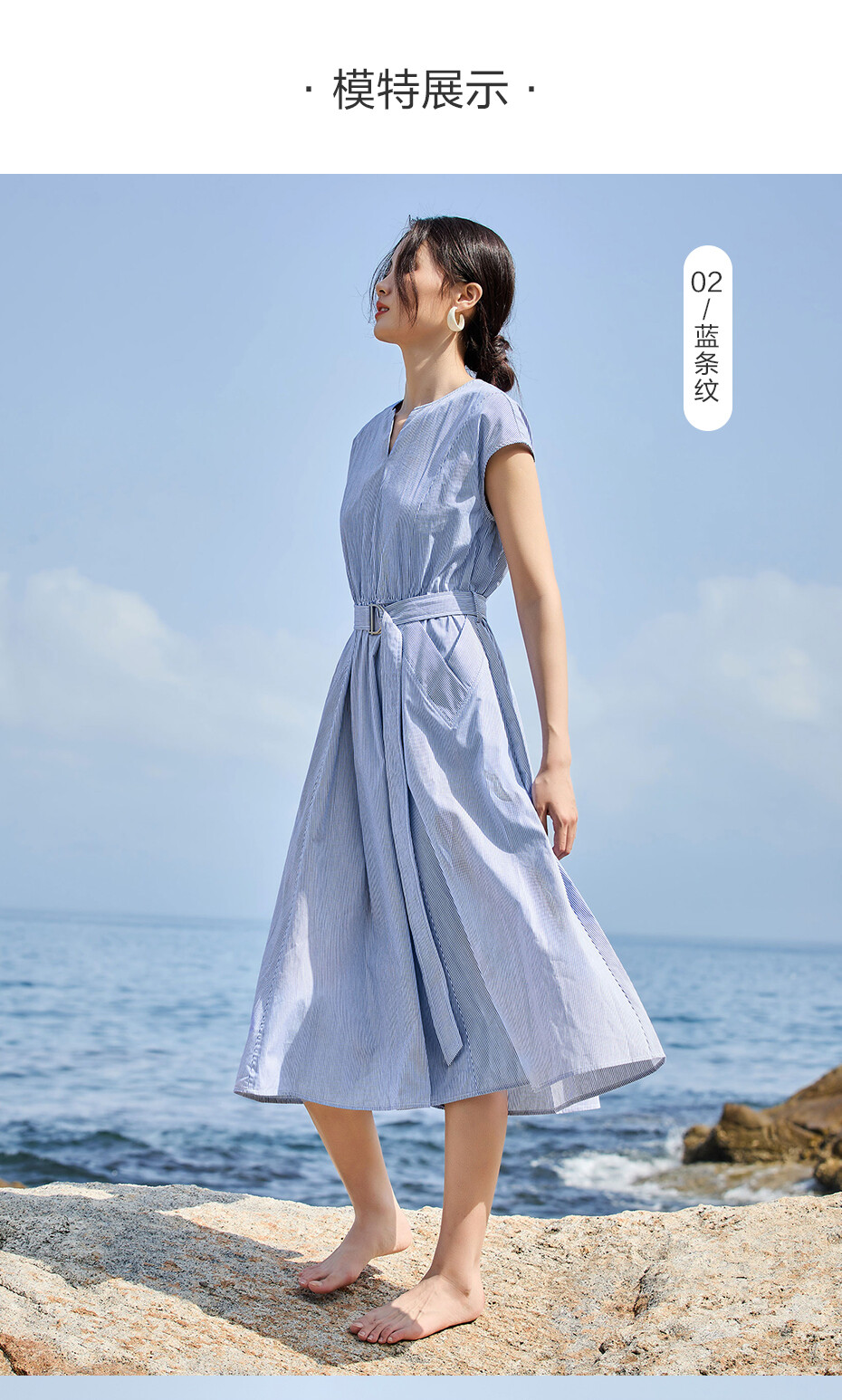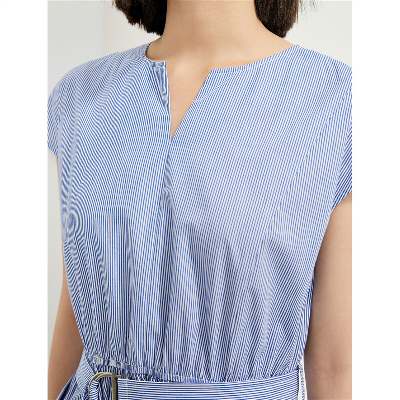 条纹梭织面料,质感细腻;小V领设计,利落大方,气质出众;腰带设计,收腰显瘦,造型感十足;立体口袋,收纳方便,时尚美观。