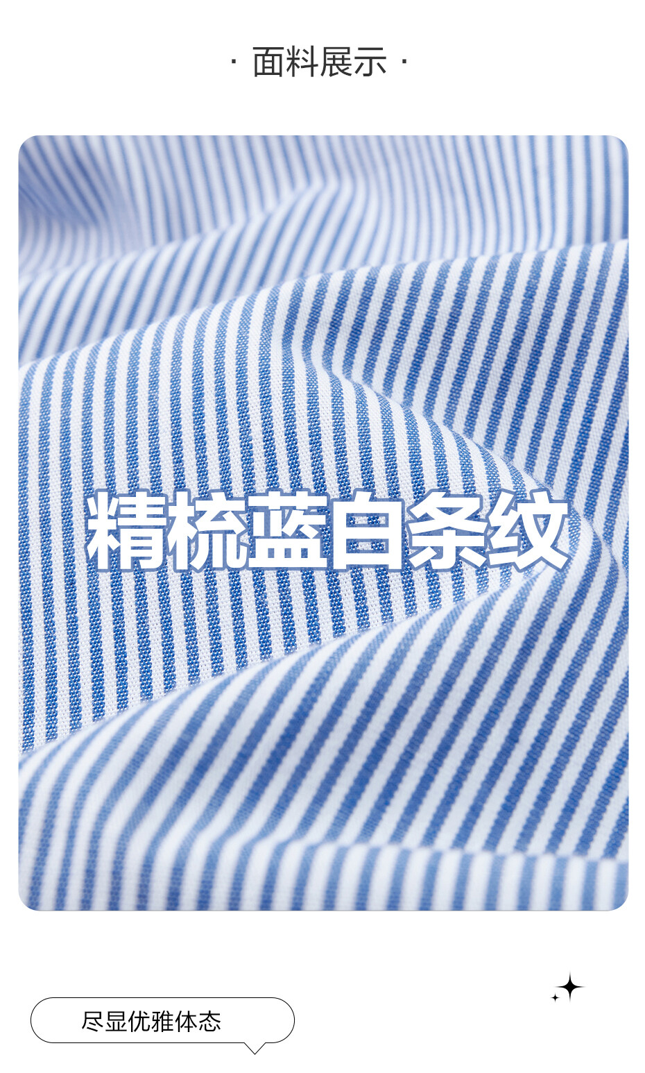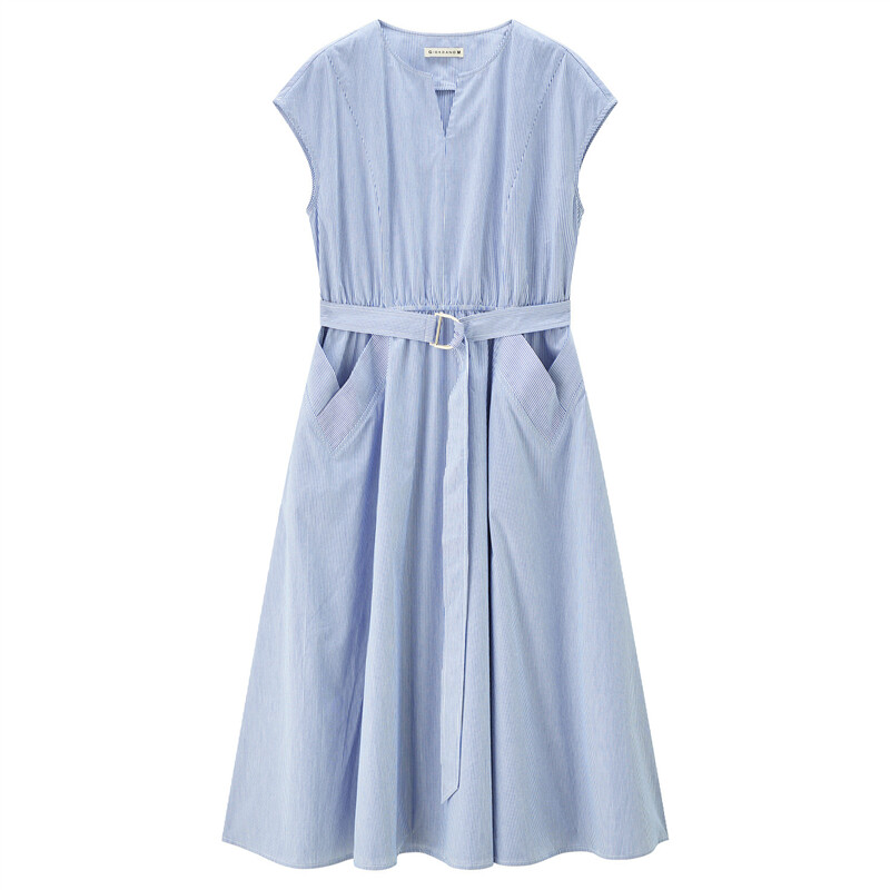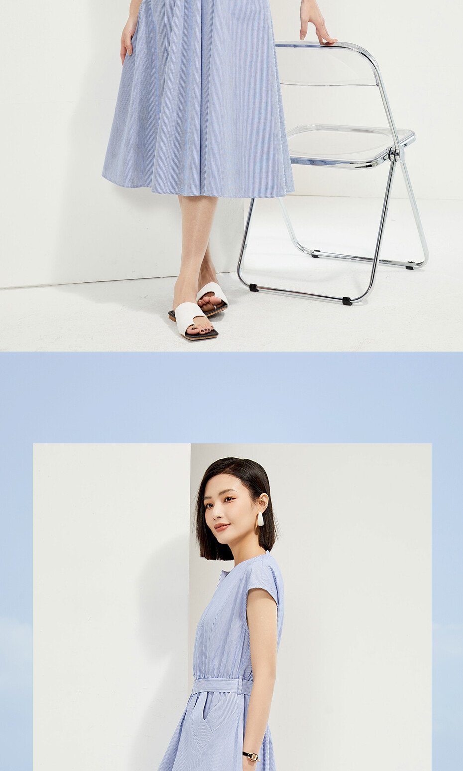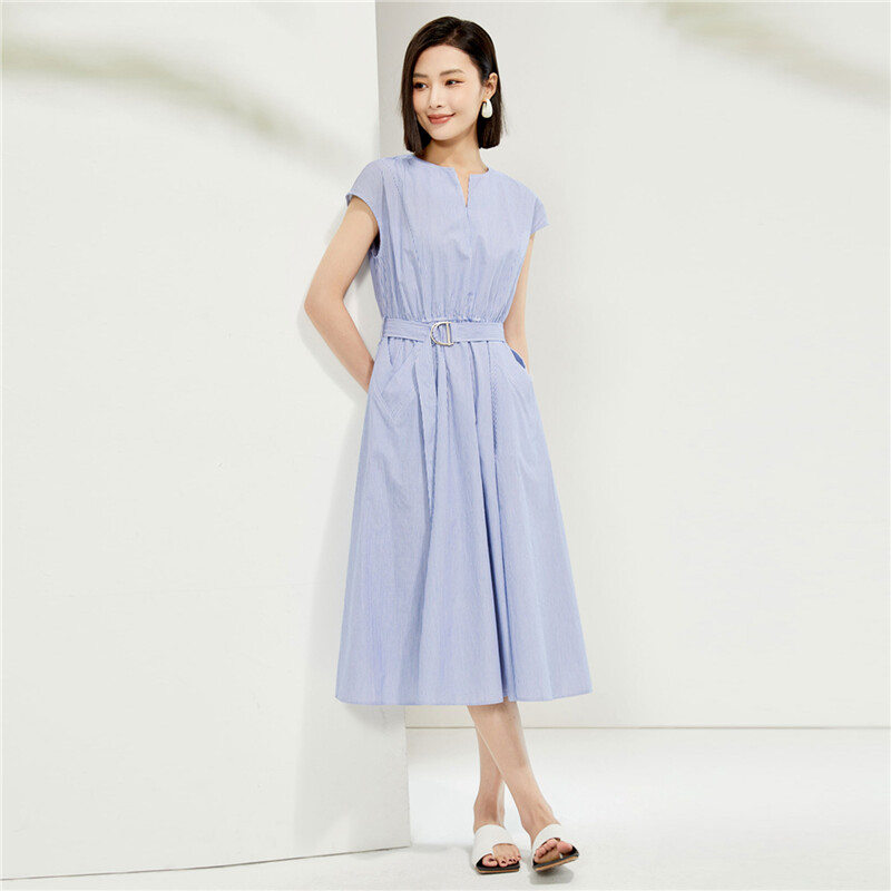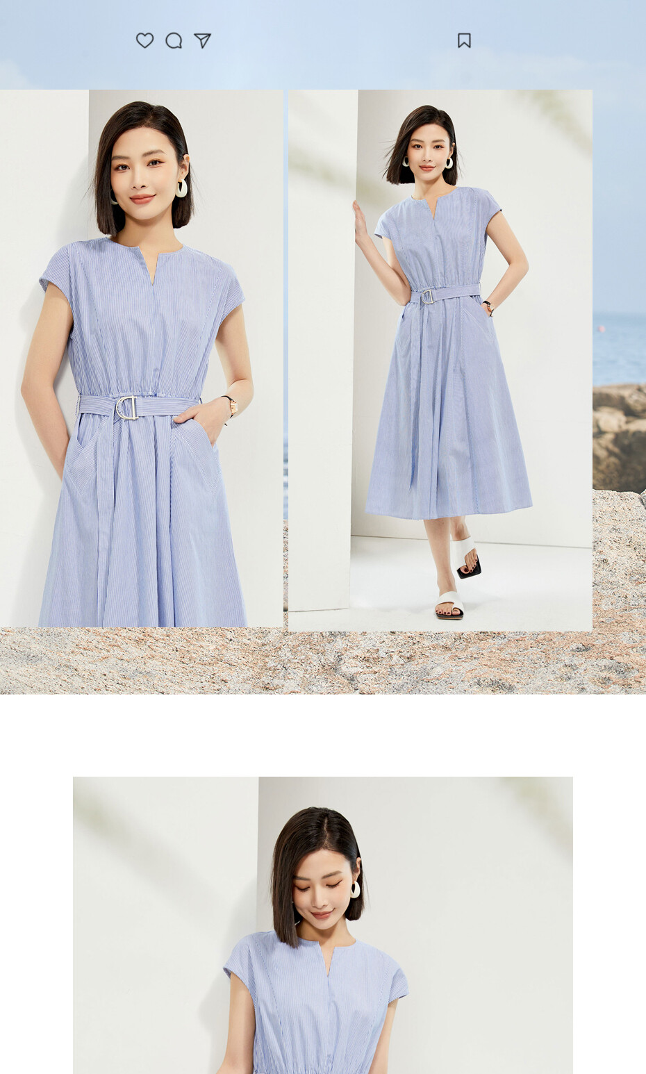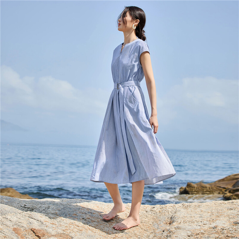 条纹梭织面料,质感细腻;小V领设计,利落大方,气质出众;腰带设计,收腰显瘦,造型感十足;立体口袋,收纳方便,时尚美观。