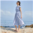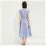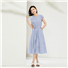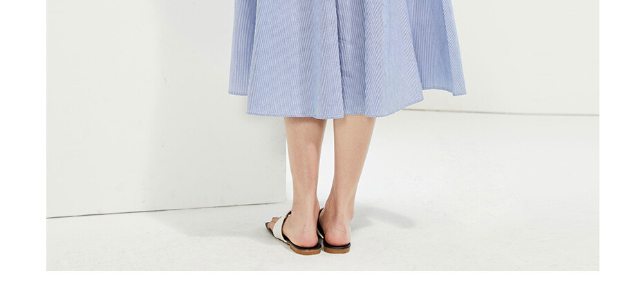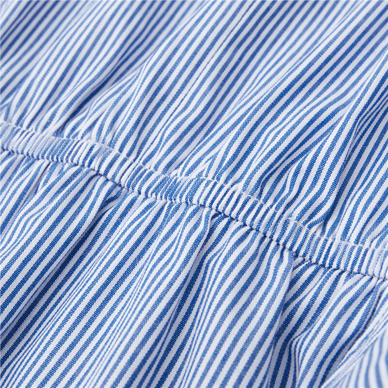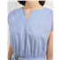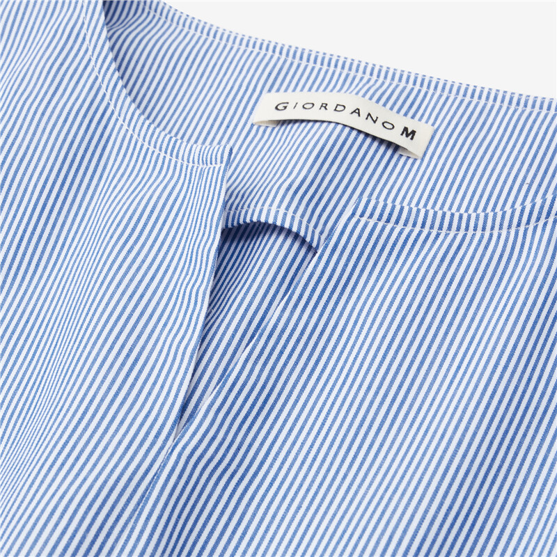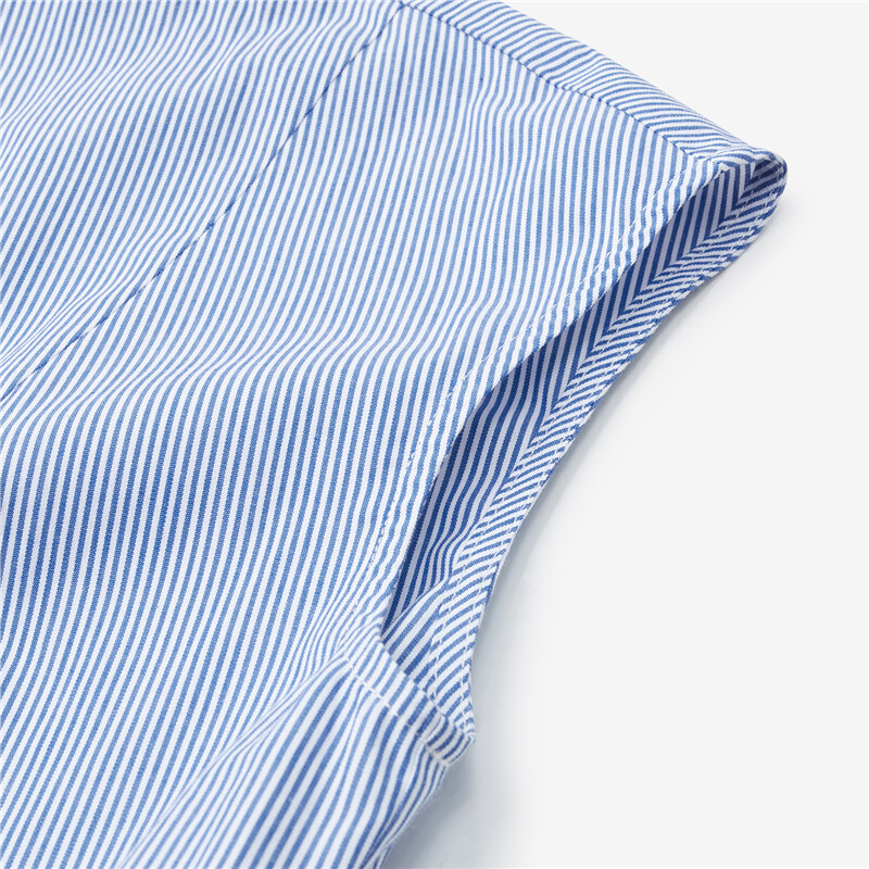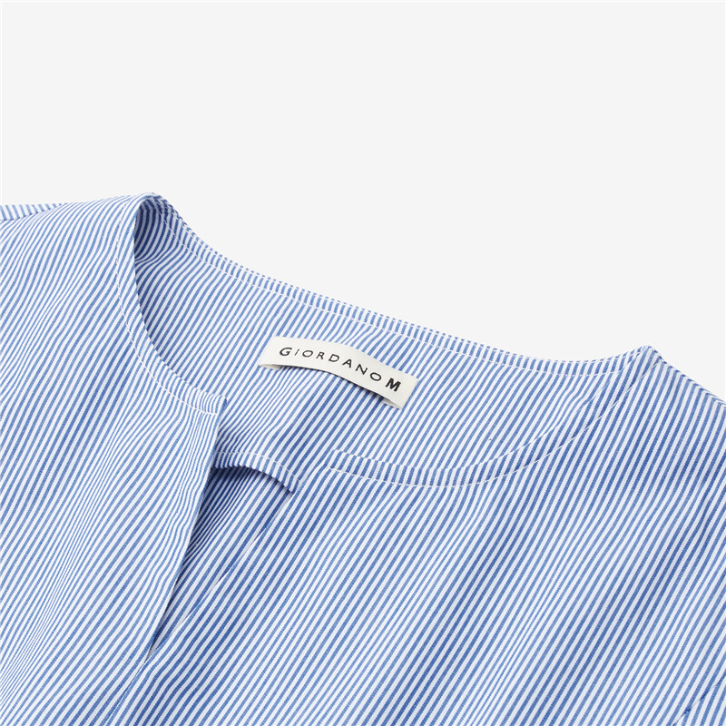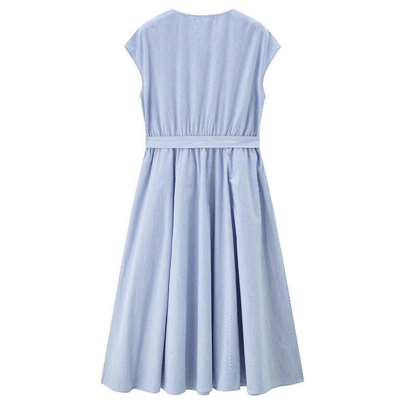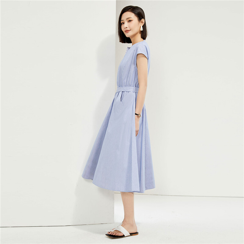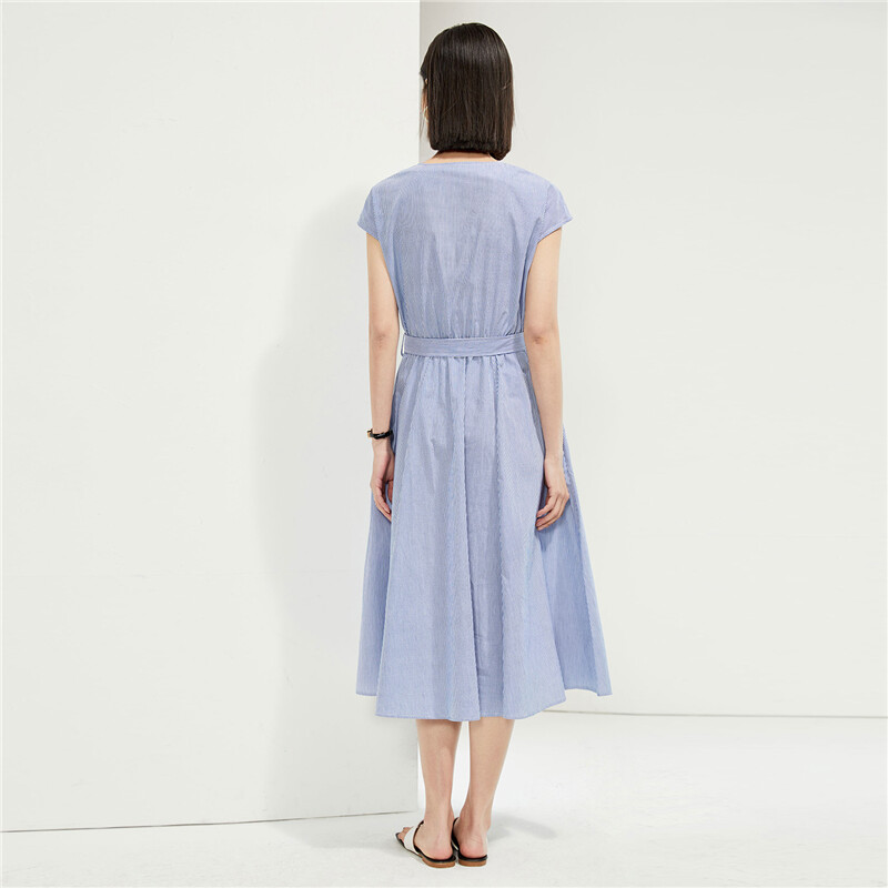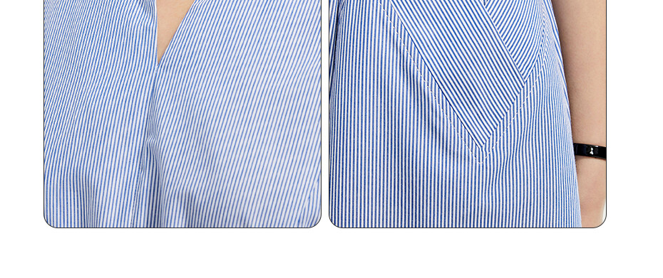 条纹梭织面料,质感细腻;小V领设计,利落大方,气质出众;腰带设计,收腰显瘦,造型感十足;立体口袋,收纳方便,时尚美观。