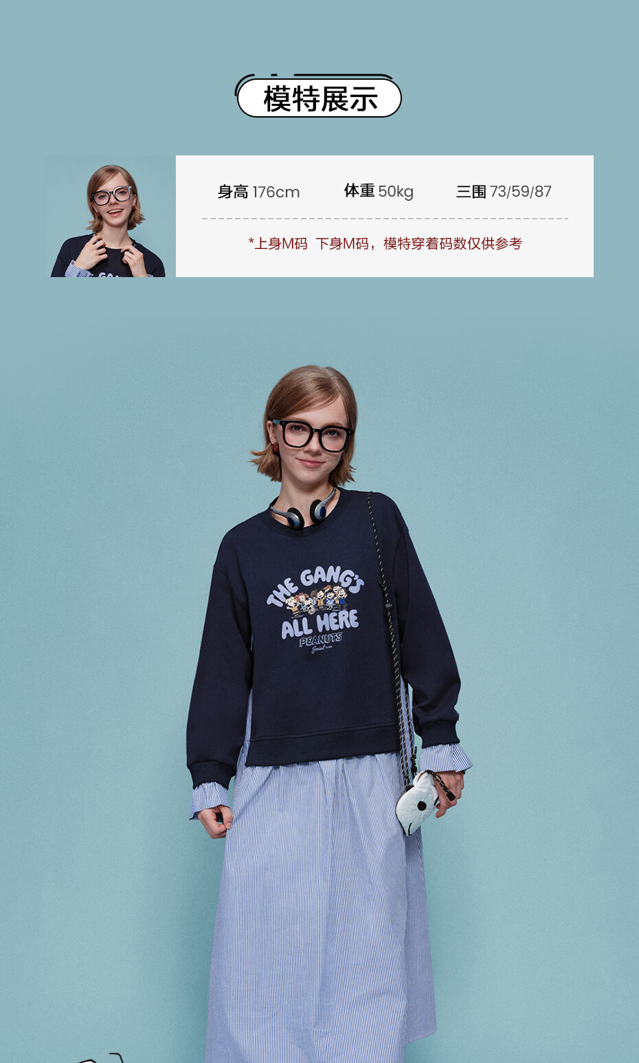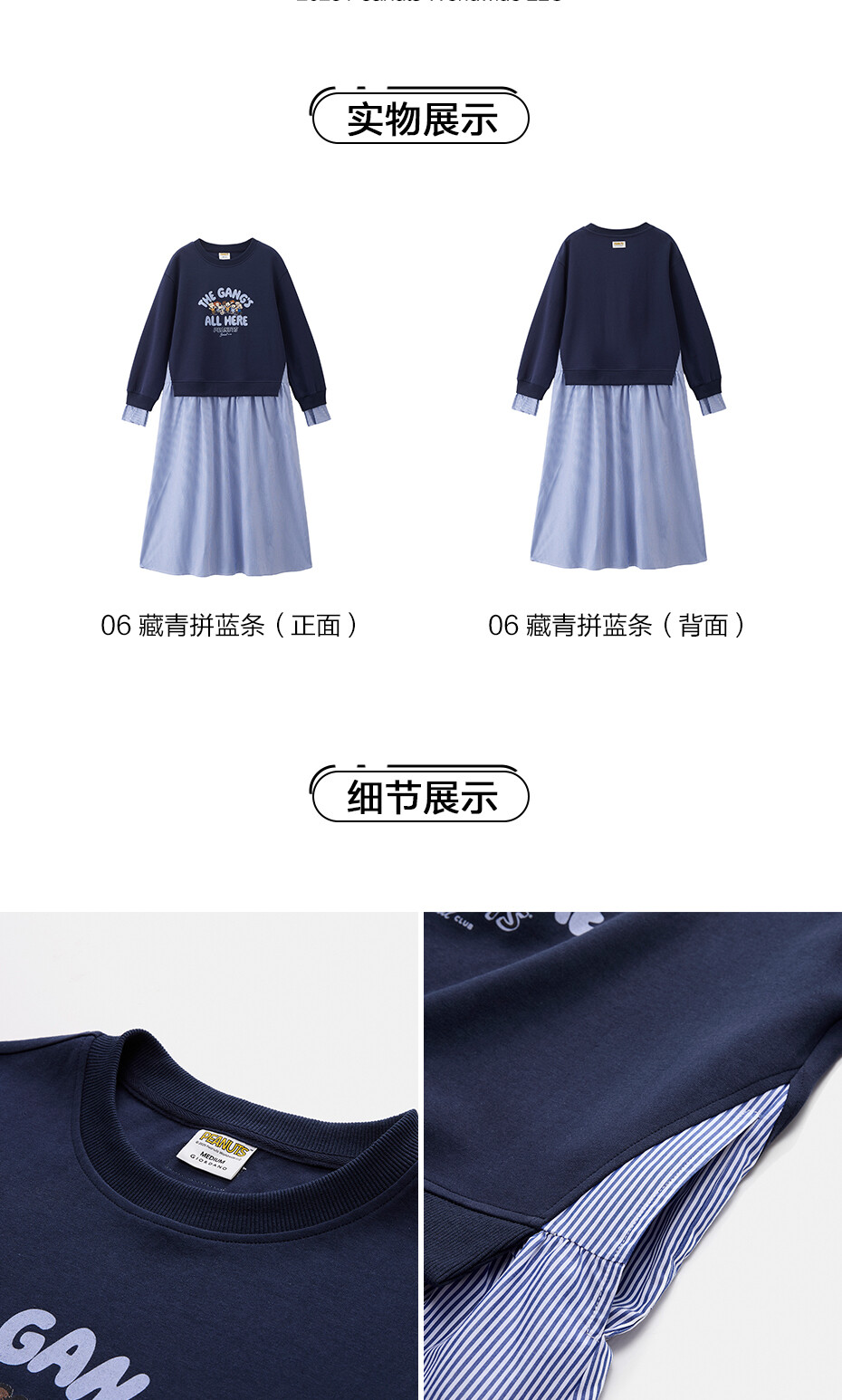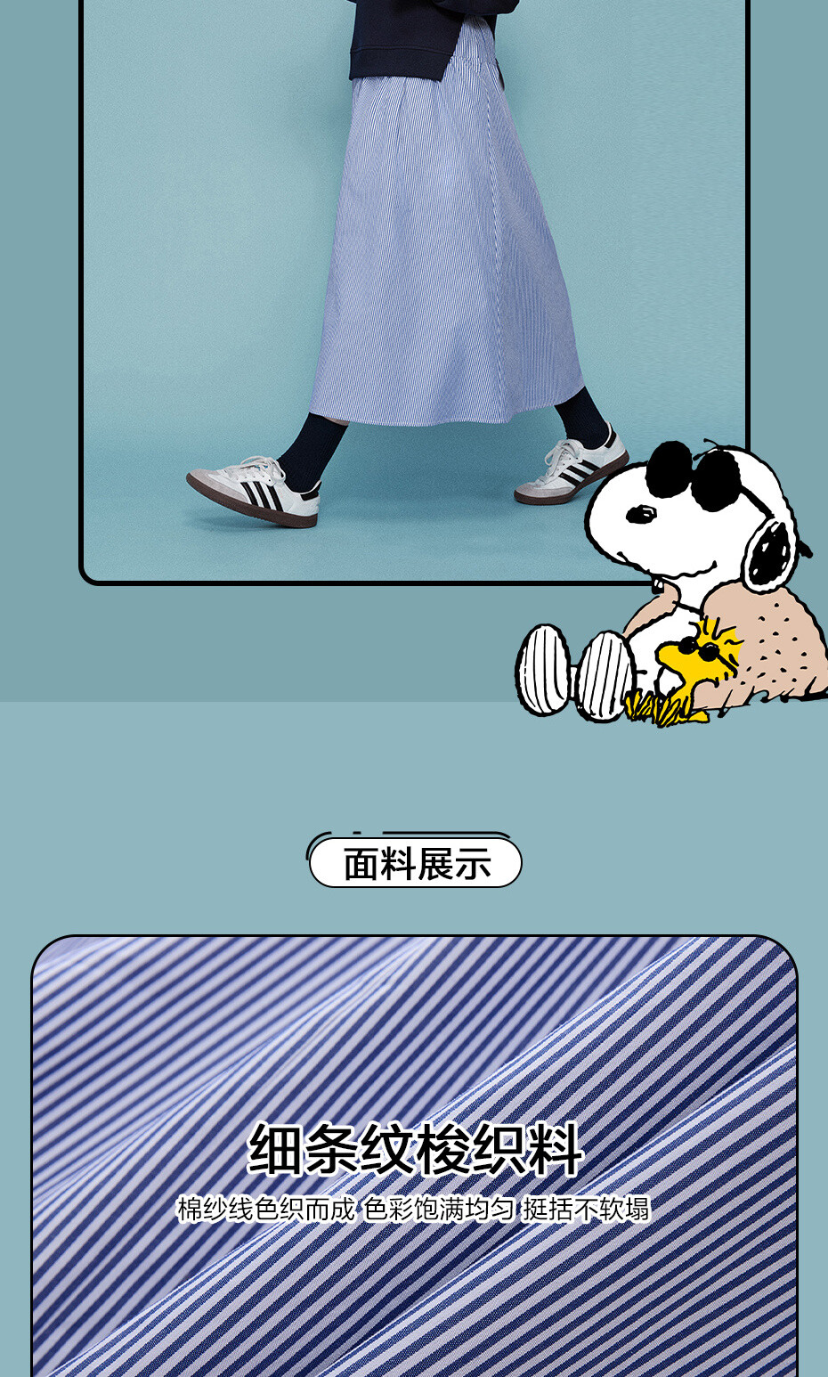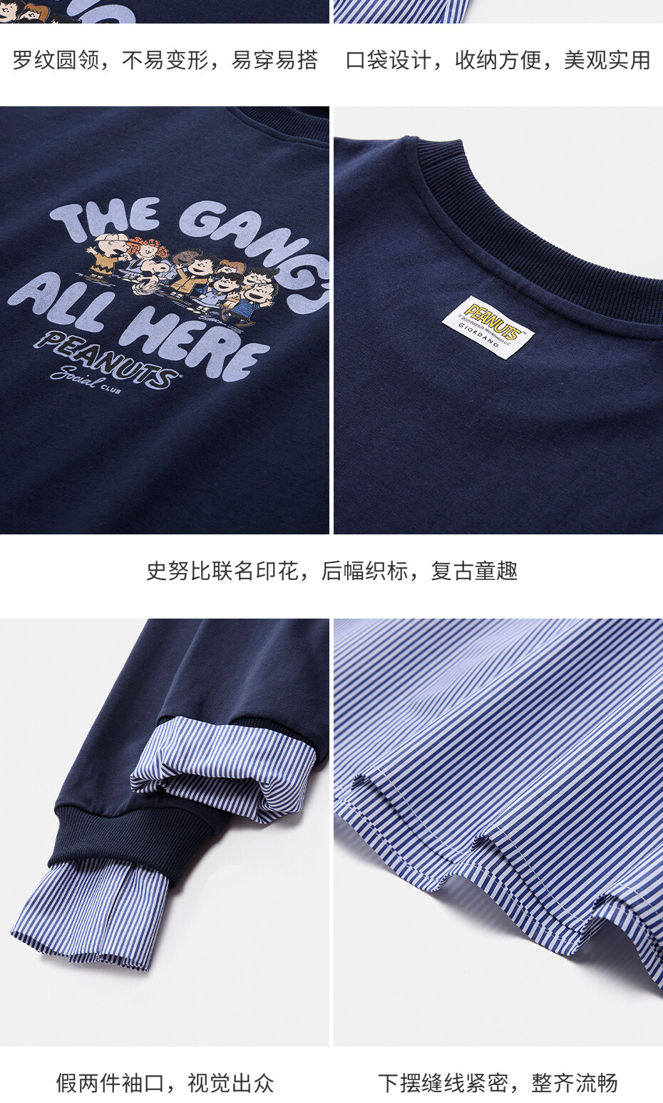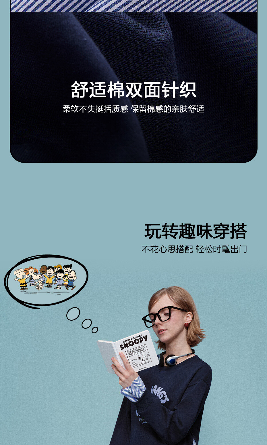 双面针织布,拼接细条纹梭织料,舒适耐穿;拼接假两件,层次十足,造型吸睛;史努比联名印花,后幅织标,复古童趣。温馨提示:此款面料成分为针织(82%棉 18%聚酯纤维)、梭织(70%棉 30%莱赛尔纤维)
