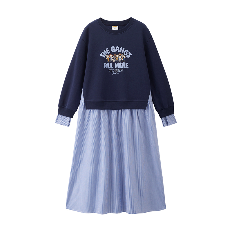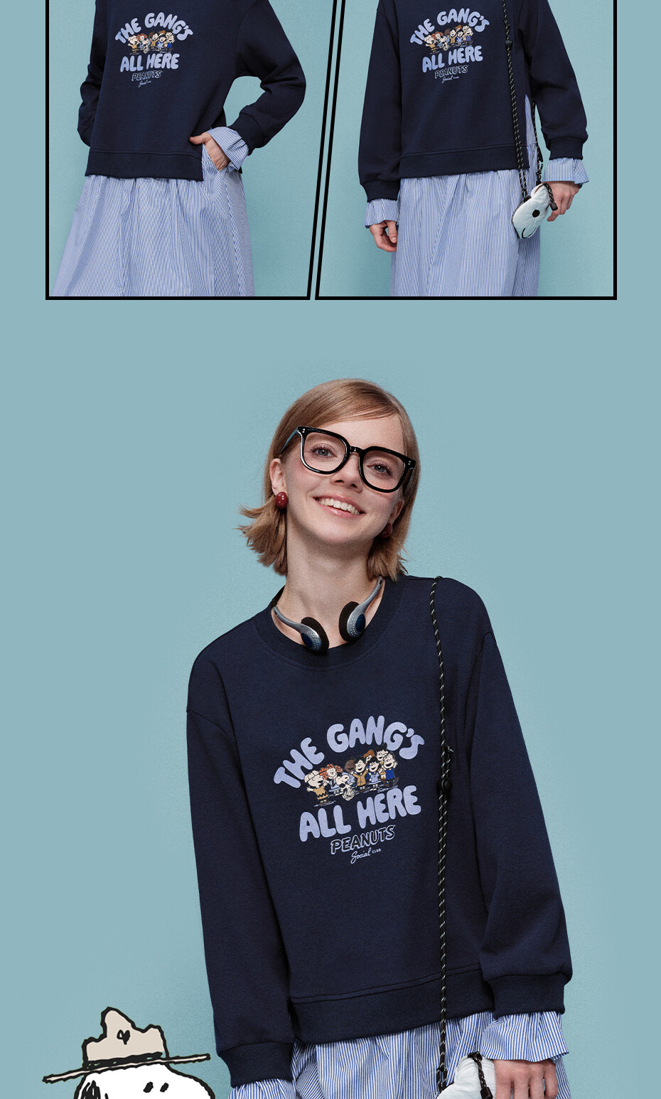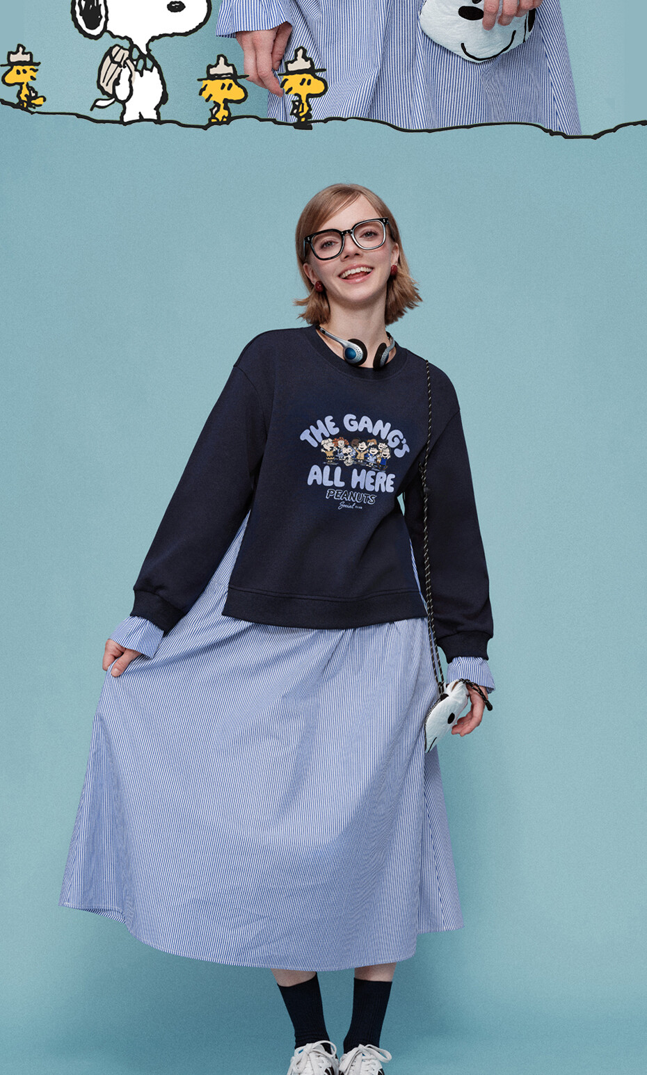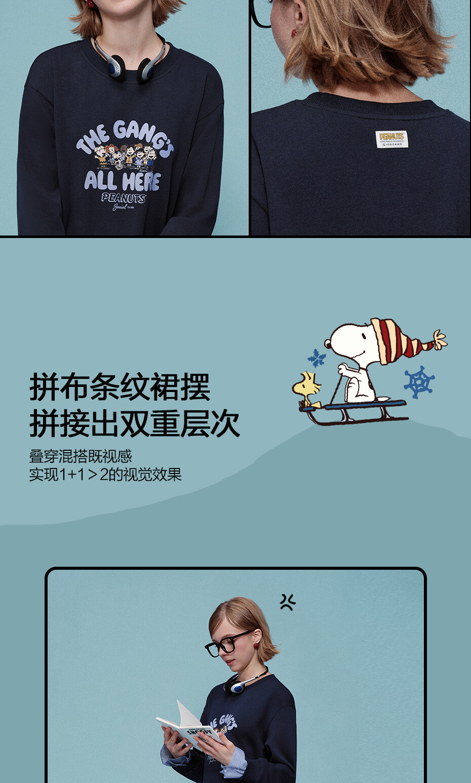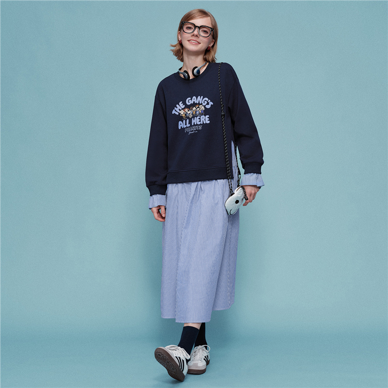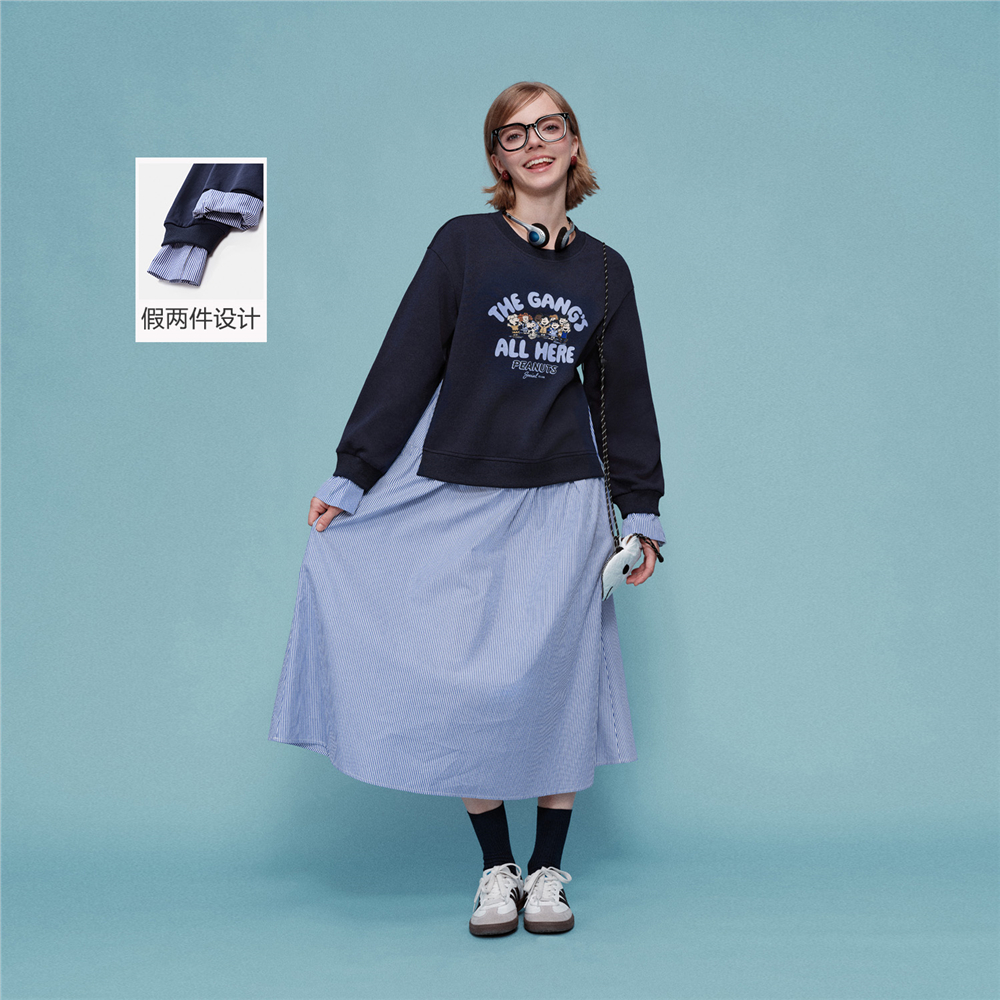 双面针织布,拼接细条纹梭织料,舒适耐穿;拼接假两件,层次十足,造型吸睛;史努比联名印花,后幅织标,复古童趣。温馨提示:此款面料成分为针织(82%棉 18%聚酯纤维)、梭织(70%棉 30%莱赛尔纤维)