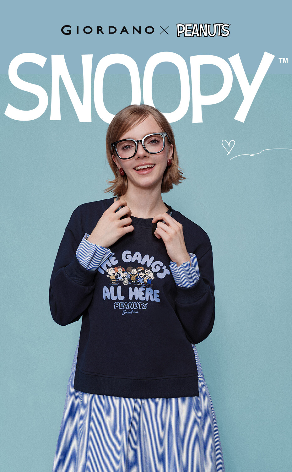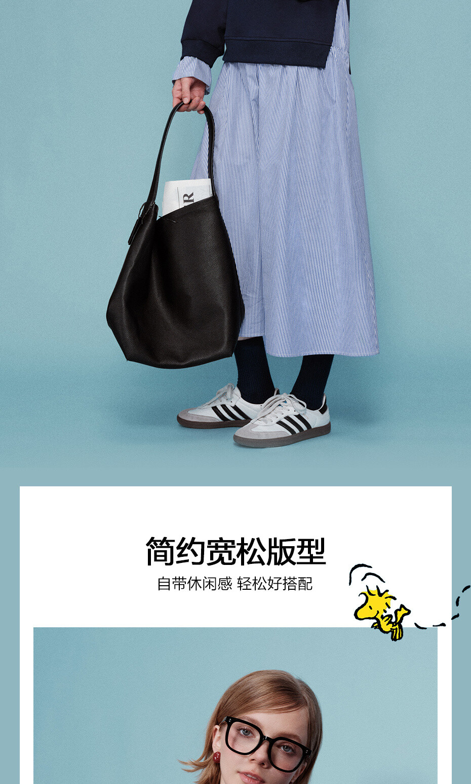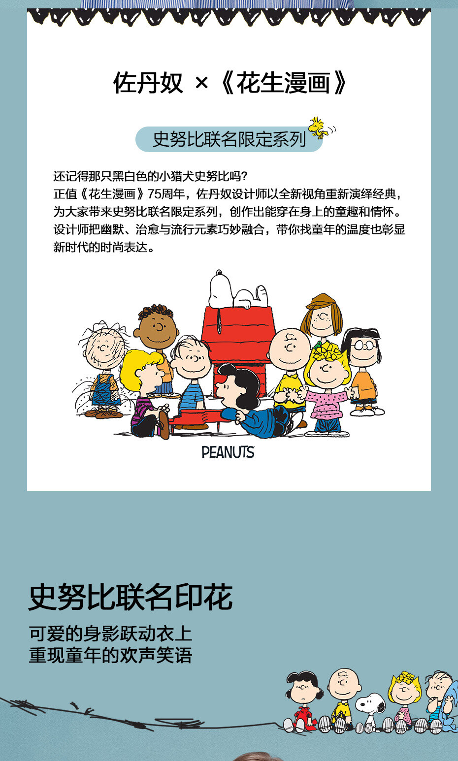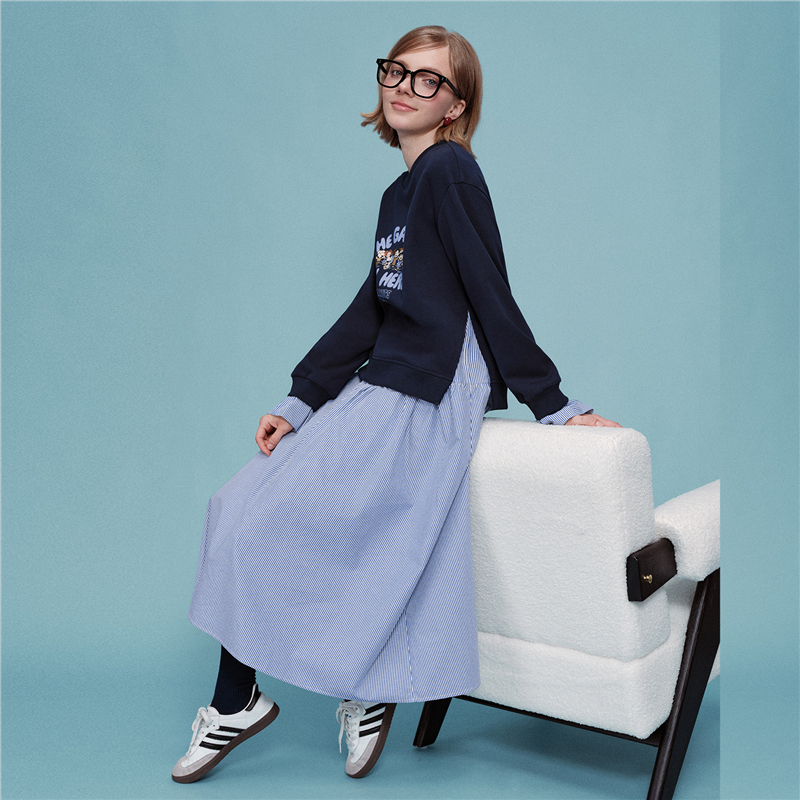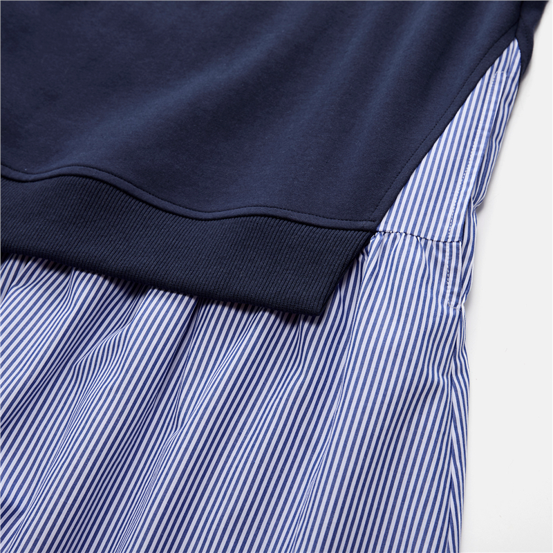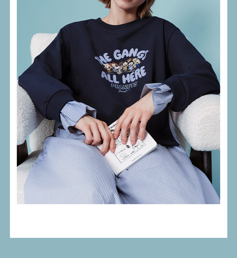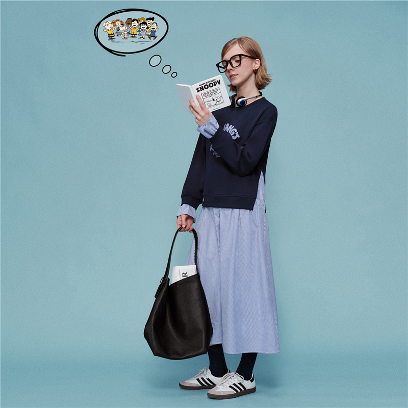 双面针织布,拼接细条纹梭织料,舒适耐穿;拼接假两件,层次十足,造型吸睛;史努比联名印花,后幅织标,复古童趣。温馨提示:此款面料成分为针织(82%棉 18%聚酯纤维)、梭织(70%棉 30%莱赛尔纤维)