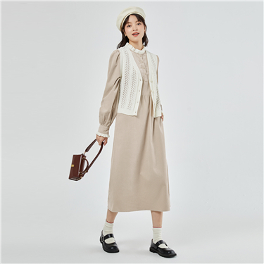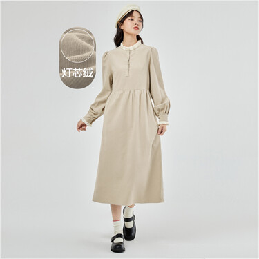 纯棉灯芯绒梭织蕾丝拼接立领连衣裙