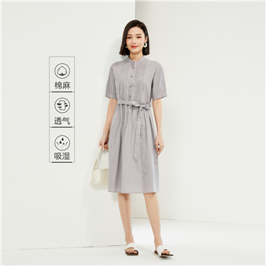 天然麻棉梭织绑带娃娃领薄衬衫连衣裙