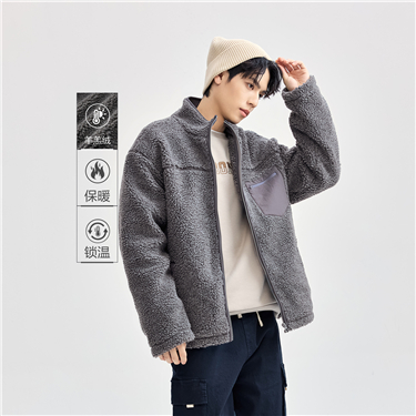 仿羊羔绒针梭织拼接口袋立领外套