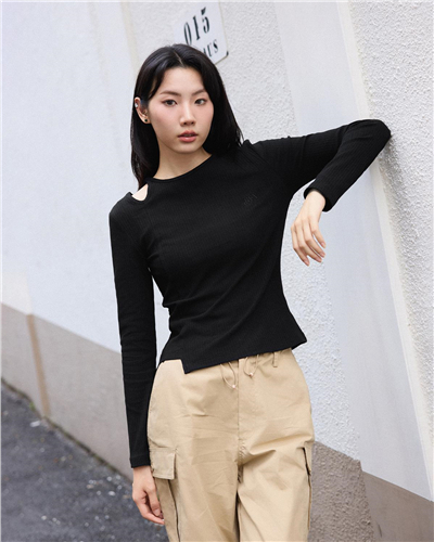 品牌刺绣露肩圆领修身针织长袖T恤
