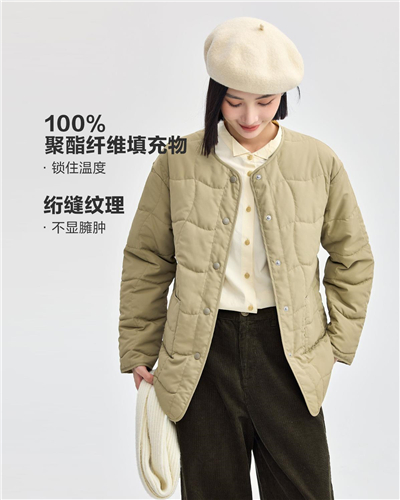 双口袋圆领格纹绗缝梭织棉衣外套