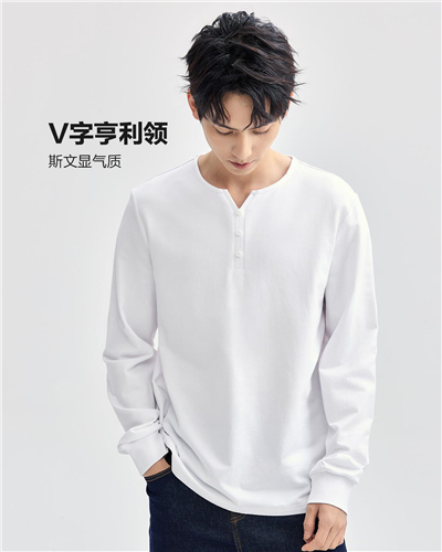 纯棉V字亨利领针织长袖T恤