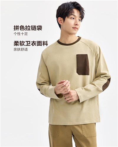 纯棉拼色拉链袋插肩针织圆领长袖T恤