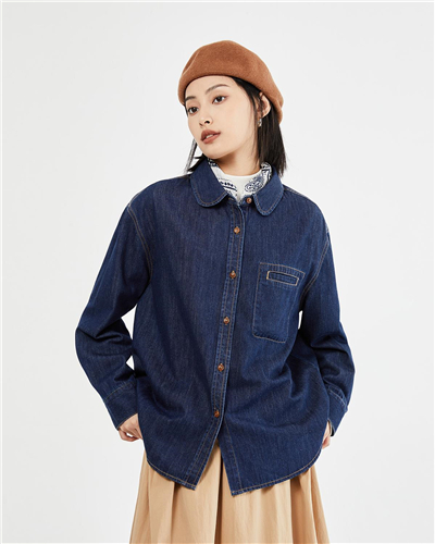 水洗牛仔木扣口袋圆角翻领宽松长袖衬衫