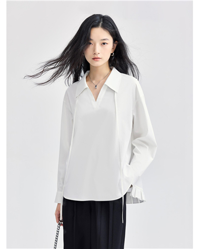 百褶后摆抽绳V字翻领梭织长袖衬衫