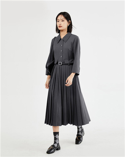 精纺西装梭织翻领七分袖百褶连衣裙